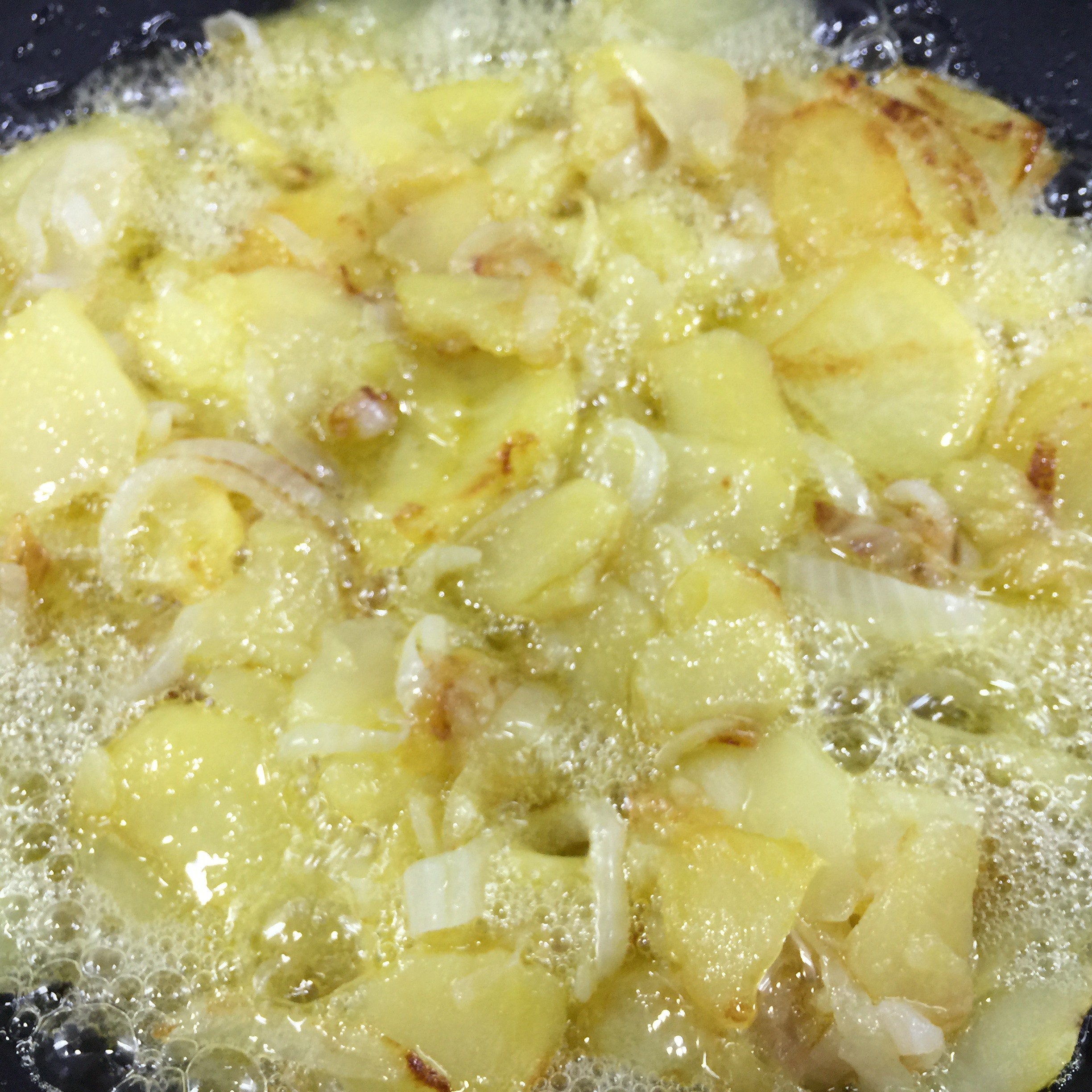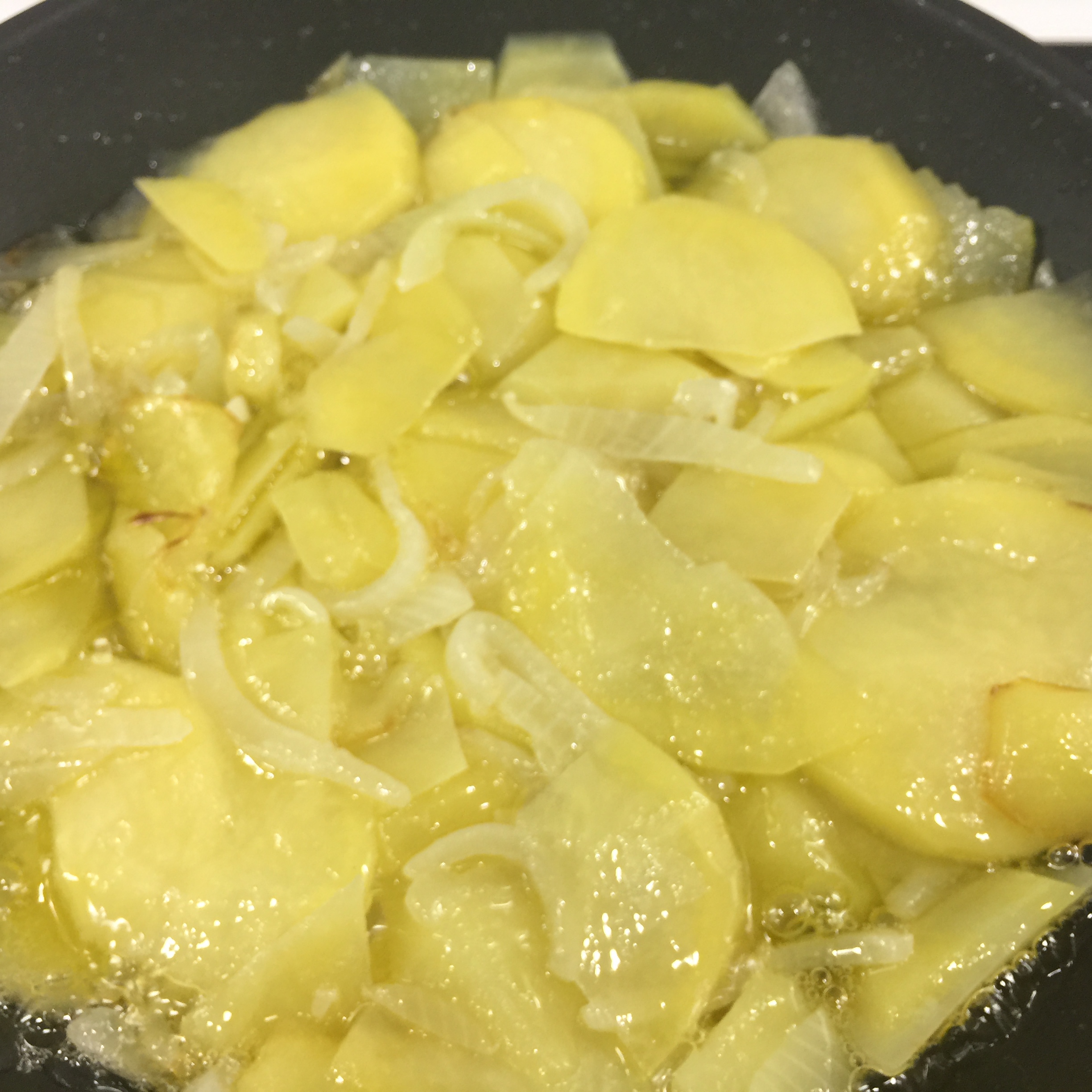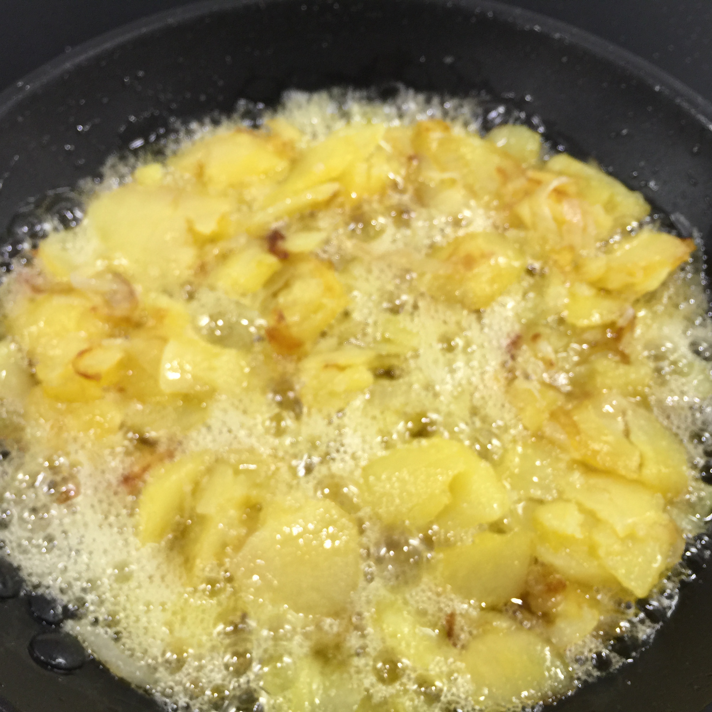 Iremos viendo como la patata se pone menos opaca que cuando la echamos. Cuando la patata se parte por la mitad sin dificultad y ya esta blanda le subimos el fuego porque no queremos que nos quede el interior como un puré, tiene que tener sus partes doraditas que, además, le dan un aspecto mejor a la tortilla una vez cuajada. Llegados a este punto no podemos distraernos porque se nos puede quemar parte de la patata si no estamos atentos.