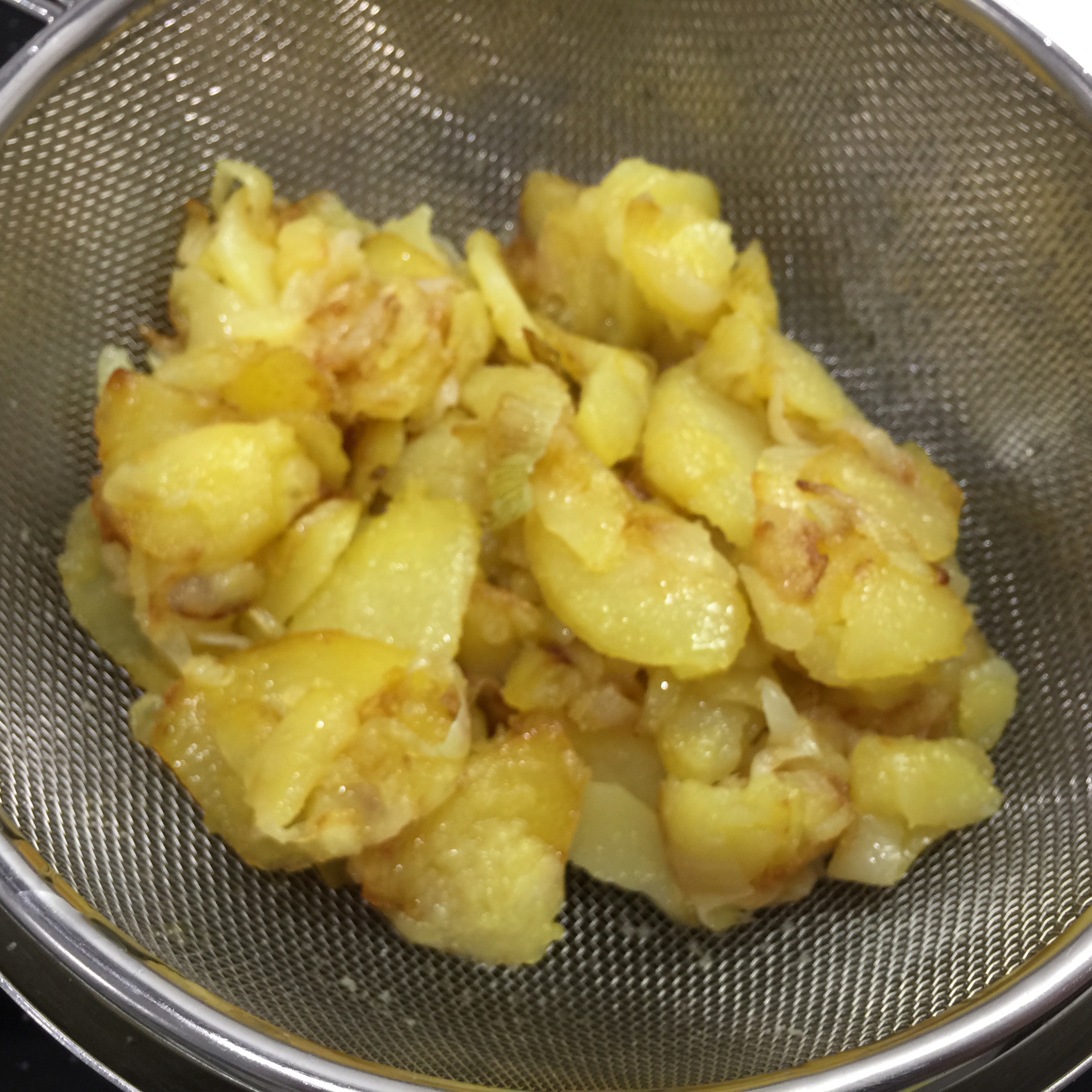Cuando la patata esté, la sacamos y la ponemos a escurrir, una vez escurrida le echamos sal, nunca antes de freírlas, y reservamos.