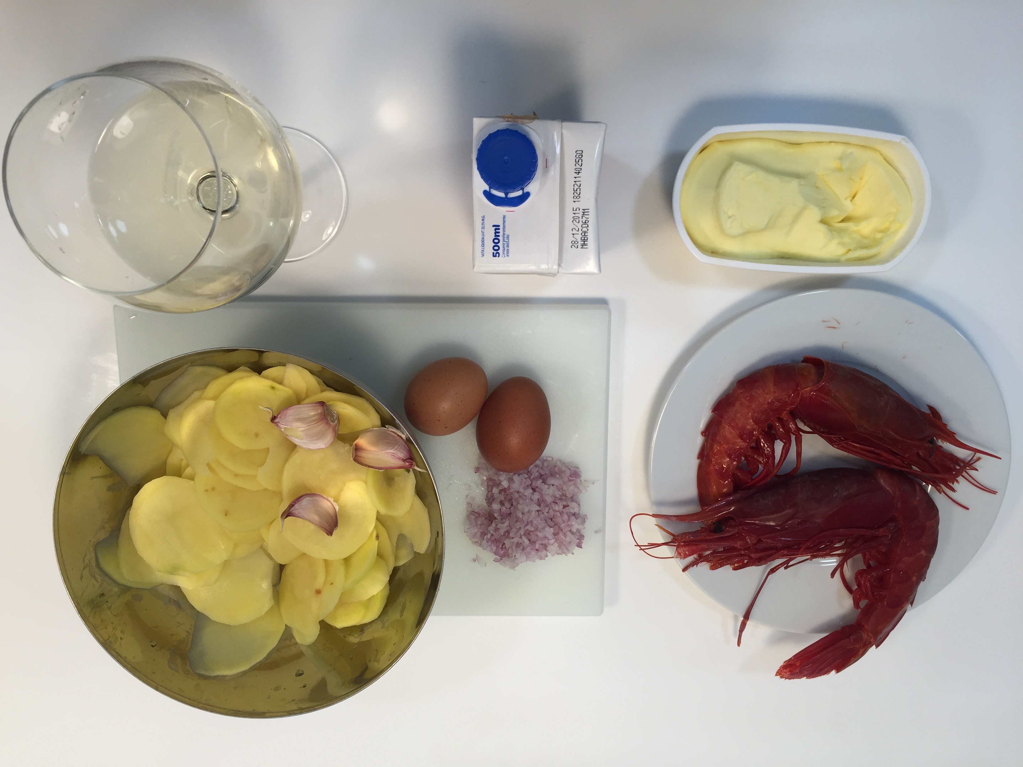 A continuación, ponemos una sartén y en ella salteamos las colas mientras montamos el plato, que está caliente y limpio. Finalmente, ponemos en el fondo la salsa, que debemos rectificar de sal y pimienta si hace falta, sobre ella las patatas fritas, encima los dos huevos y rematamos con las dos cabezas y las dos colas salteadas.