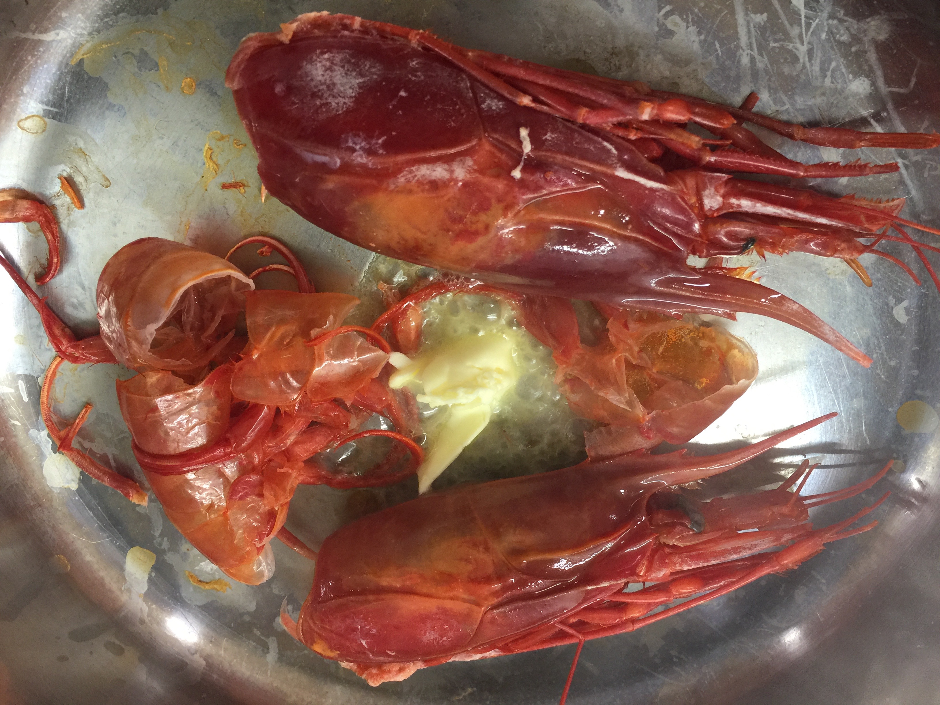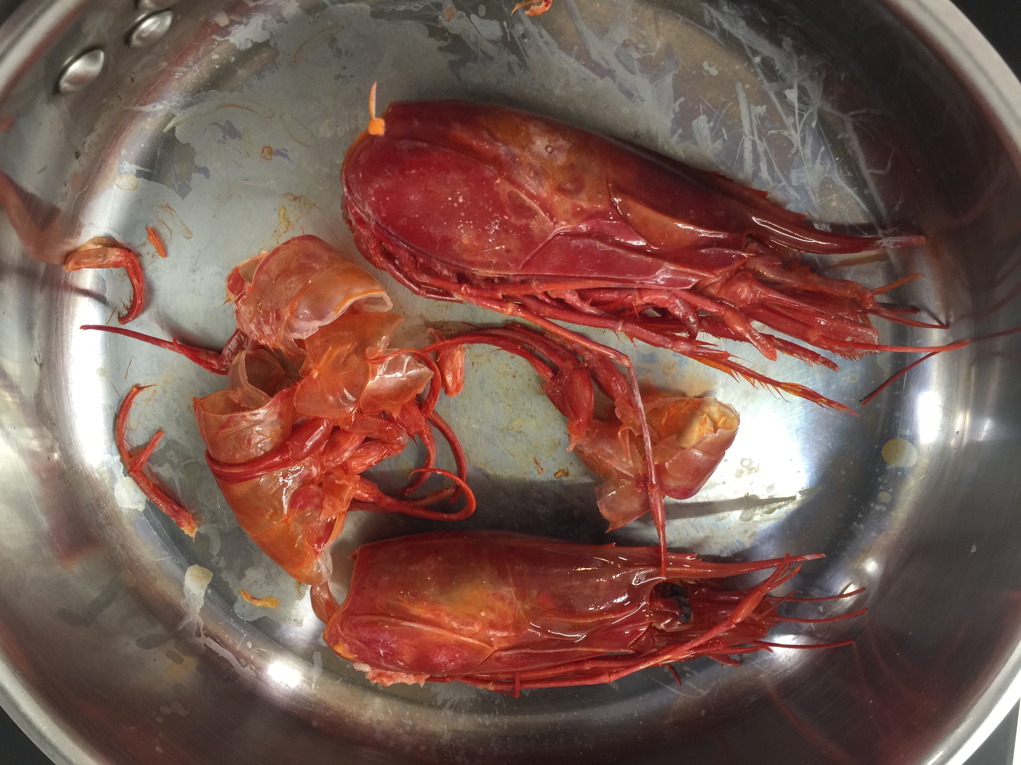 En cuanto a la preparación de los carabineros, separamos las cabezas de las colas y pelamos éstas, les eliminamos el intestino y las reservamos porque será lo que hagamos en el último momento.