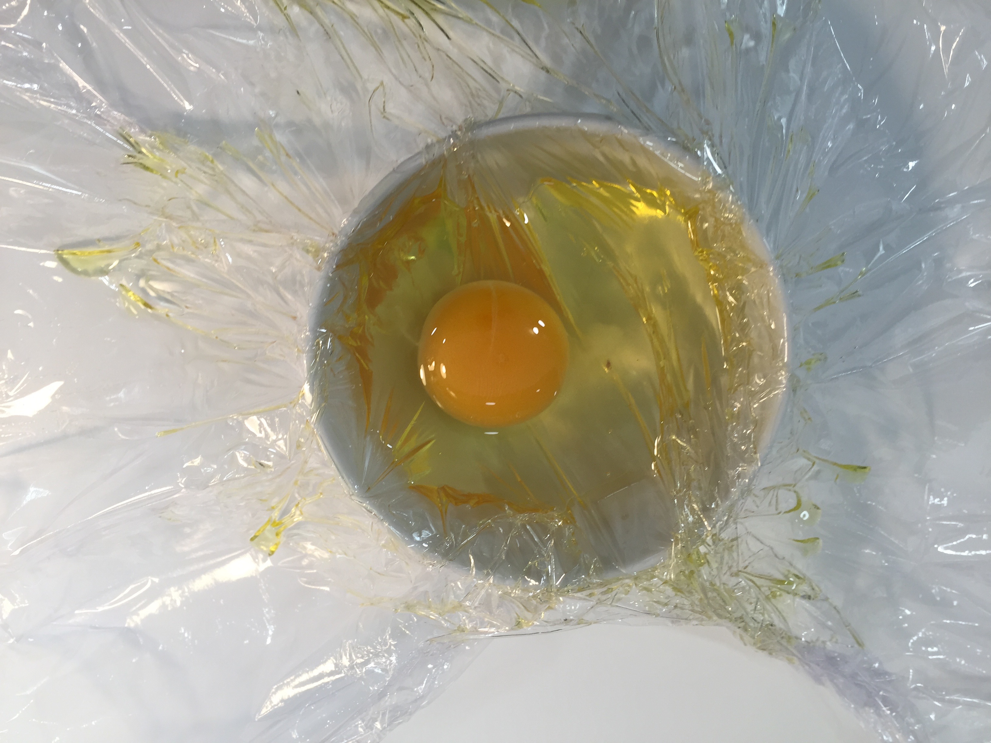 Todo esto se está haciendo a la vez, las patatas se fríen y la chalota se va haciendo. Entre tanto, pincelamos papel film con aceite y en su interior ponemos un huevo, así lo hacemos dos veces, tenemos agua casi hirviendo, introducimos el papel film con el huevo en su interior, éste se nos irá al fondo dejando al borde parte del papel y los tendremos 4 ó 5 minutos, dependiendo del tamaño del huevo, transcurrido ese tiempo, los sacamos y empezamos a preparar topo para el emplatado.