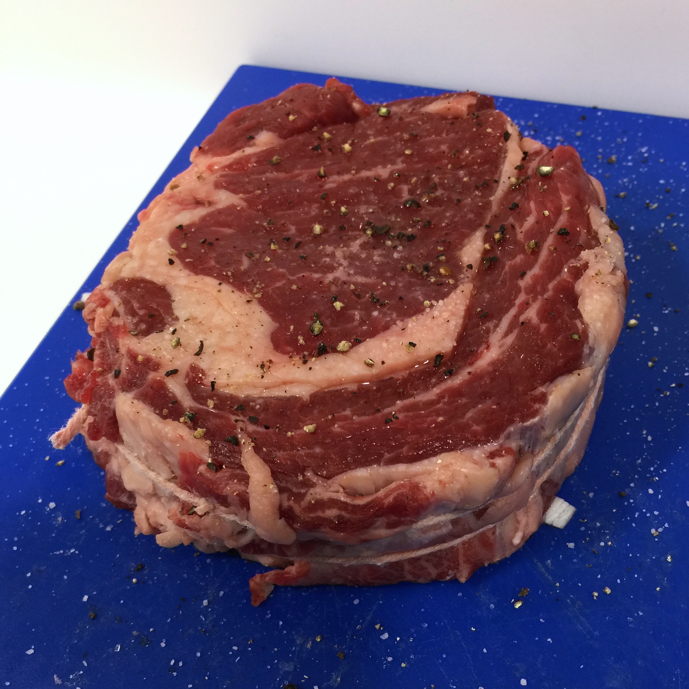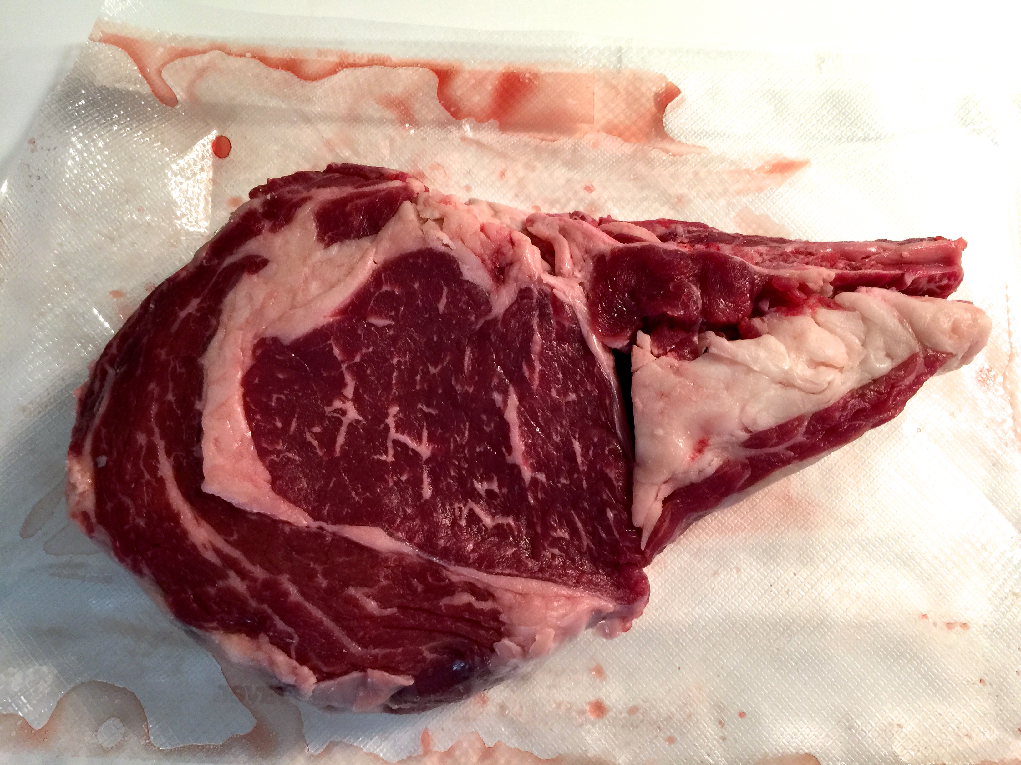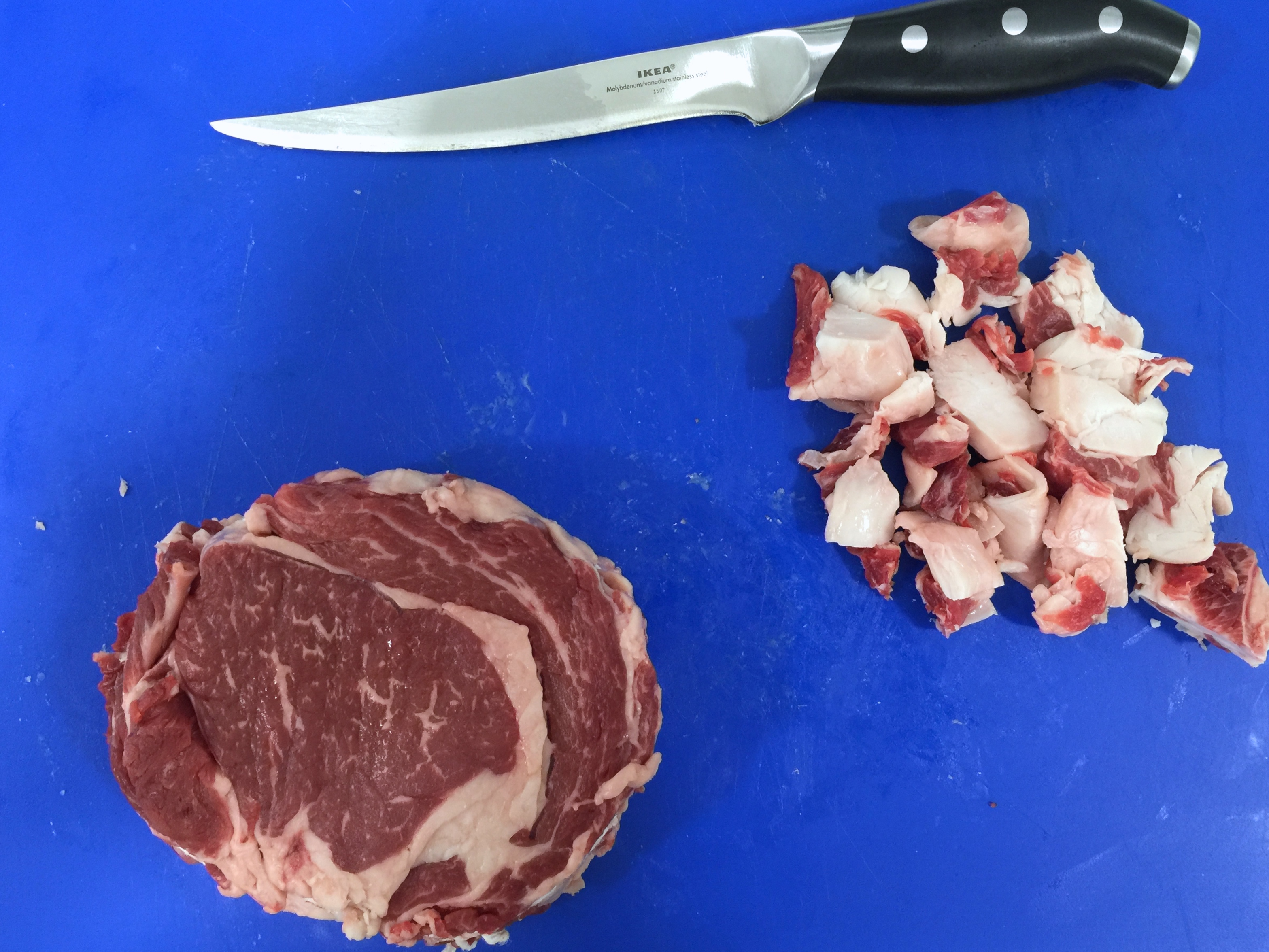 Precalentamos el horno a 180º, sacamos el entrecot, al que le hemos eliminado el hueso, y le retiramos la grasa sobrante y las partes menos magras que recortaremos y utilizaremos para la elaboración de nuestra salsa. Cada pieza pesará, una vez limpia, 500 gr.