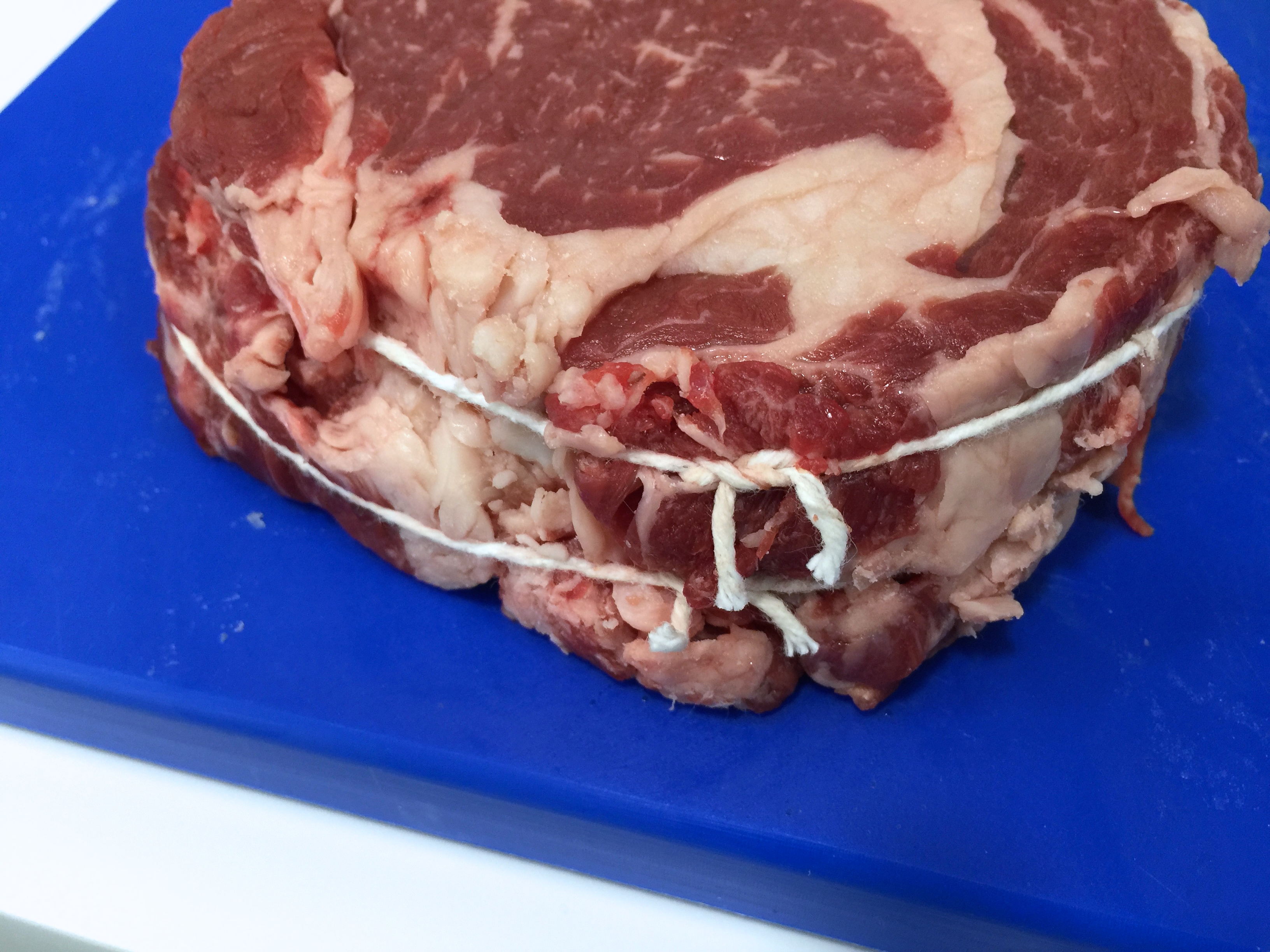 Le damos forma redonda y la bridamos con cordel para mantener esa forma y que nos quede una pieza más uniforme y fácil de cortar para emplatar después. Si no lo hiciéramos, como la grasa, la carne y las zonas tendinosas tienen distinta densidad y comportamiento al calor, se nos deformaría.