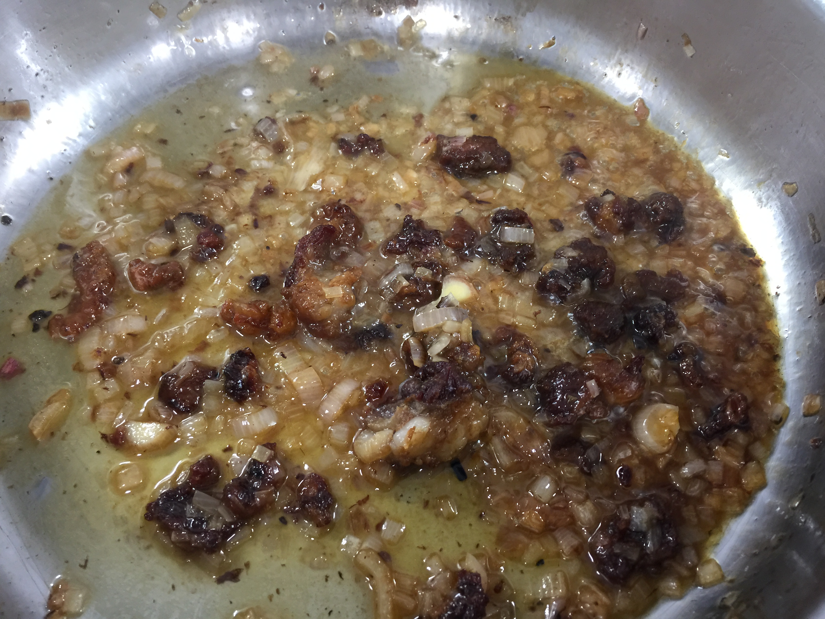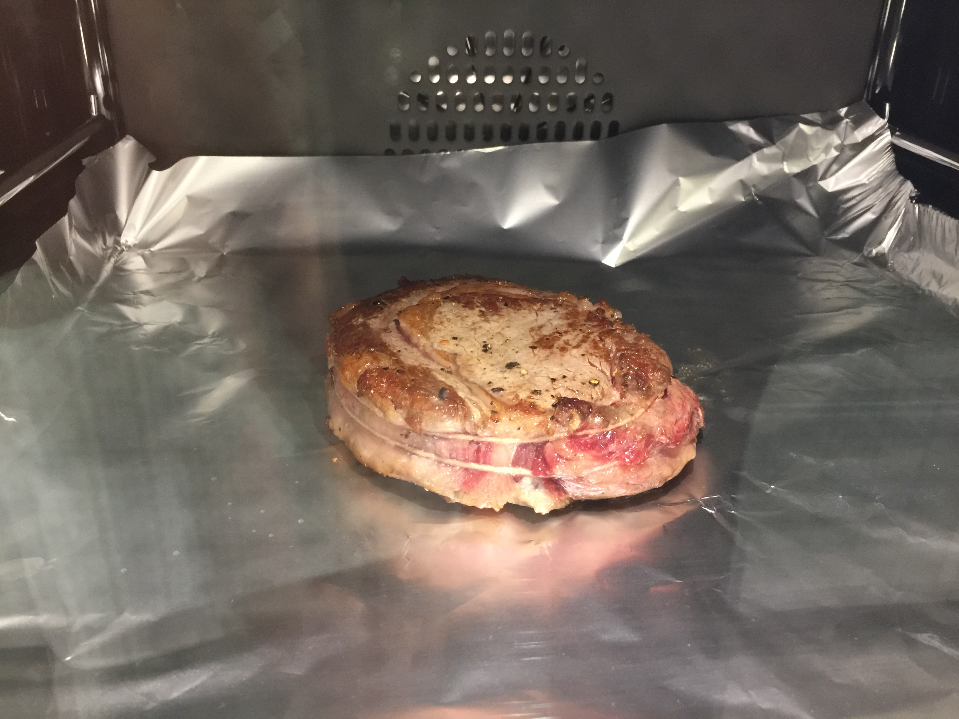 Cuando esté todo listo, ponemos los recortes del entrecot en un recipiente no demasiado grande al fuego y los salteamos. Estos desprenderán grasa que luego eliminaremos, pero antes, y para aprovechar todo, sellaremos la carne sobre esa misma grasa a fuego muy fuerte y por ambos lados. Una vez sellada, la ponemos en la bandeja del horno y la tendremos entre 12 y 20 minutos, dependiendo del grueso de la pieza y del punto de la carne. En este caso, la tuve durante 15 minutos.
