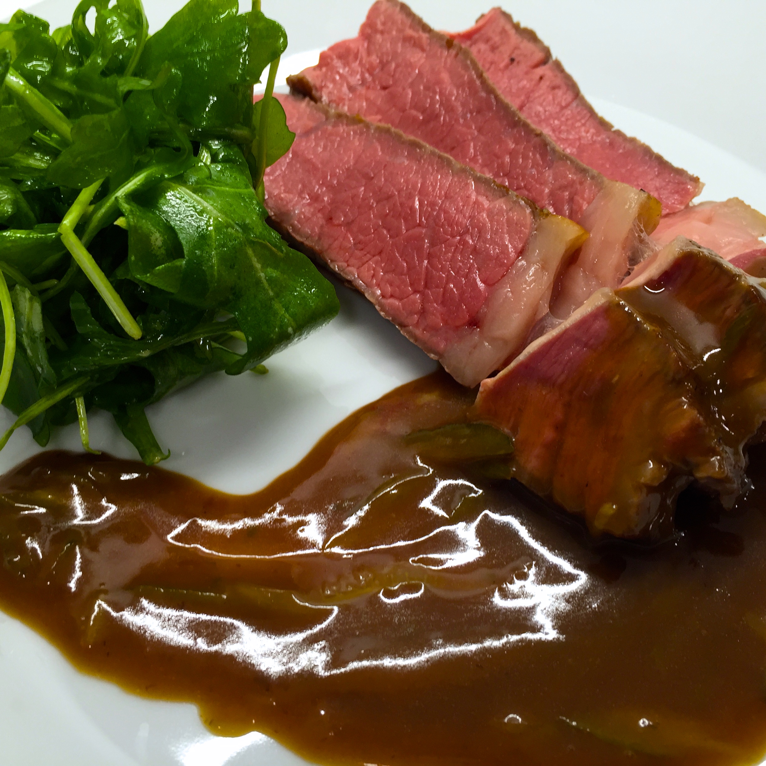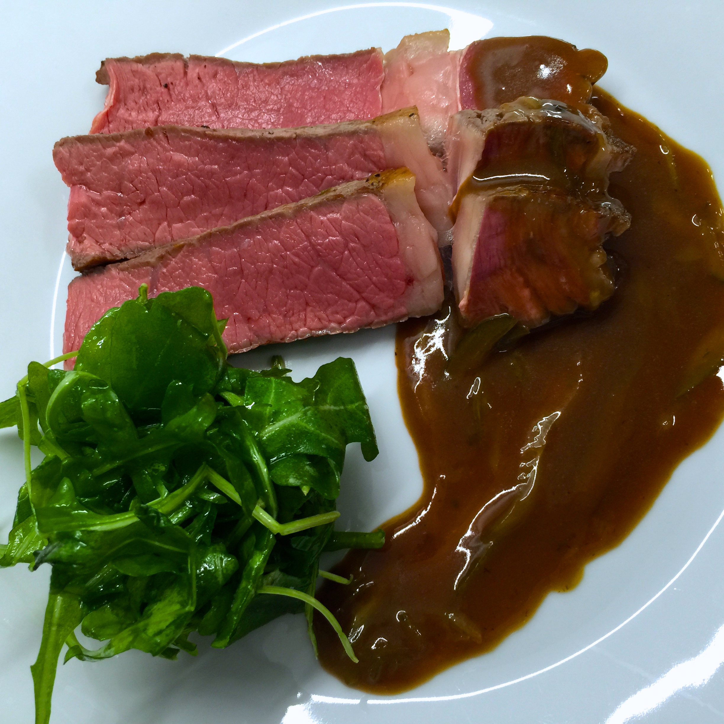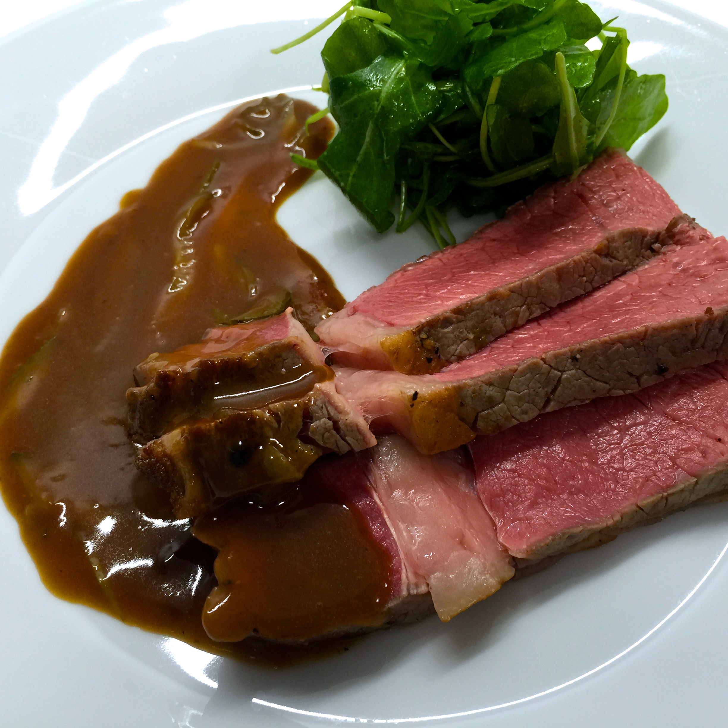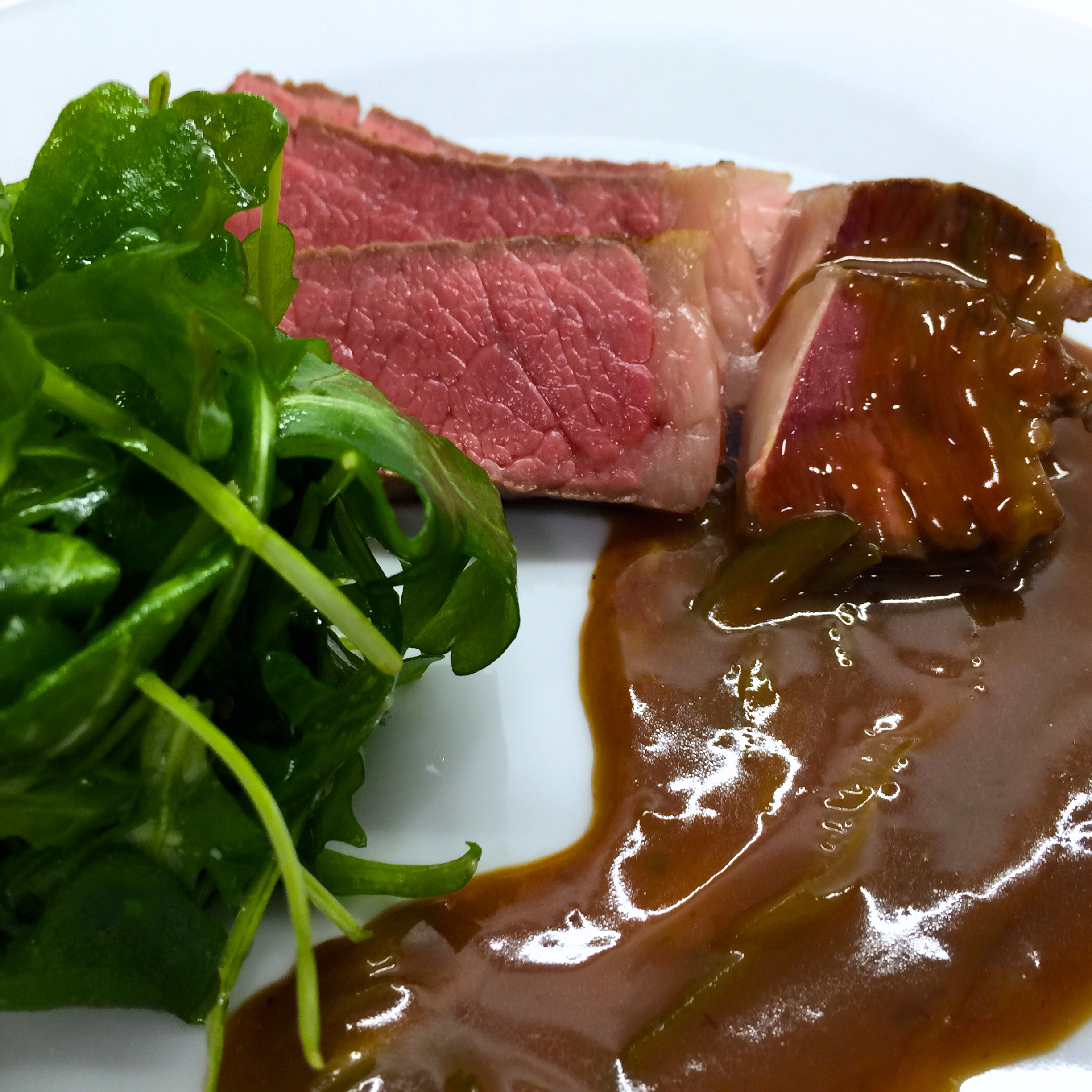 Para emplatar, cortamos el entrecot fileteado con un ángulo de 60º y colocamos.