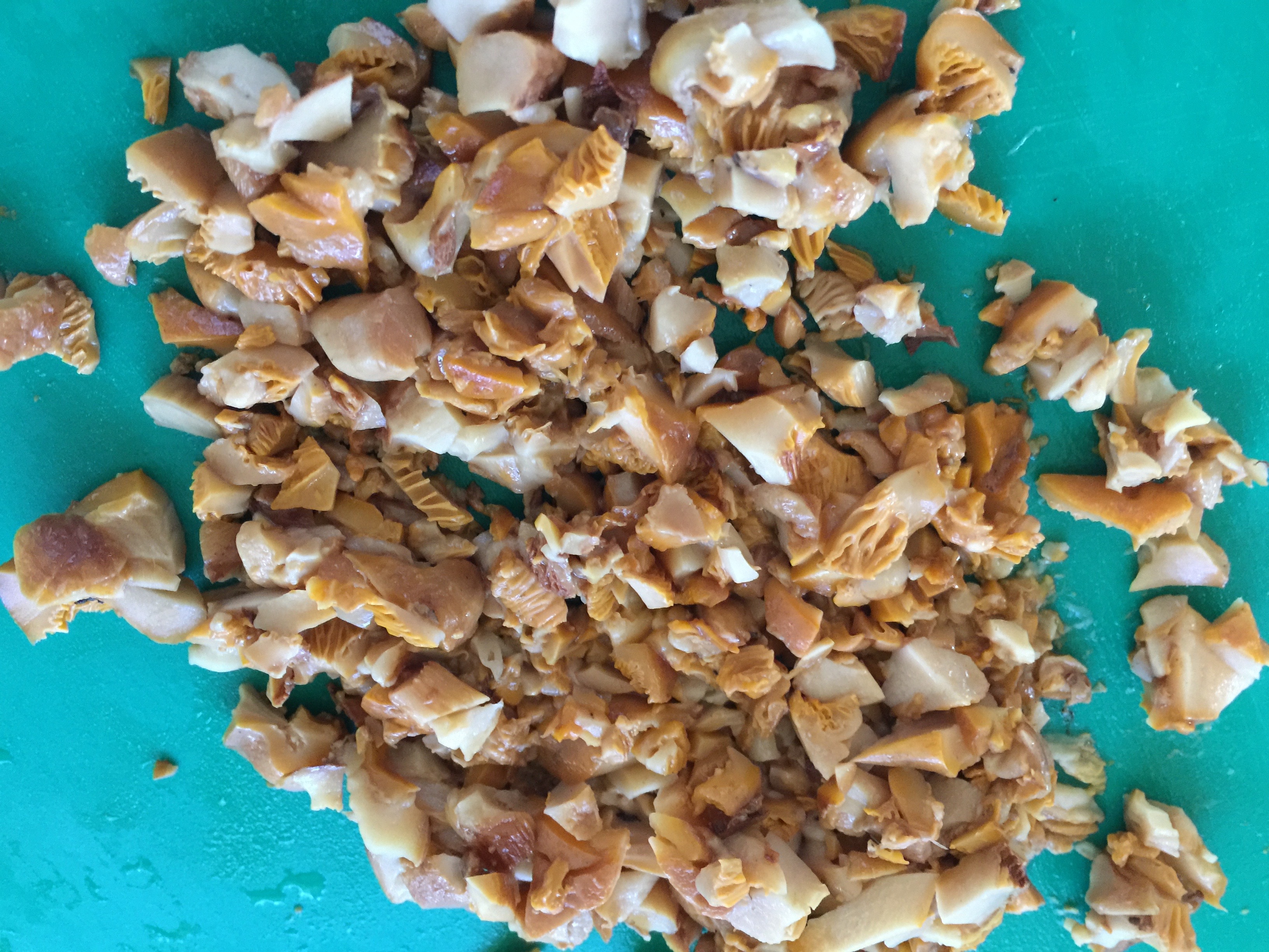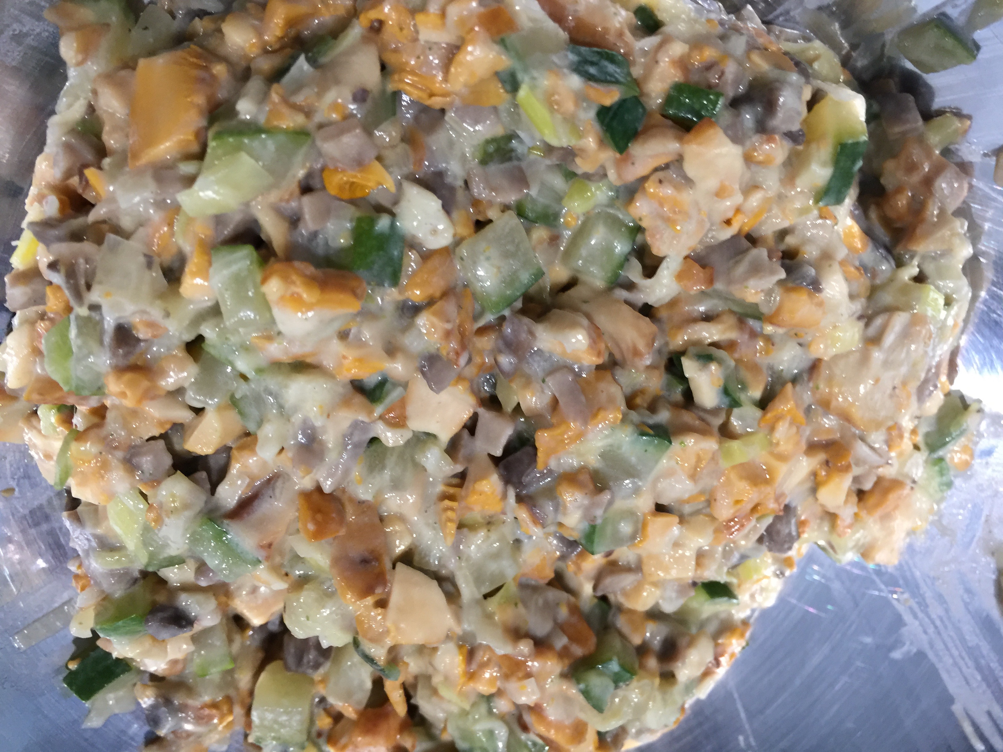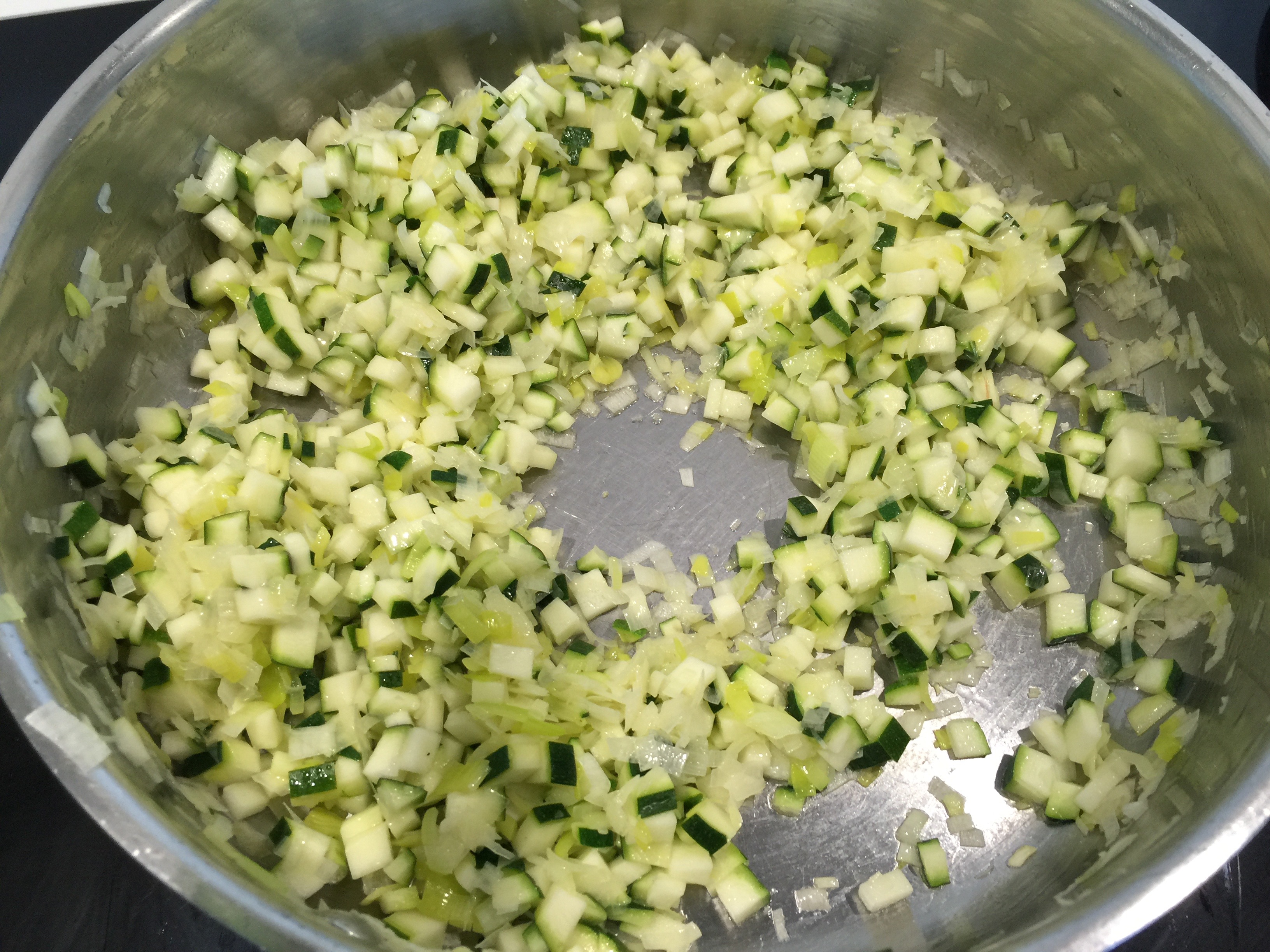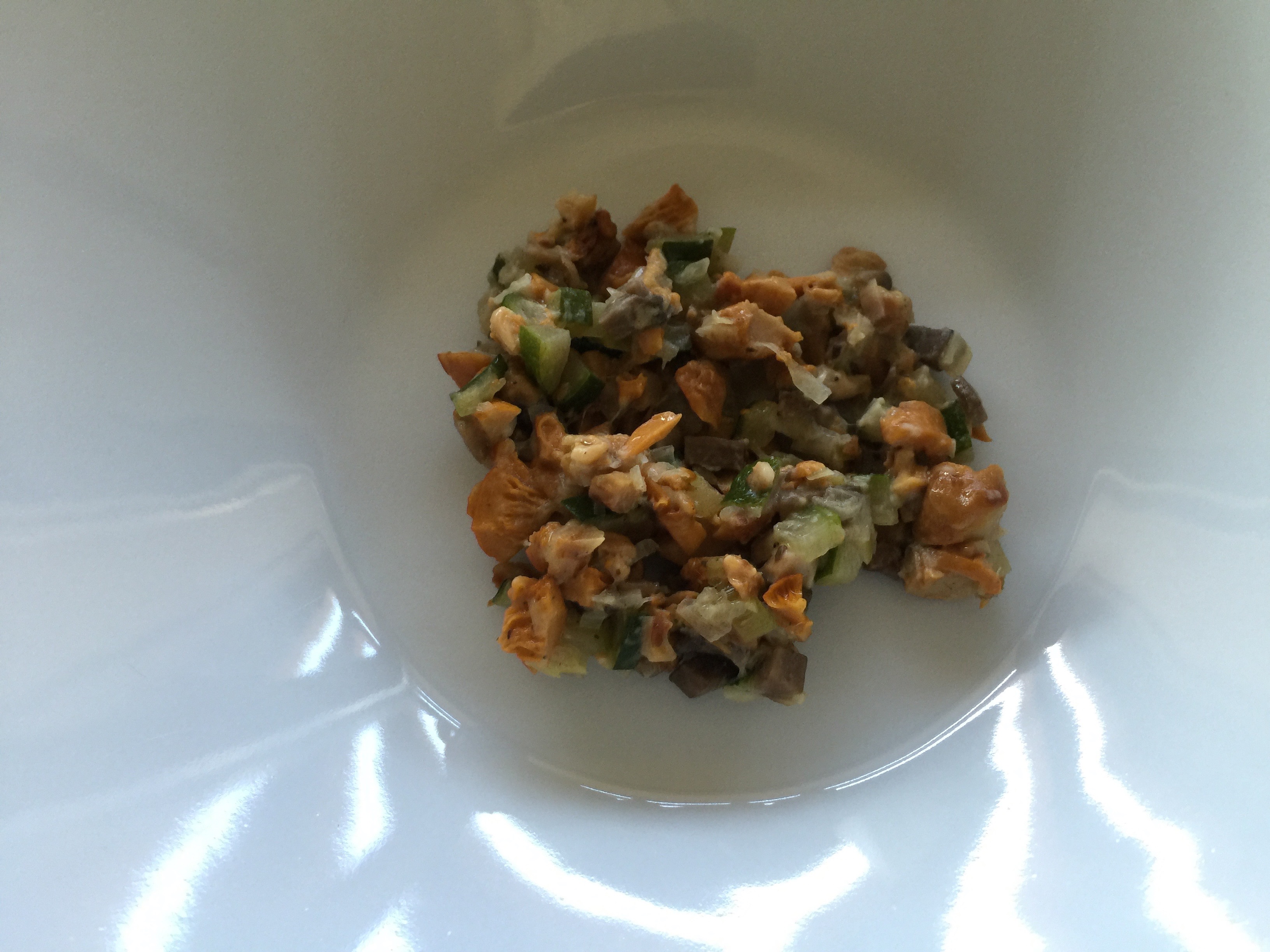 Relleno : Picamos emincer el puerro, lo más fino posible y lo ponemos a sudar con la mantequilla y una pizca de sal. Mientras tanto, lavamos y cortamos el calabacín en dados de menos de 1 cm de ancho eliminando la zona central del calabacín y sin pelar, los echamos a sudar con el puerro y tapamos unos 5 minutos, le incorporamos entonces el champiñón lavado y cortado en dados de 0,5 cm, tapamos 5 minutos y, pasado este tiempo, destapamos y subimos el fuego para que se evapore el líquido sin dejar de vigilar y mover. Una vez seco, añadimos la nata y dejamos a fuego flojo otros 5 minutos.