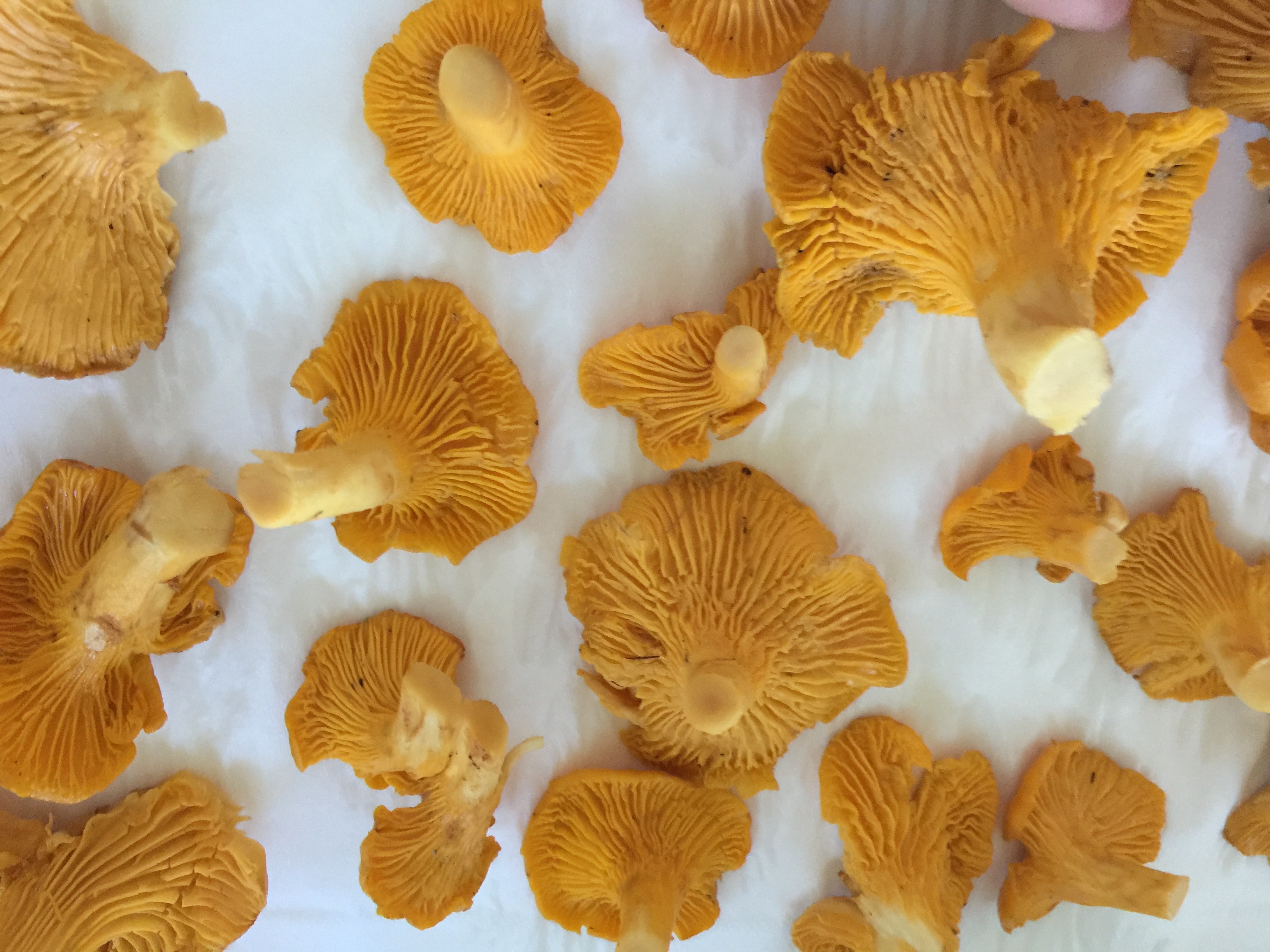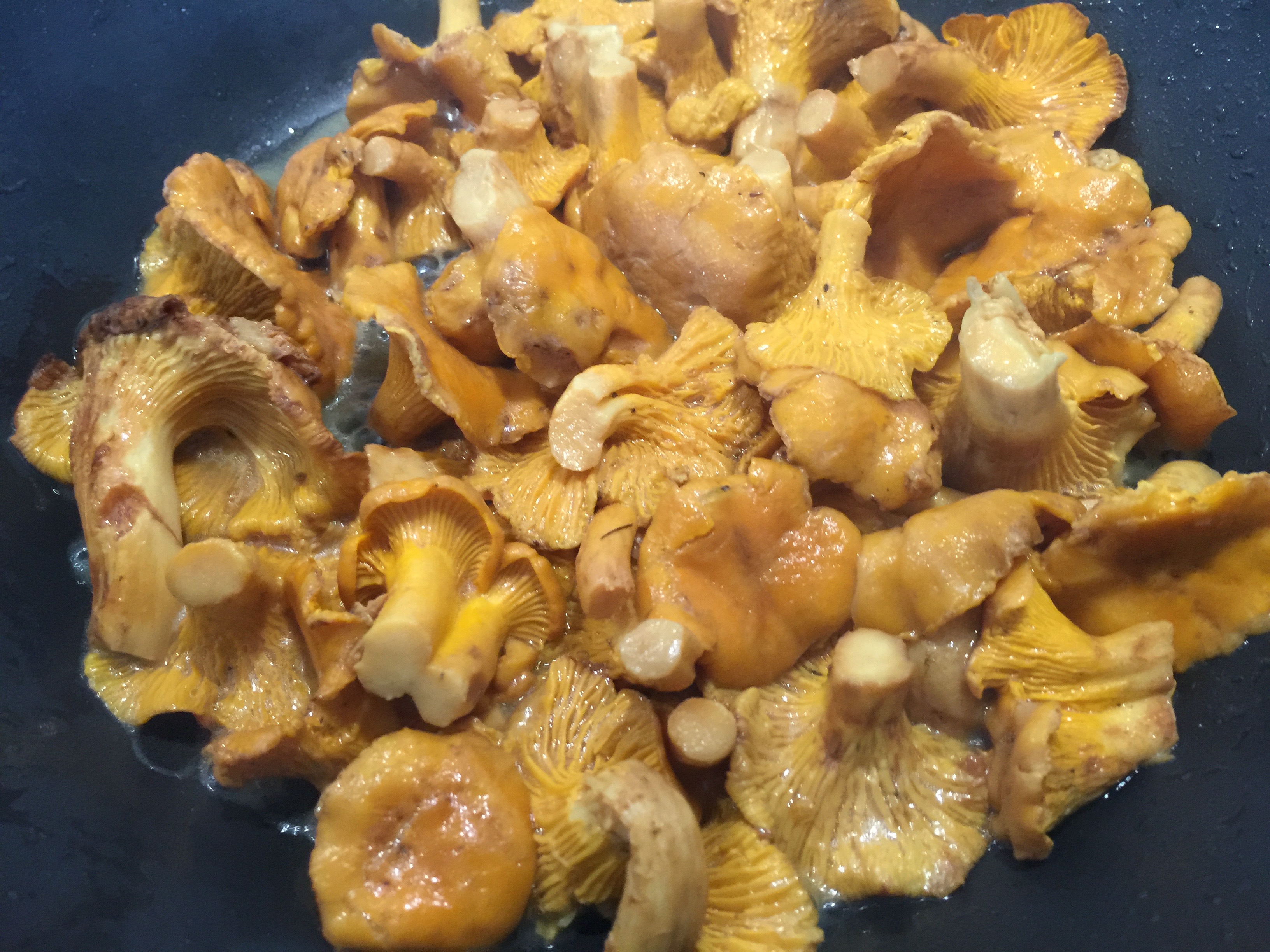 A continuación, lavamos y secamos las chantarelas en una sartén, las salteamos con mantequilla unos 5 minutos a fuego fuerte y, sin dejar de mover, las retiramos y dejamos enfriar. Seguidamente, retiramos un tercio de las mismas, las más vistosas, para la decoración y el resto las picamos y mezclamos con el calabacín y el champiñon. Sazonamos al gusto. Además, reservamos unas chantarelas que estén enteras para el emplatado. Crema de calabacín y parmesano: Picamos el calabacín y lo ponemos en un cazo con la leche a fuego lento hasta que se ablande. Rallamos el parmesano, lo añadimos a la mezcla, lo trituramos hasta que esté suave y espumoso, aunque también podemos pasarlo por un chino, sazonamos y lo mantenemos caliente.