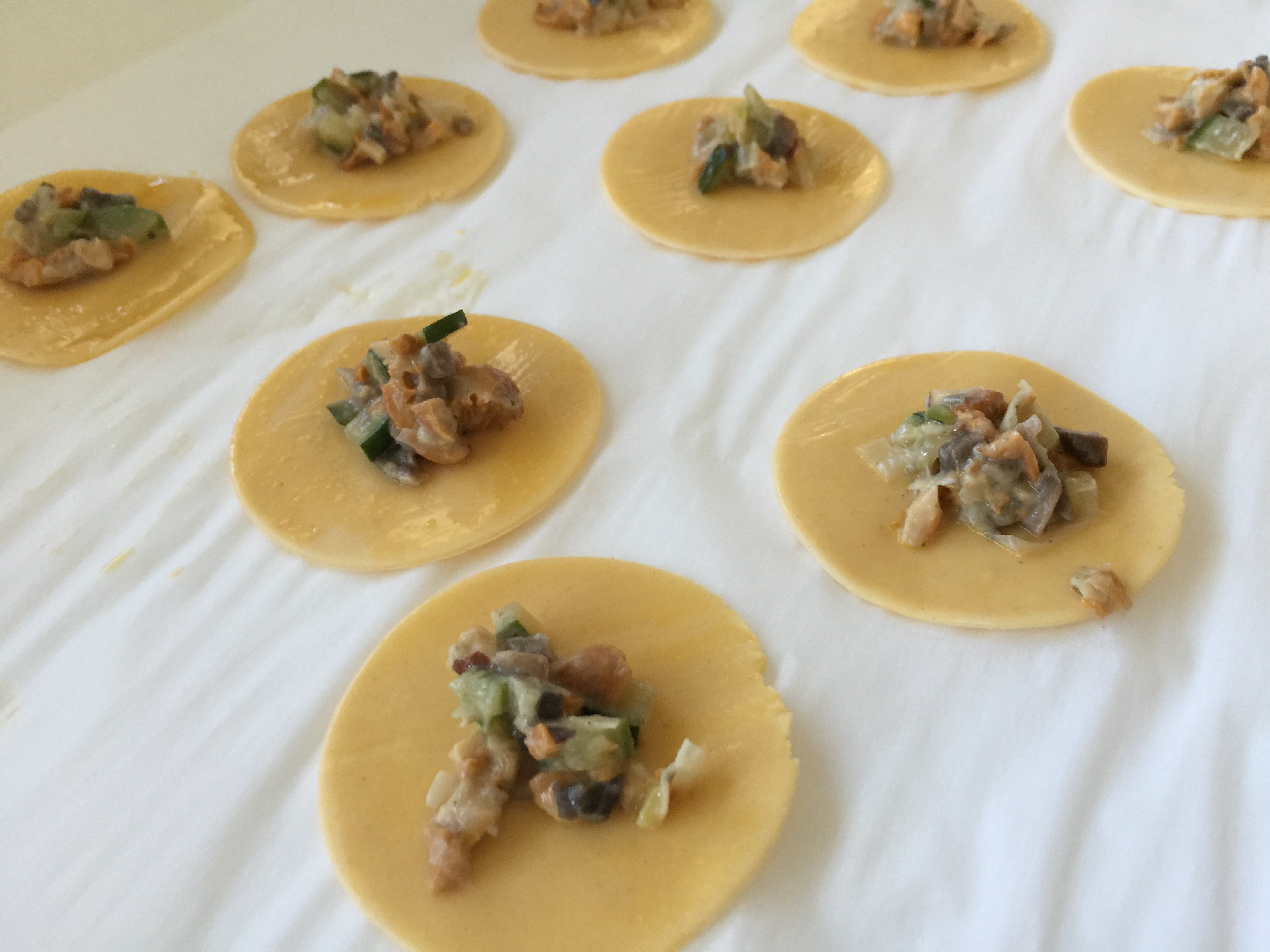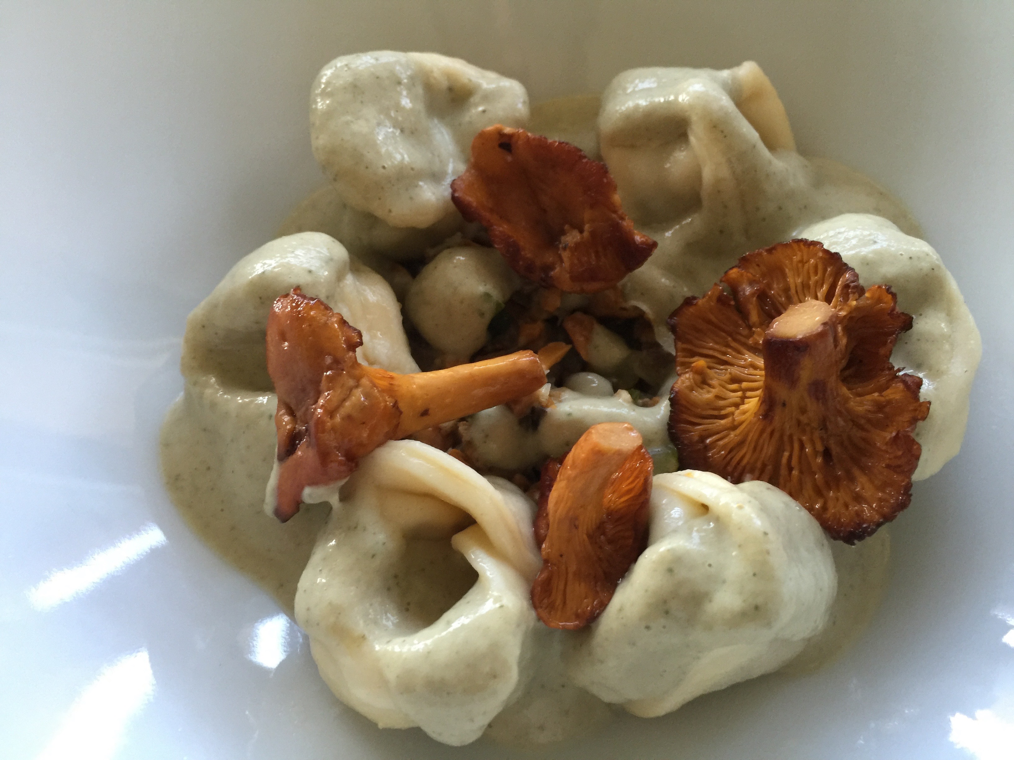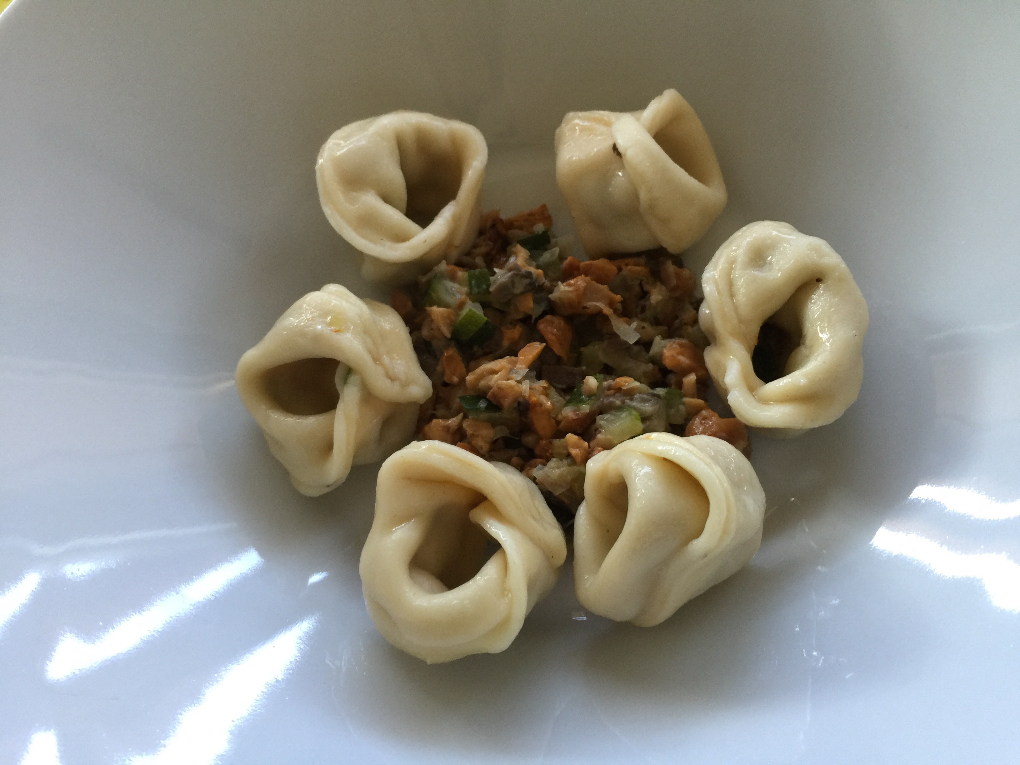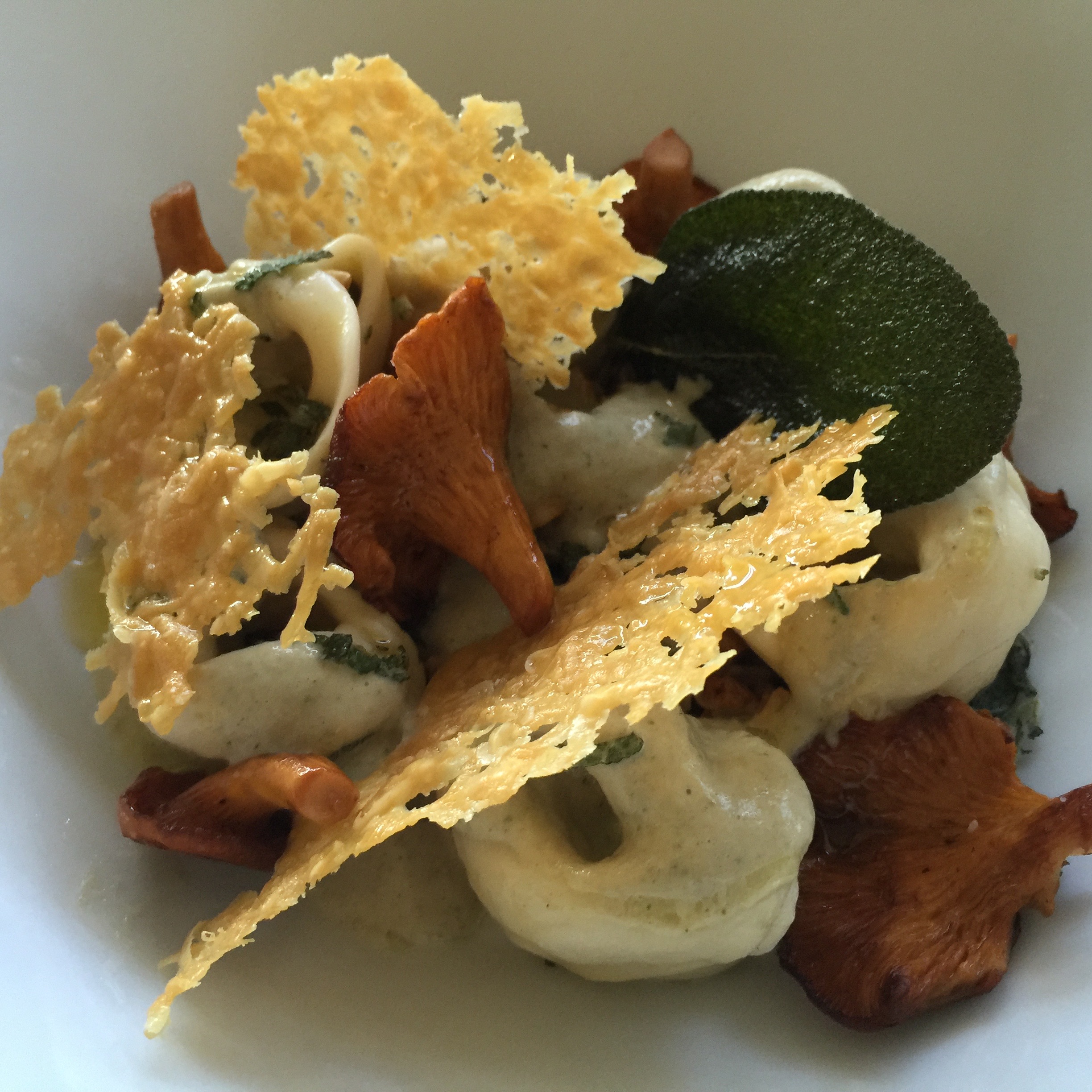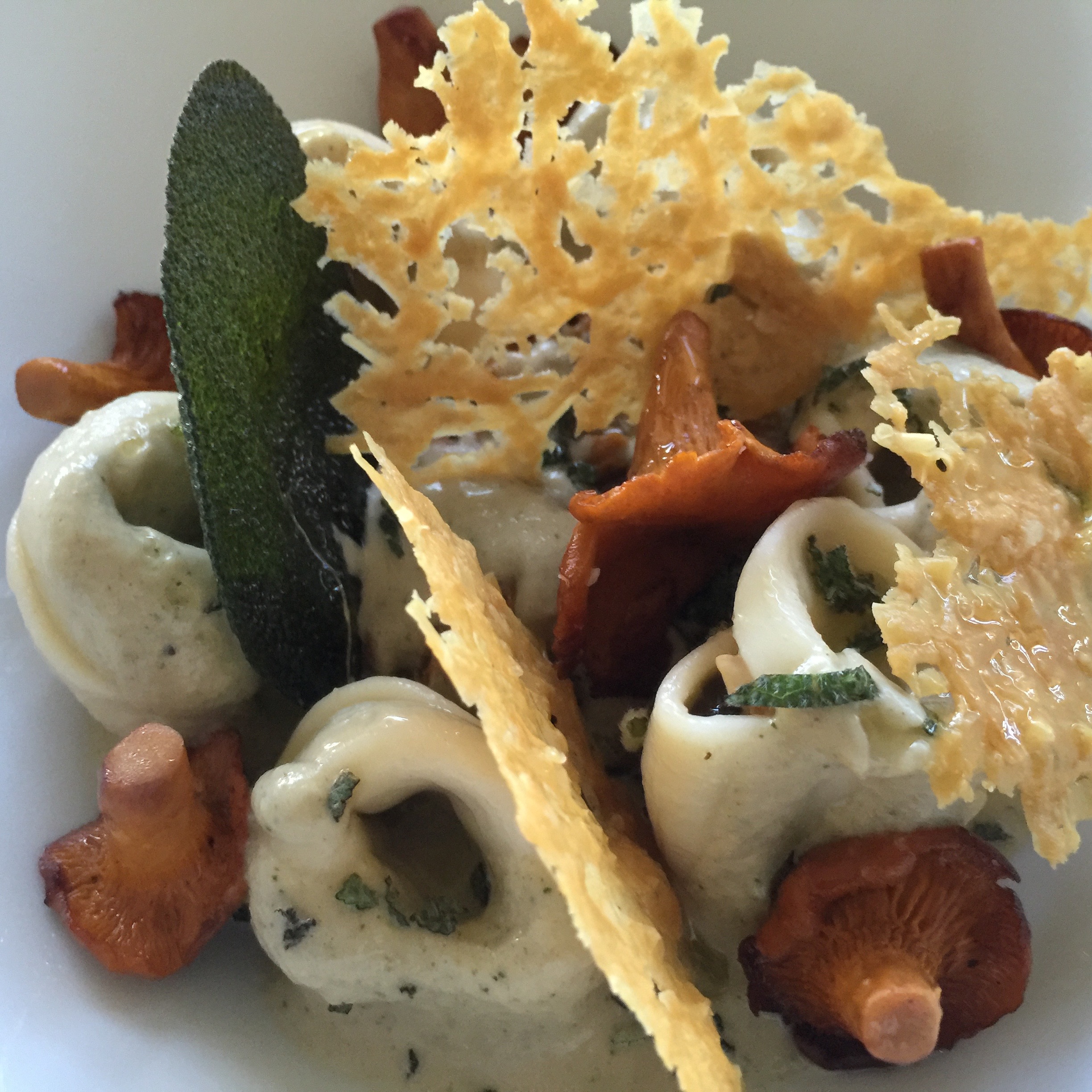 Tortellini: Cortamos la pasta en trozos de 150-200 gr que trabajaremos por separado. Si tenéis máquina laminadora de pasta fresca los pasáis por ella en el numero de máxima apertura varias veces, doblándola y girando a cada paso. Si no tenéis, la estiramos con un rodillo hasta que tenga un grueso de 0,5 mm. Con un cortapastas hacemos círculos de 6 ó 7 cm de diámetro, aunque también se pueden hacer cuadrados de esta medida. A continuación, ponemos una pequeña cantidad del relleno, humedecemos los bordes con huevo batido y los cerramos, los doblamos y apretamos un extremo contra el otro para formar el tortellini. Guarnición: Calentamos las chantarelas que habíamos reservado y los dados de calabacín. Asimismo, cortamos finamente la mitad de las hojas de salvia y las añadimos. Sobre un plato colocamos un papel film y situamos sobre él hojas de salvia enteras impregnadas de aceite, las metemos en el microondas hasta que estén fritas, las escurrimos en papel de cocina y las colocamos de adorno. Emplatado: