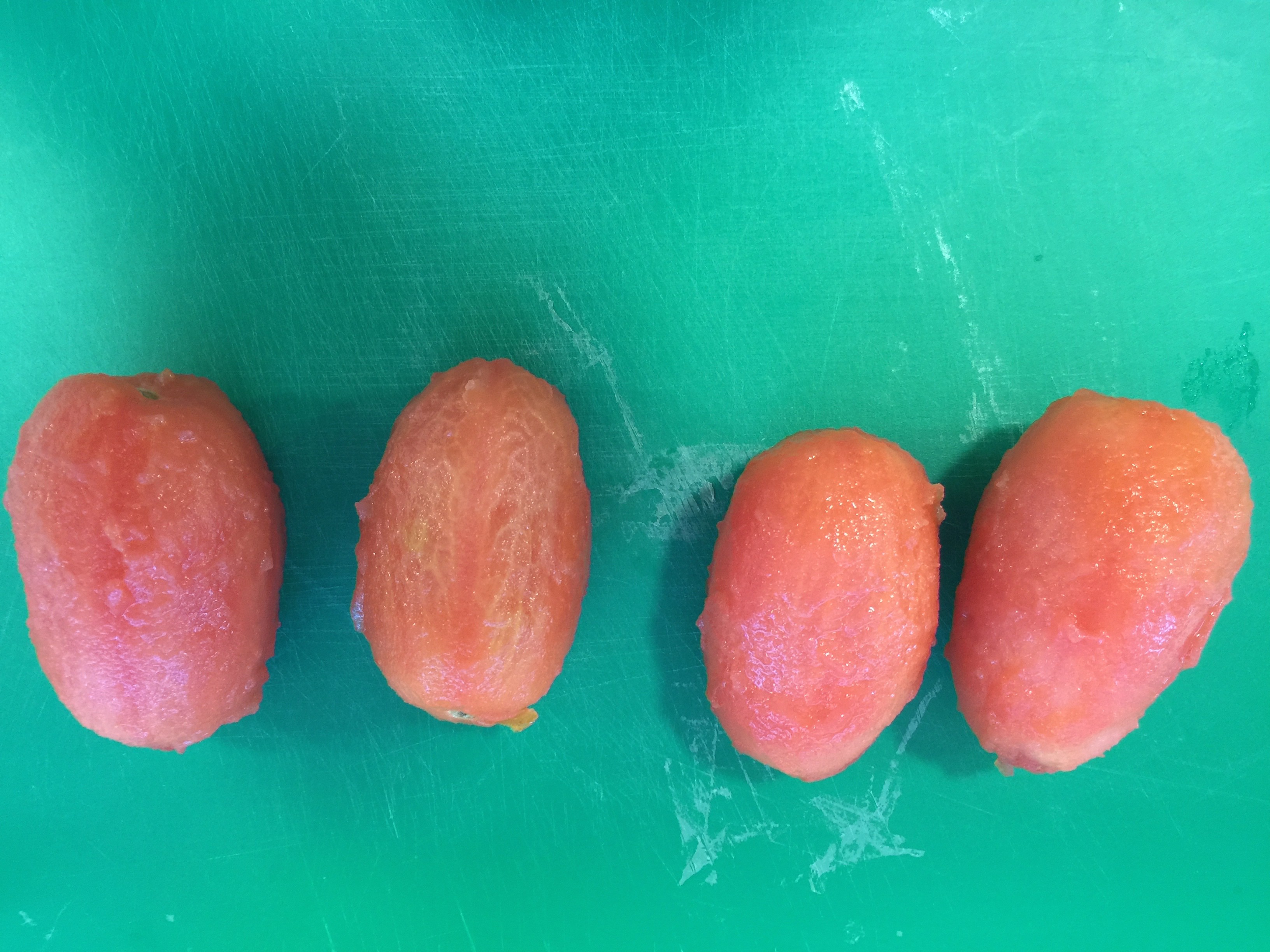 La ensalada es más sencilla. Cogemos los tomates y los pelamos, bien con un pelador o escaldándolos en agua hirviendo y metiéndolos, acto seguido, en agua con hielo lo que nos facilitará el pelado. Si no conocéis este proceso para pelar los tomates, podéis mirarlo en la receta del tomate confitado.