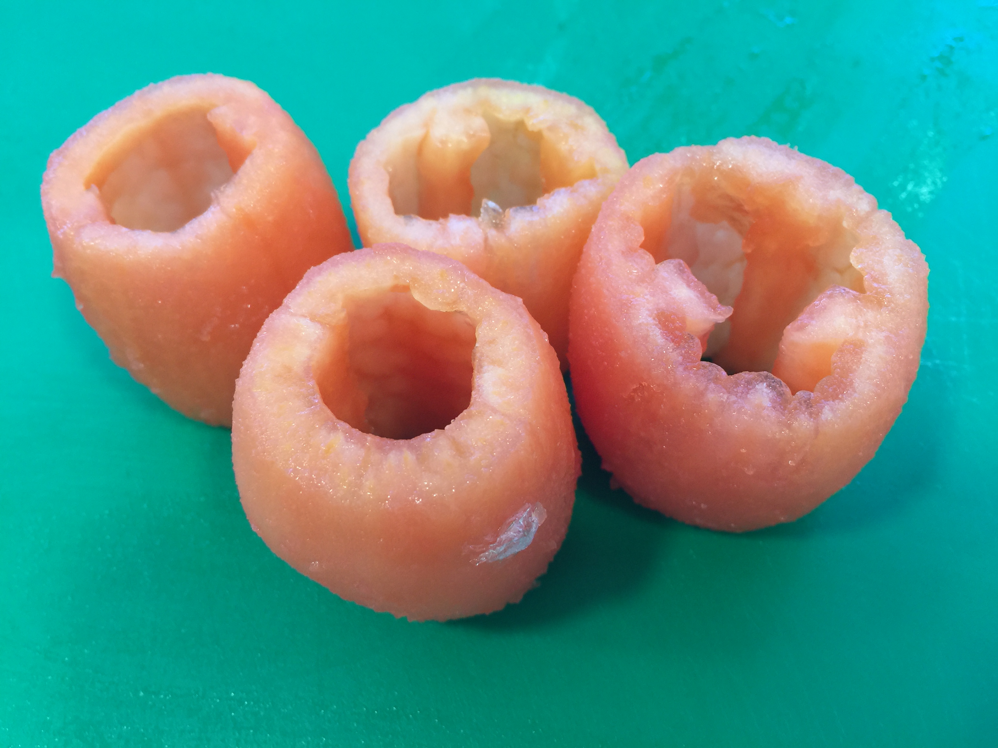 A continuación, con ayuda de un quitasemillas de los que utilizamos para las manzanas y después de quitarle el pedúnculo al tomate (zona superior de la que cuelga de la rama), le sacamos el centro, con la mano o con la ayuda de una cucharilla, vaciamos el interior del tomate y lo regularizamos cortando con el cuchillo la parte superior e inferior del mismo. Todo esto que le hemos quitado al tomate lo introducimos en un vaso  con aceite, sal y unas gotas de vinagre y lo trituramos como si fuera un gazpachuelo, lo probamos de aderezo, lo pasamos por el chino para quitarle las simientes del tomate y reservamos.