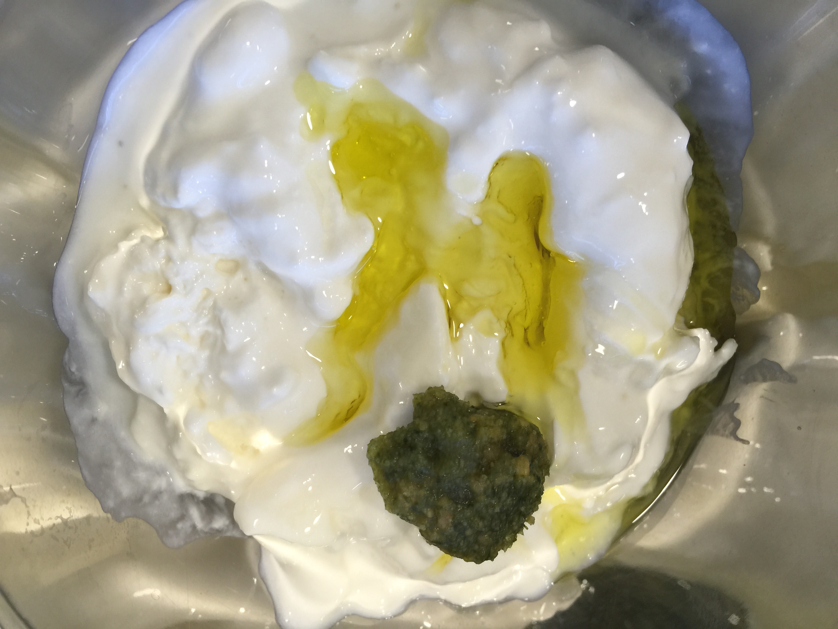 Empezamos por hacer el pesto.  Pelamos el ajo, le quitamos el germen abriéndolo a la mitad, lo metemos en un mortero junto con los piñones, las hojas lavadas de albahaca, un poco de sal para facilitar la mezcla y vamos incorporando aceite hasta que tenga la consistencia que deseamos. Reservamos la mezcla filmada.