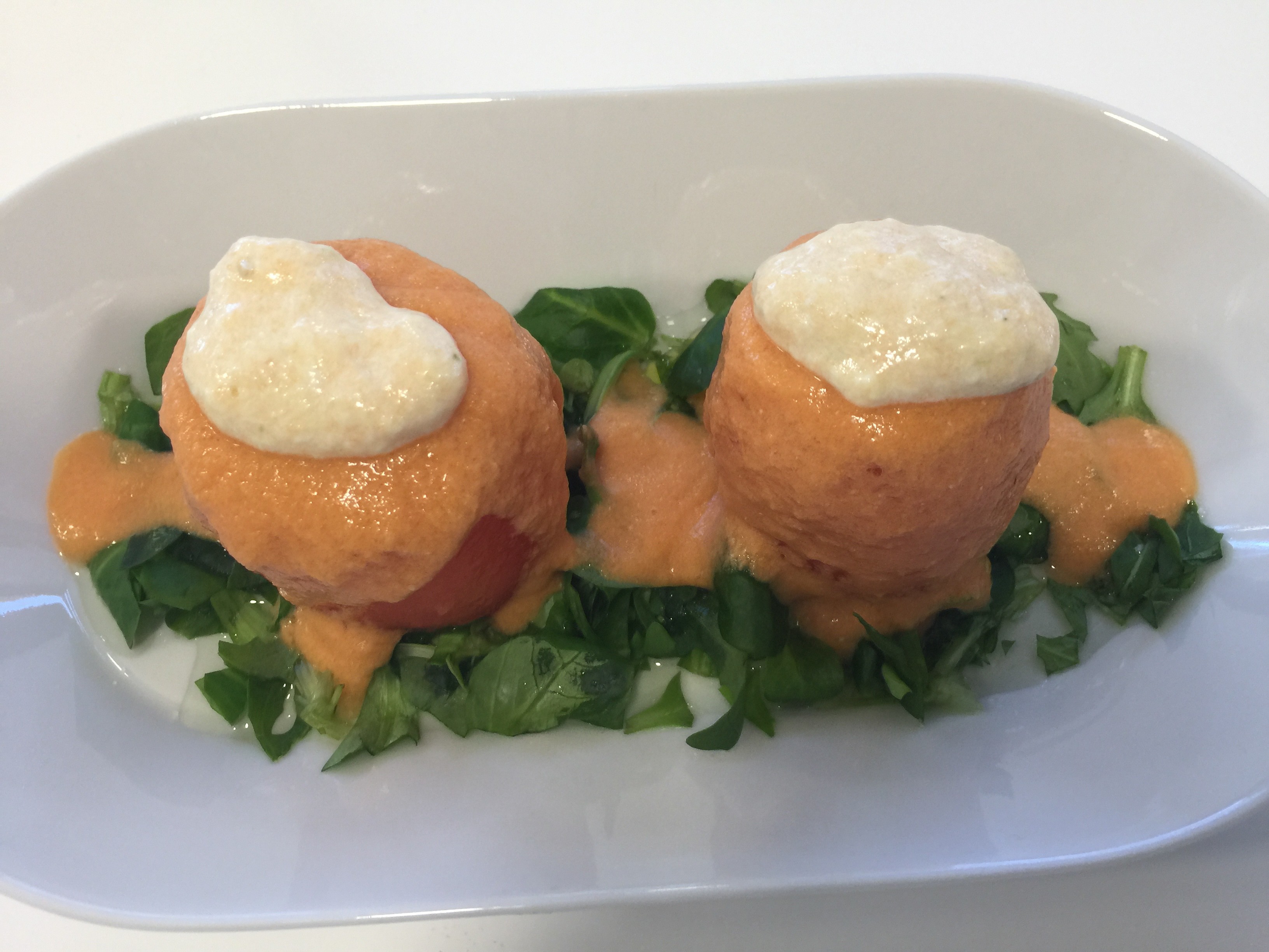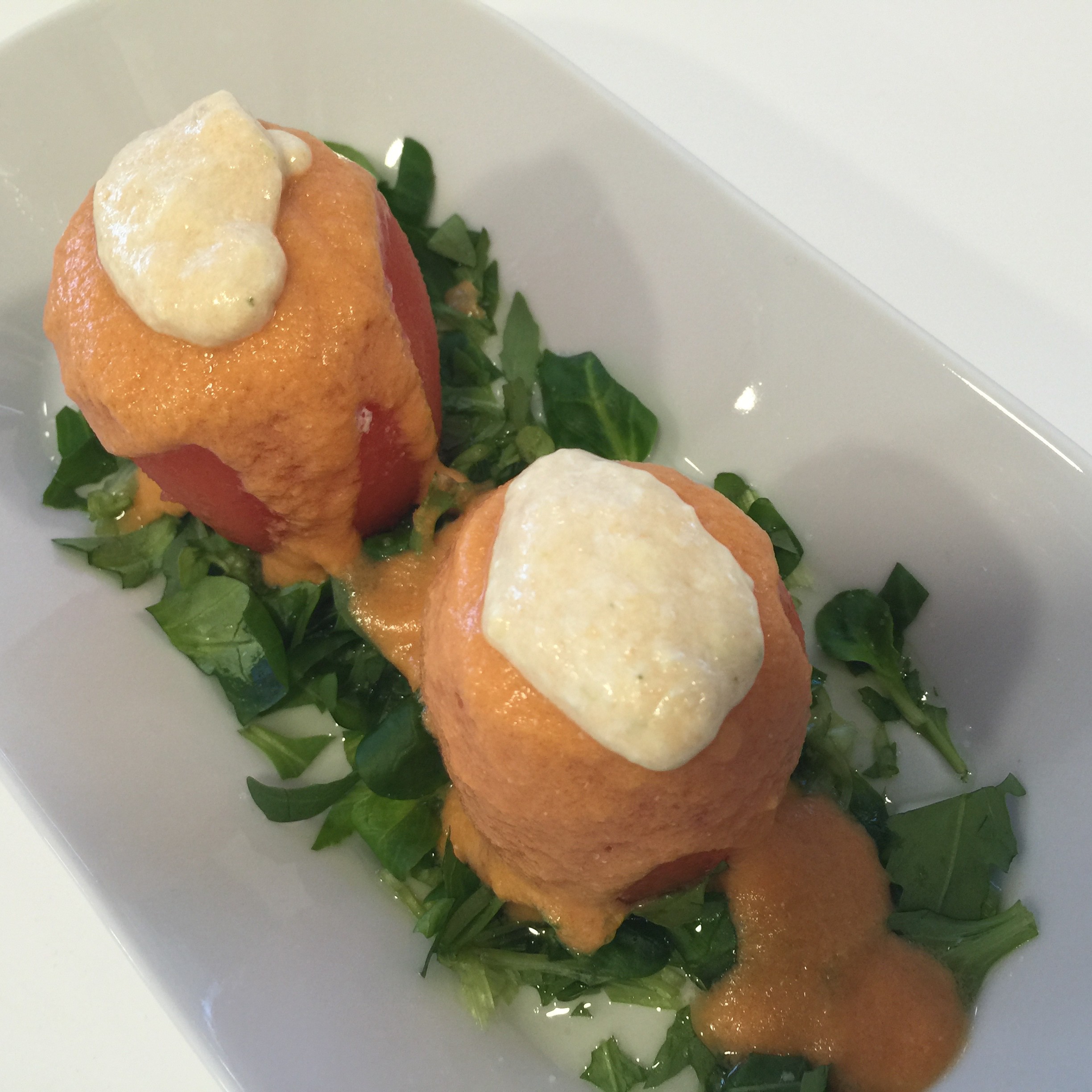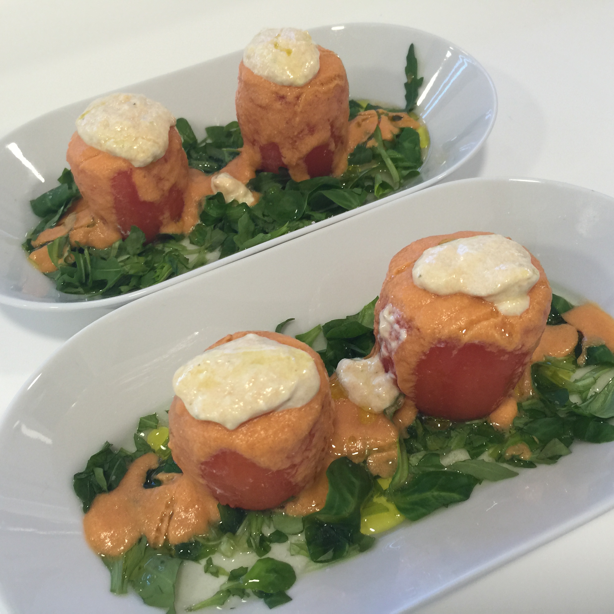 Para finalizar, sacamos los platos, ponemos en ellos una base de rúcula que cortamos un poco para que asiente mejor, ponemos un poco de sal y aceite sobre ella, encima dos tomates rellenos y los cubrimos por encima con el gazpachuelo que hicimos. Si nos sobra relleno, le podemos poner un detalle encima de ellos, el resto es disfrutar.