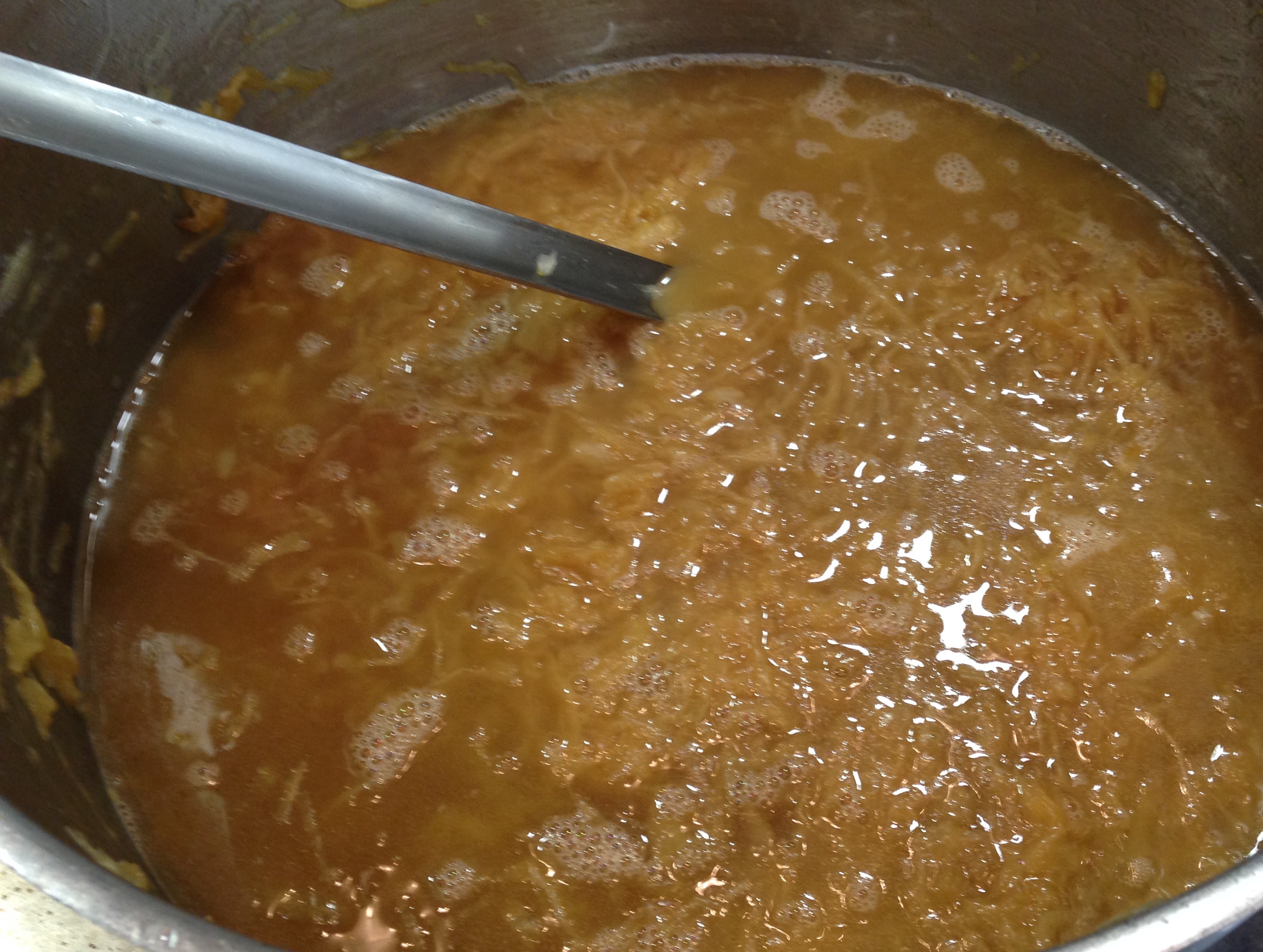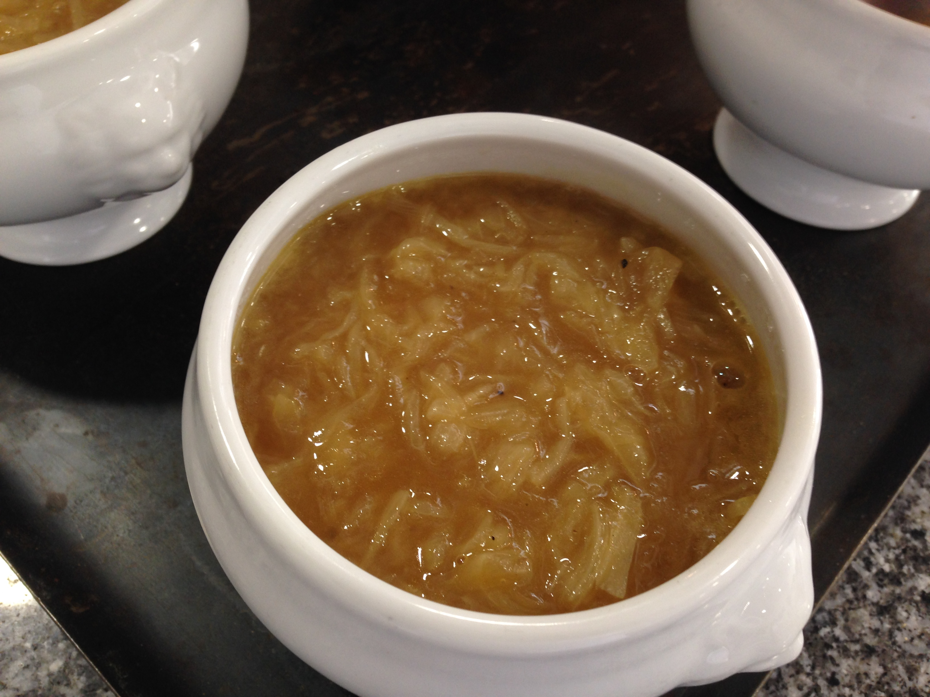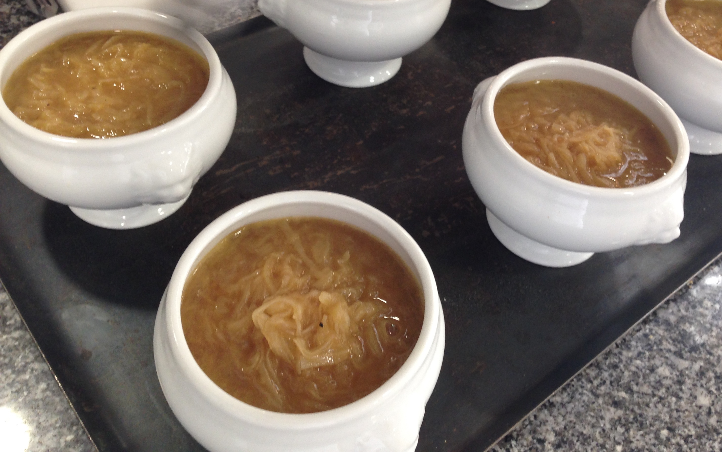 La cebolla no la queremos demasiado tostada sino más bien rubia. Cuando esté, le echamos el vino blanco y la reducimos a seco, este vino se le echa para que tenga un poco de acidez. Una vez reducido, se le incorpora el fondo de pollo y lo dejamos hervir un poco, rectificamos la sazón y le ponemos un poco de vino dulce al final (vino de Madeira), dejándolo hervir un poco más para que evapore algo el alcohol, probamos y sazonamos.