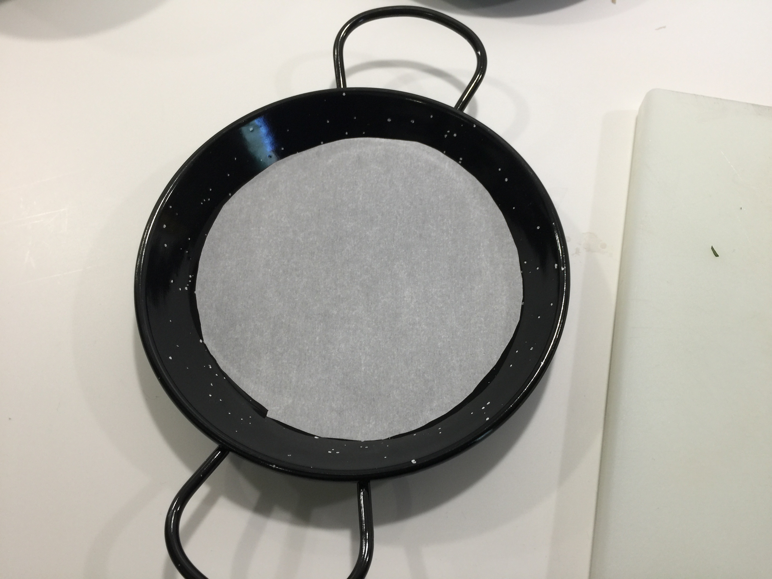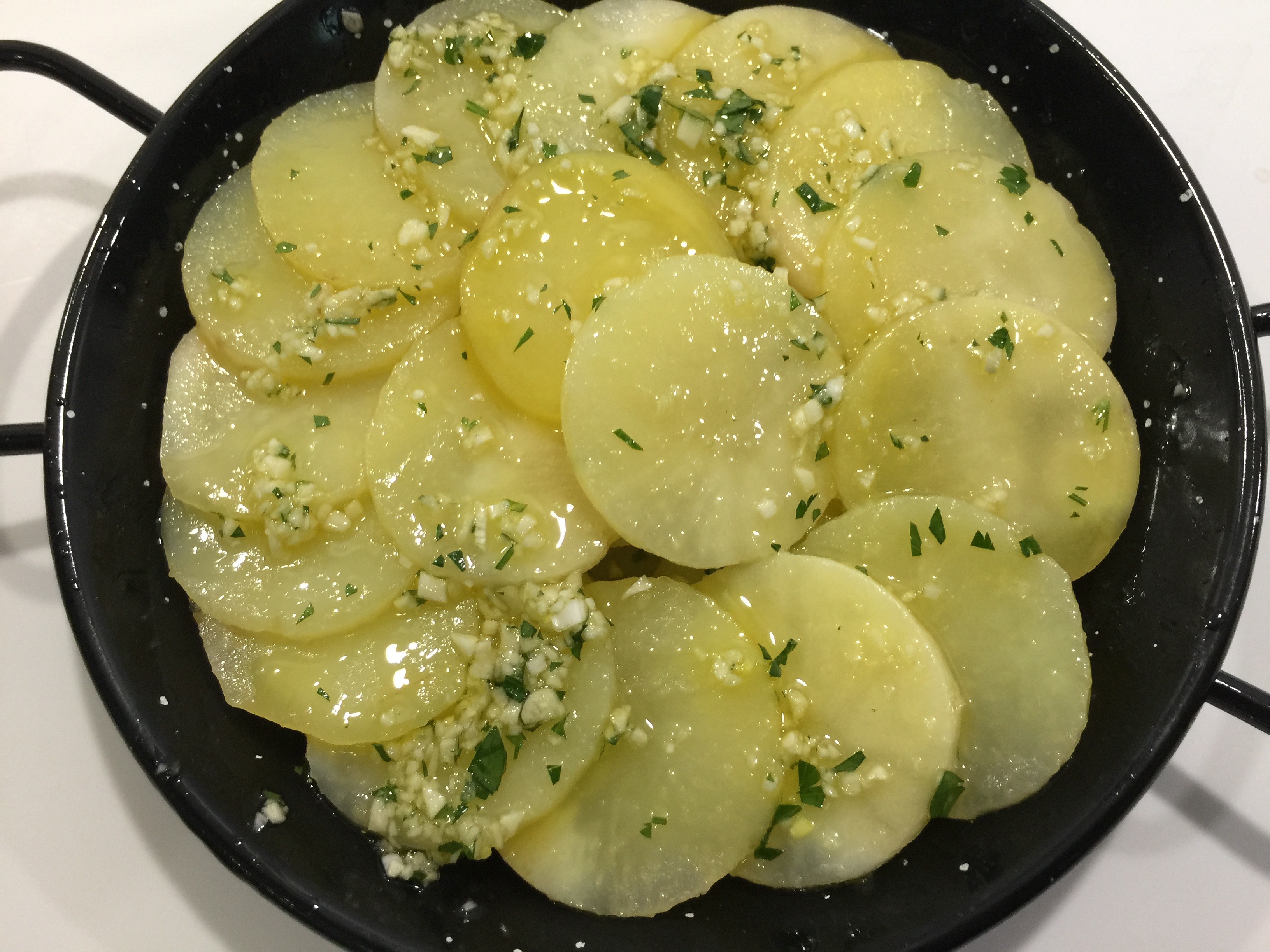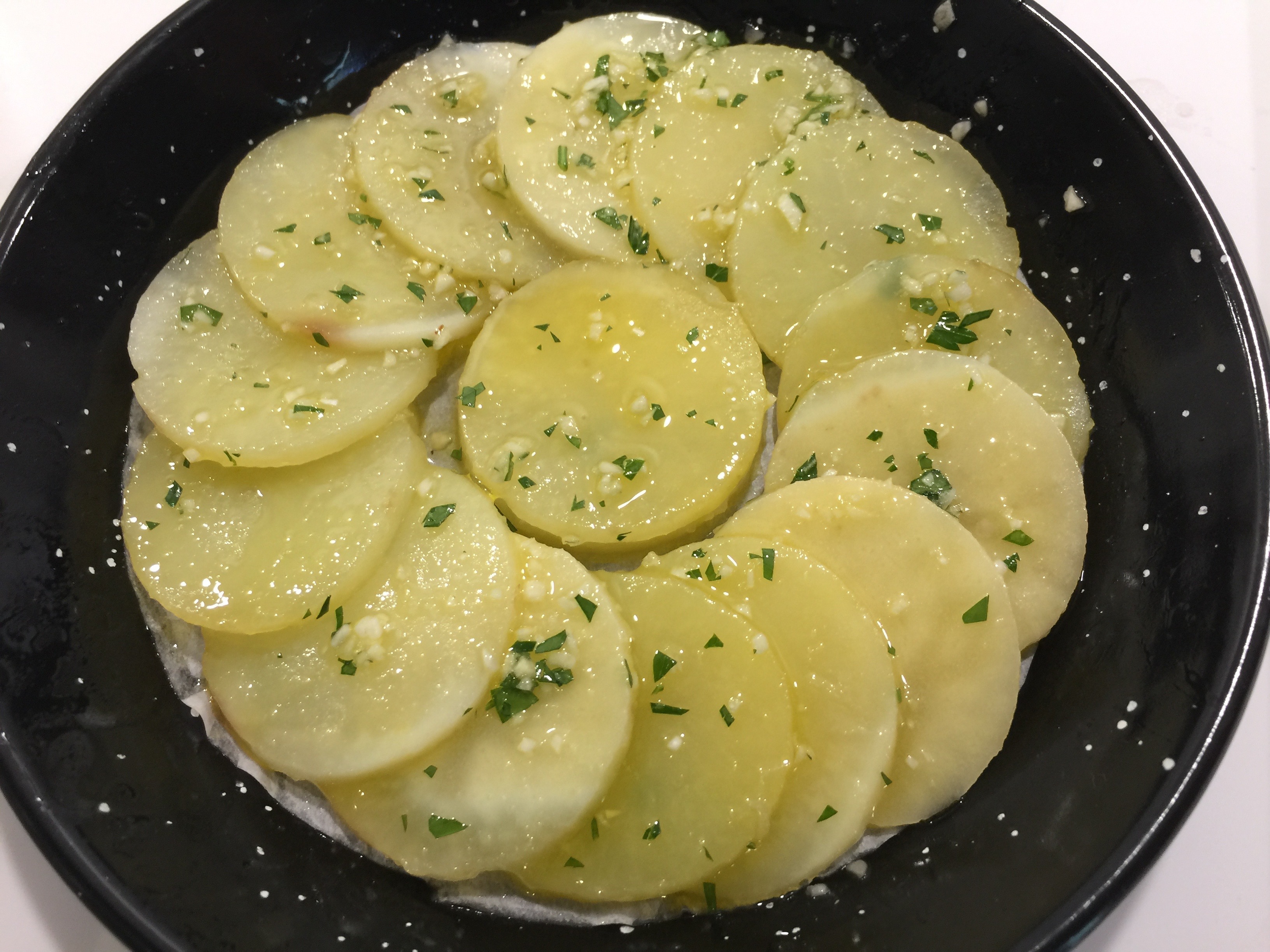 A continuación, procedemos a realizar el montaje que está hecho en pequeñas fuentecillas de unos doce cm de diámetro. En el fondo, ponemos un círculo recortado de papel sulfurizado que pincelamos con nuestro aliño. Encima colocamos las patatas en círculo y de la manera más regular posible, como en la foto, llenando el centro con otras, echamos sal y pimienta y volvemos a pincelar con la mezcla; posteriormente, ponemos una segunda capa, pincelamos de nuevo, salpimentamos, las presionamos uniformemente con ayuda de una papel sulfurizado y así las fuentes que necesitemos.