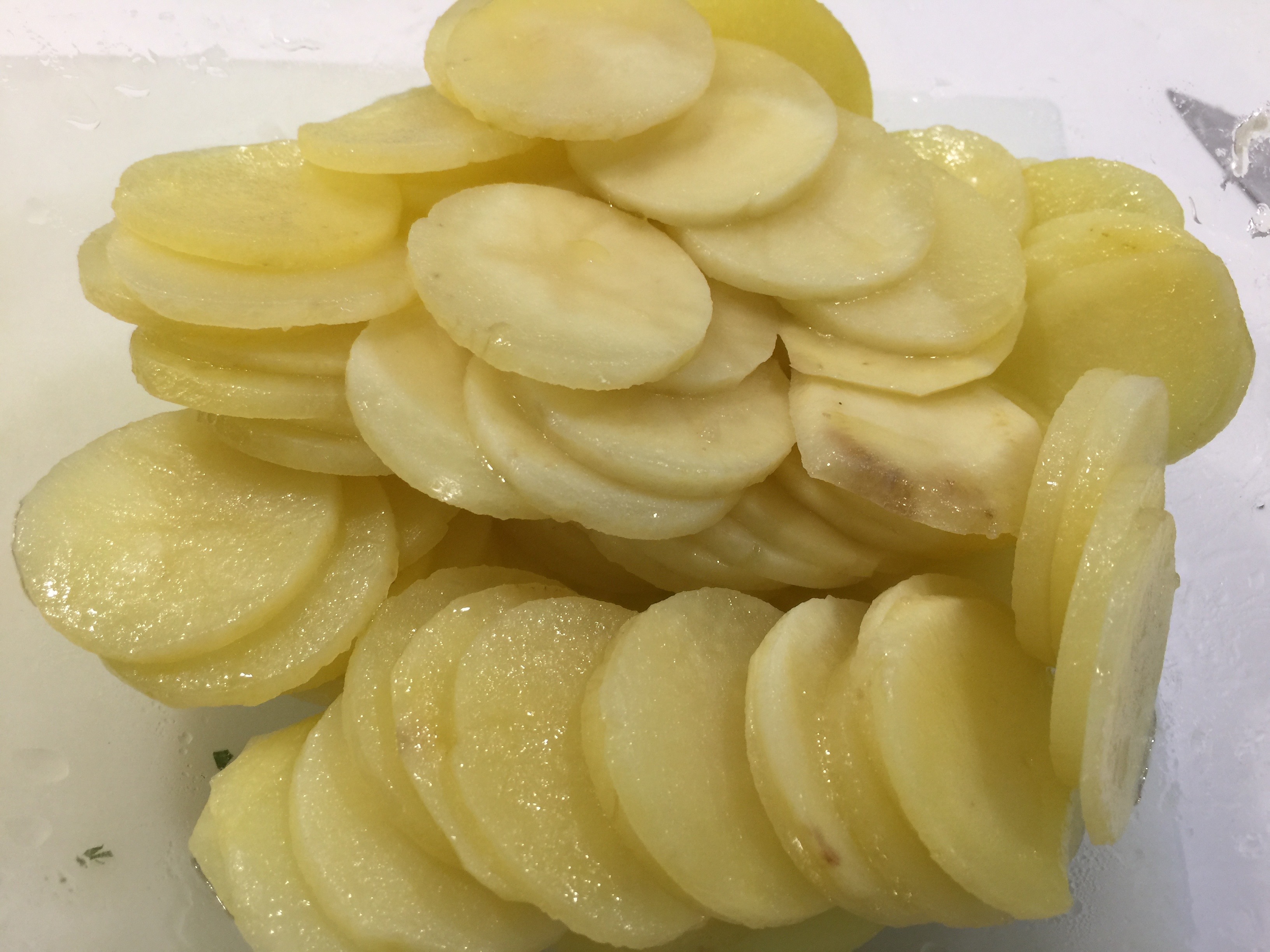 En primer lugar, pelamos las patatas con ayuda de una mandolina o el cortador que tengáis en vuestra cocina y las cortamos con un espesor de unos 2 a 3 mm.