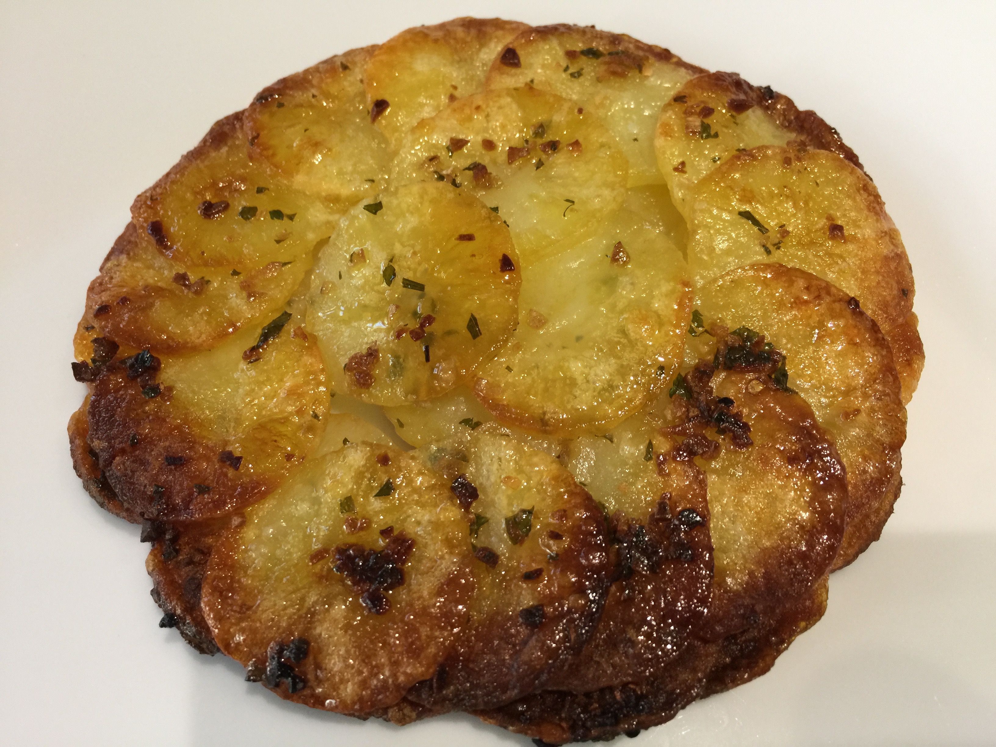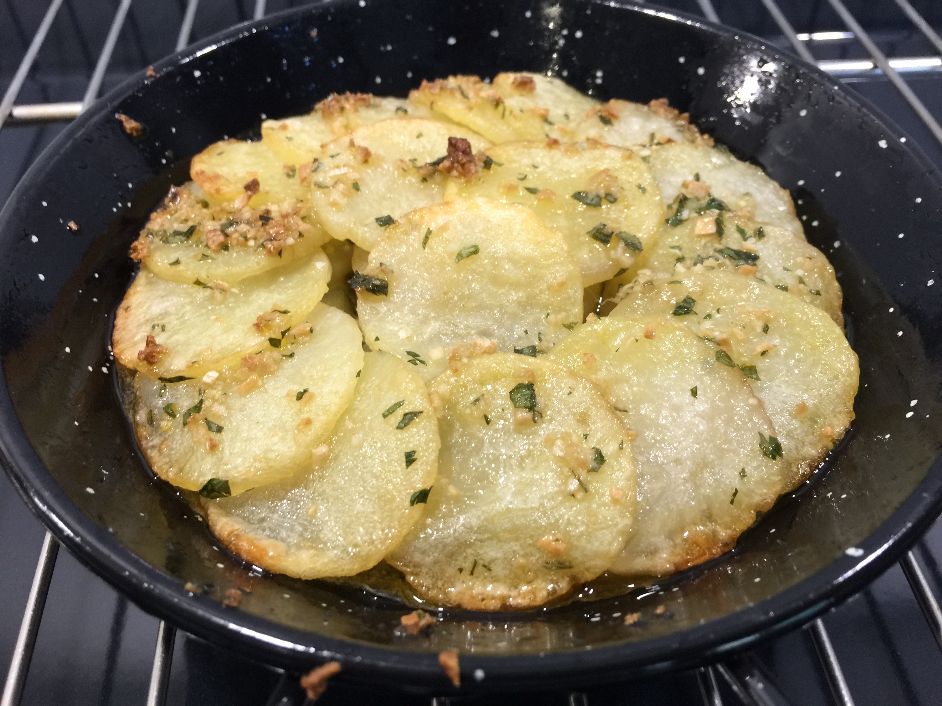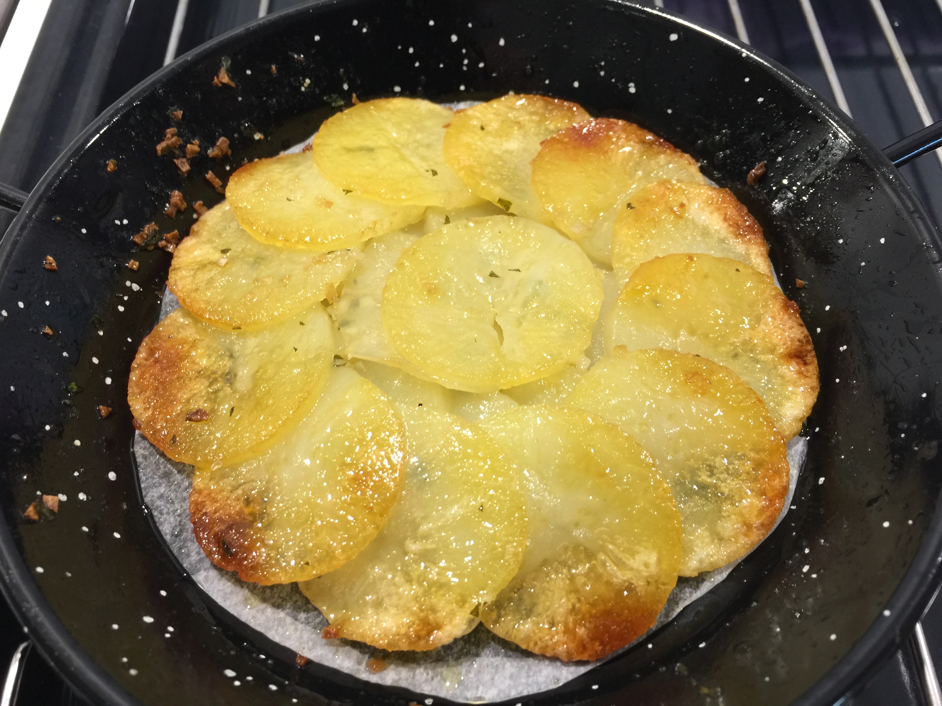 Por último, calentamos el horno, con calor superior e inferior a 160º, poniendo sobre la bandeja más baja las fuentecillas. Aquí el tiempo dependerá del horno pero, más o menos a los quince minutos, las sacaremos, con cuidado despegamos las patatas de los bordes (por debajo no se pegan porque está el papel) y, como si de una tortilla de patatas se tratara, le damos la vuelta sobre un plato pequeño y las volvemos a poner de nuevo en la fuentecita y otra vez al horno por otros diez minutos más o menos, controlando en cualquier caso su cocción.