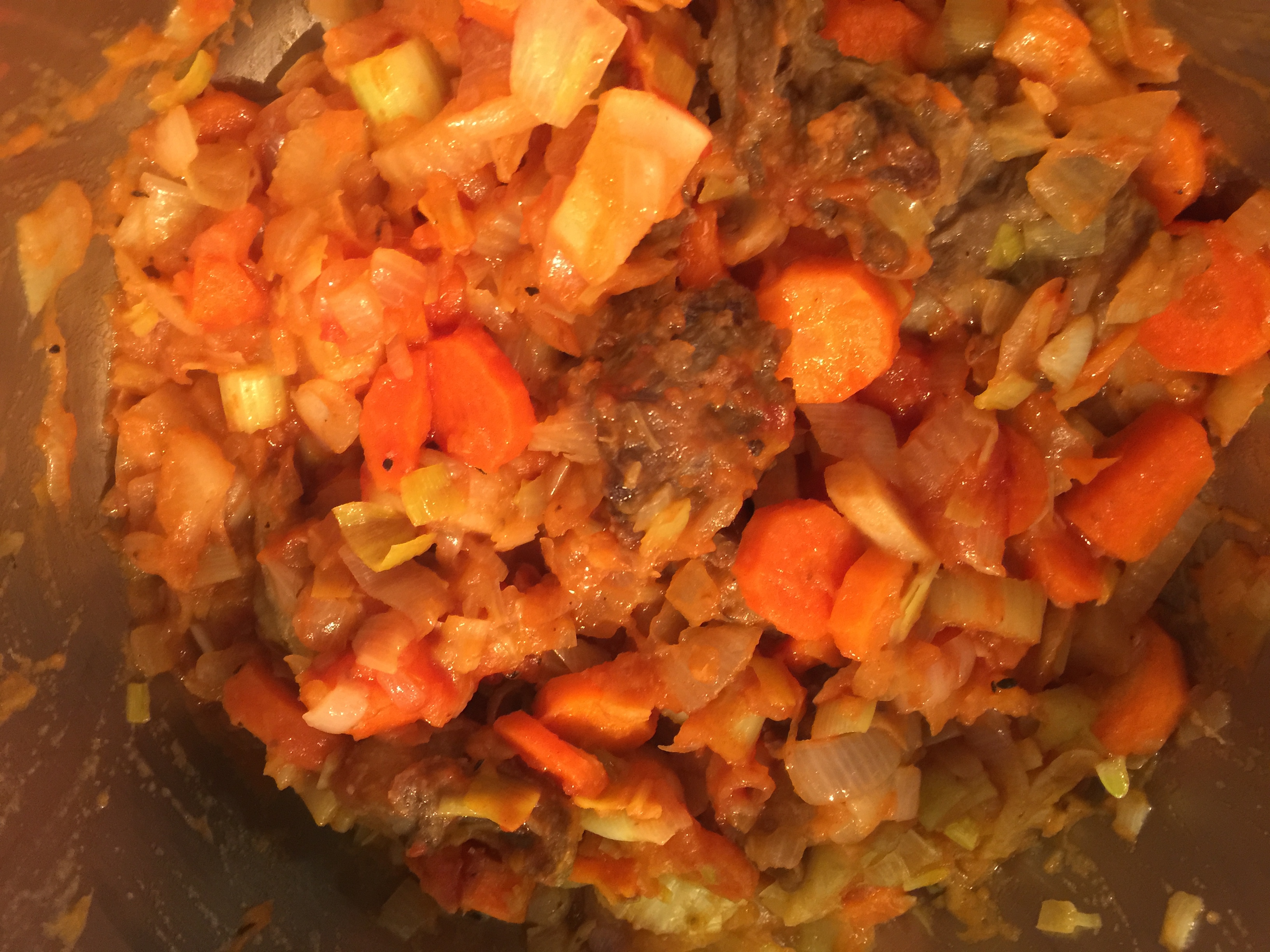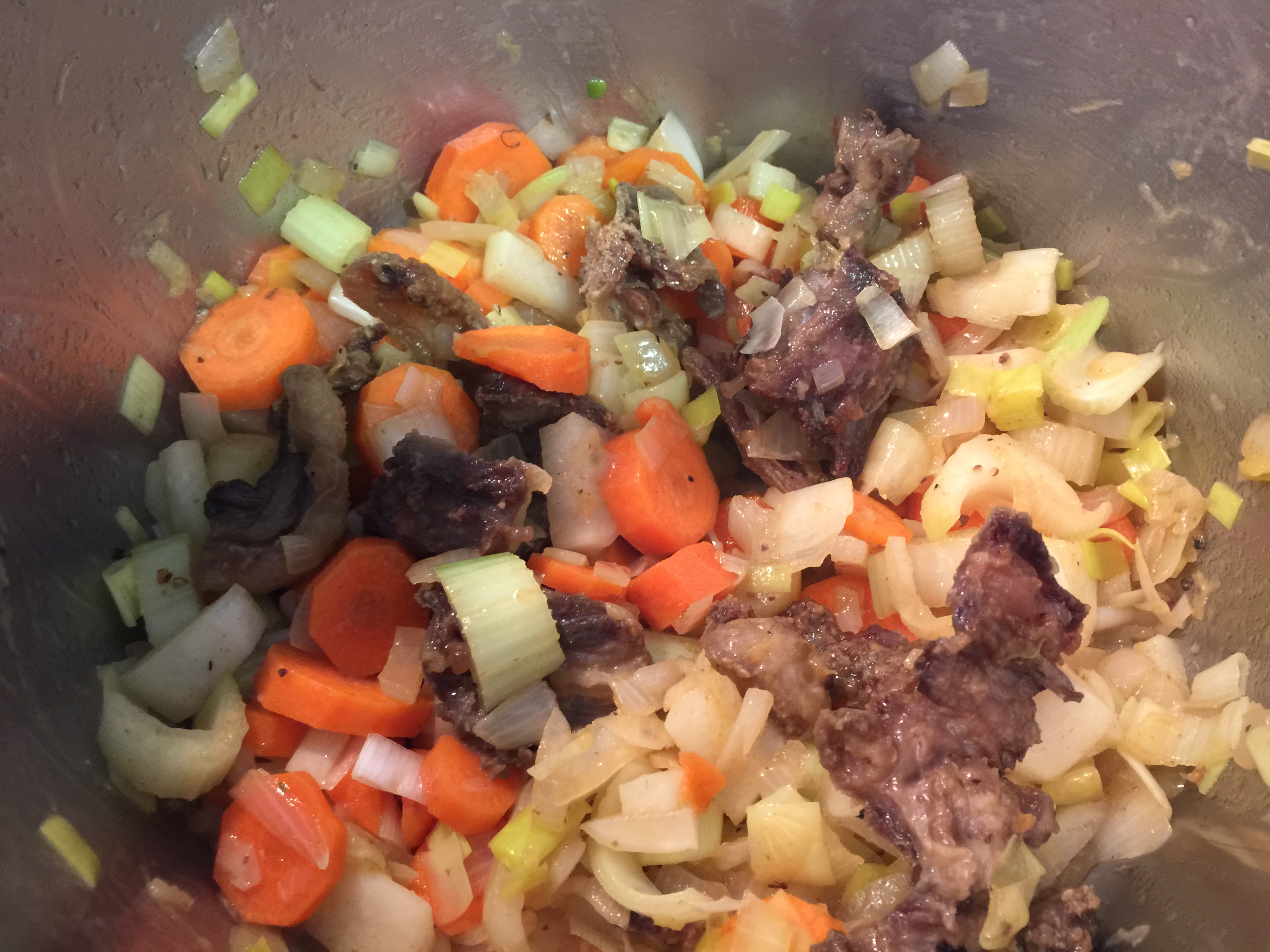 Empezamos por cortar la cebolla, el puerro, la zanahoria y el apio, que será de tamaño grande puesto que la cocción es larga y luego habrá que retirarlos.