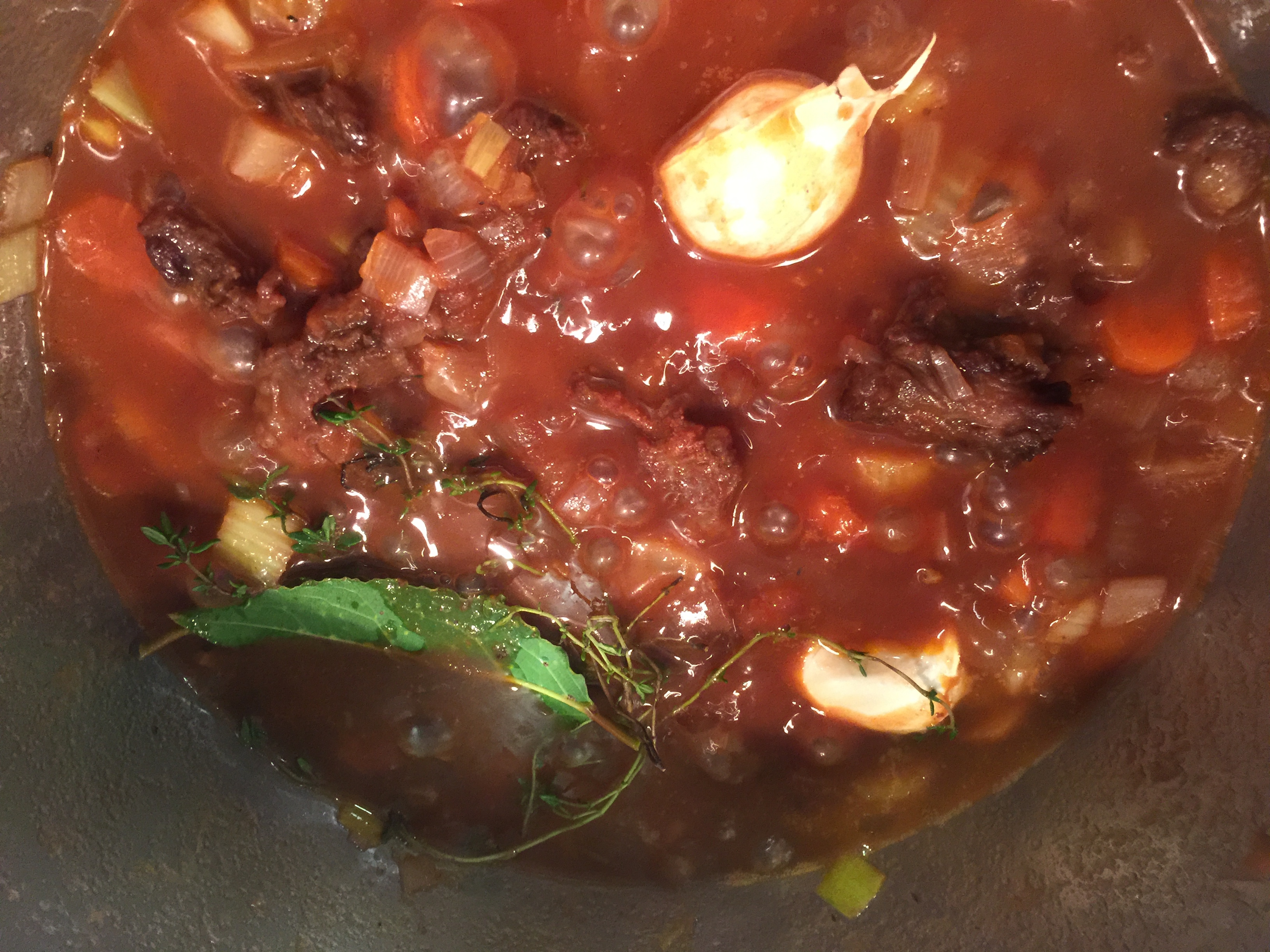 Sobre todo ello, añadimos el cognac y reducimos a seco (hasta que no quede líquido apenas), después el vino, que no hace falta reducir, después el fondo y lo echamos todo sobre el rabo, lo llevamos a ebullición y desespumamos. El líquido lo debe de cubrir y, si no es así, le añadimos agua, lo tapamos y lo ponemos a cocinar a fuego muy lento durante un período de tiempo de entre 3 y 4 horas.