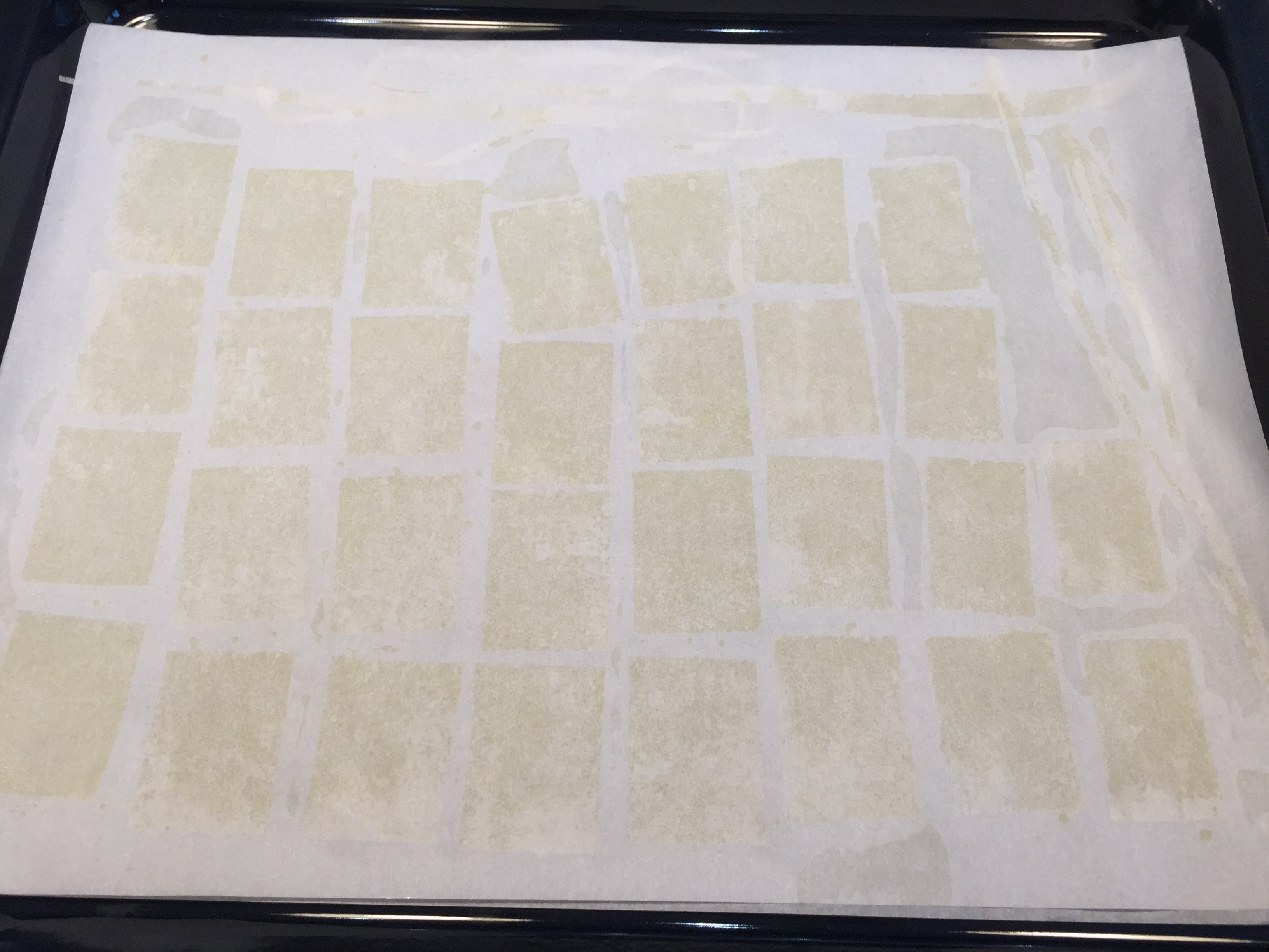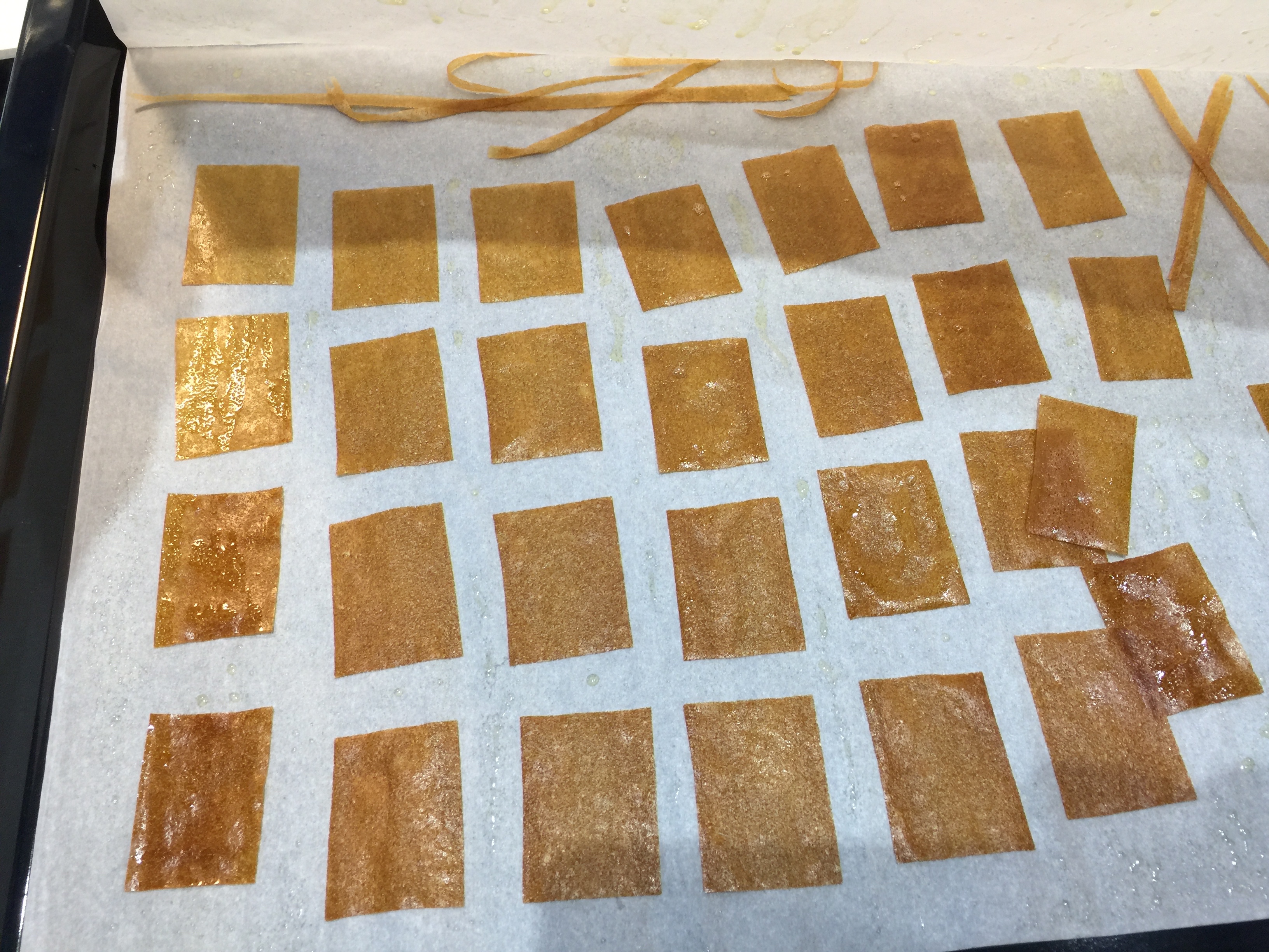 Sobre una bandeja de horno colocamos un papel sulfurizado, ponemos un poco de aceite en él, con ayuda de una brocha lo extendemos y, sobre él, colocamos los trozos de la pasta cortada. A continuación, ponemos otro papel por encima o doblamos el que hemos puesto, ponemos otra bandeja encima y lo metemos en el horno a 160º durante unos 10 minutos o hasta que se doren como veis en la fotografía.