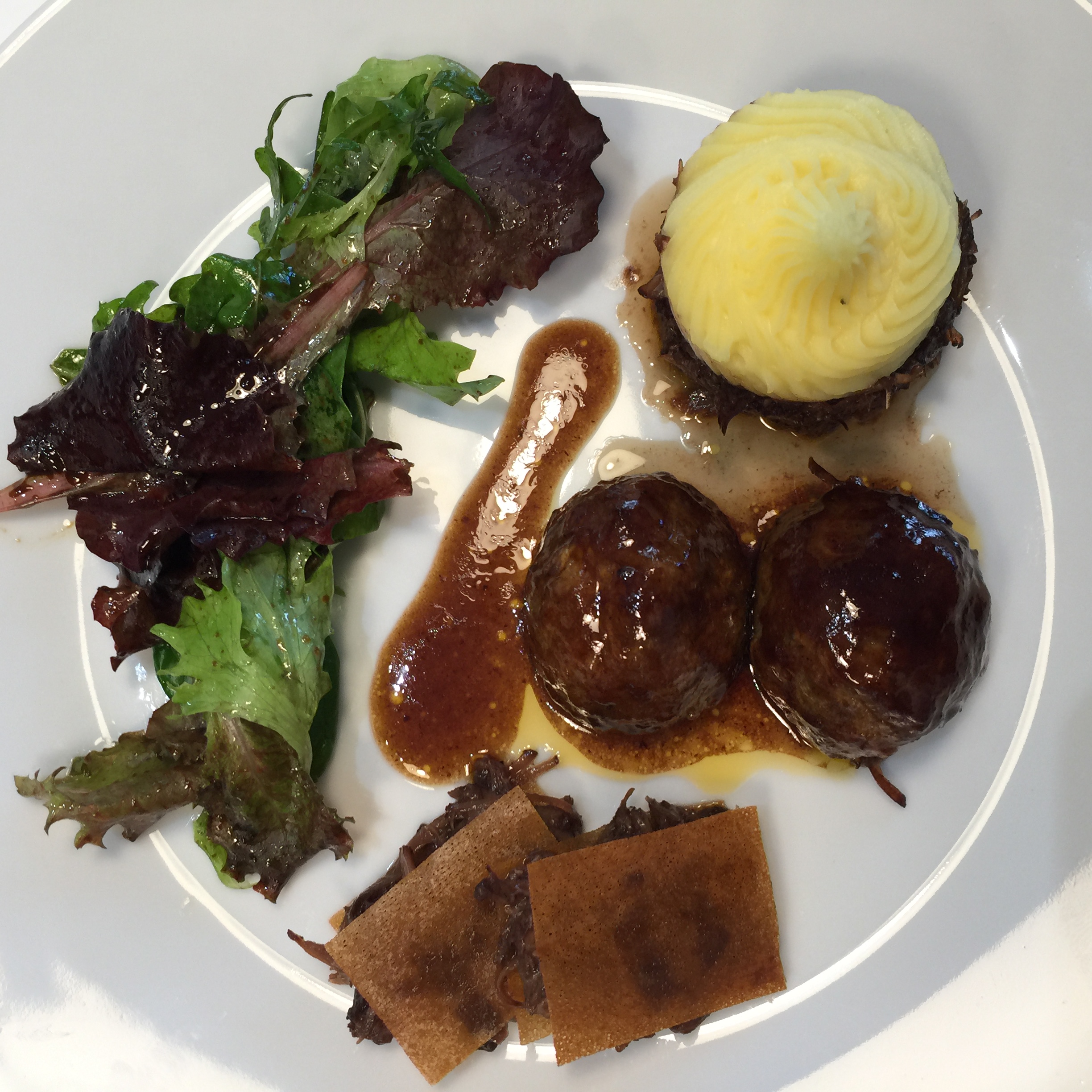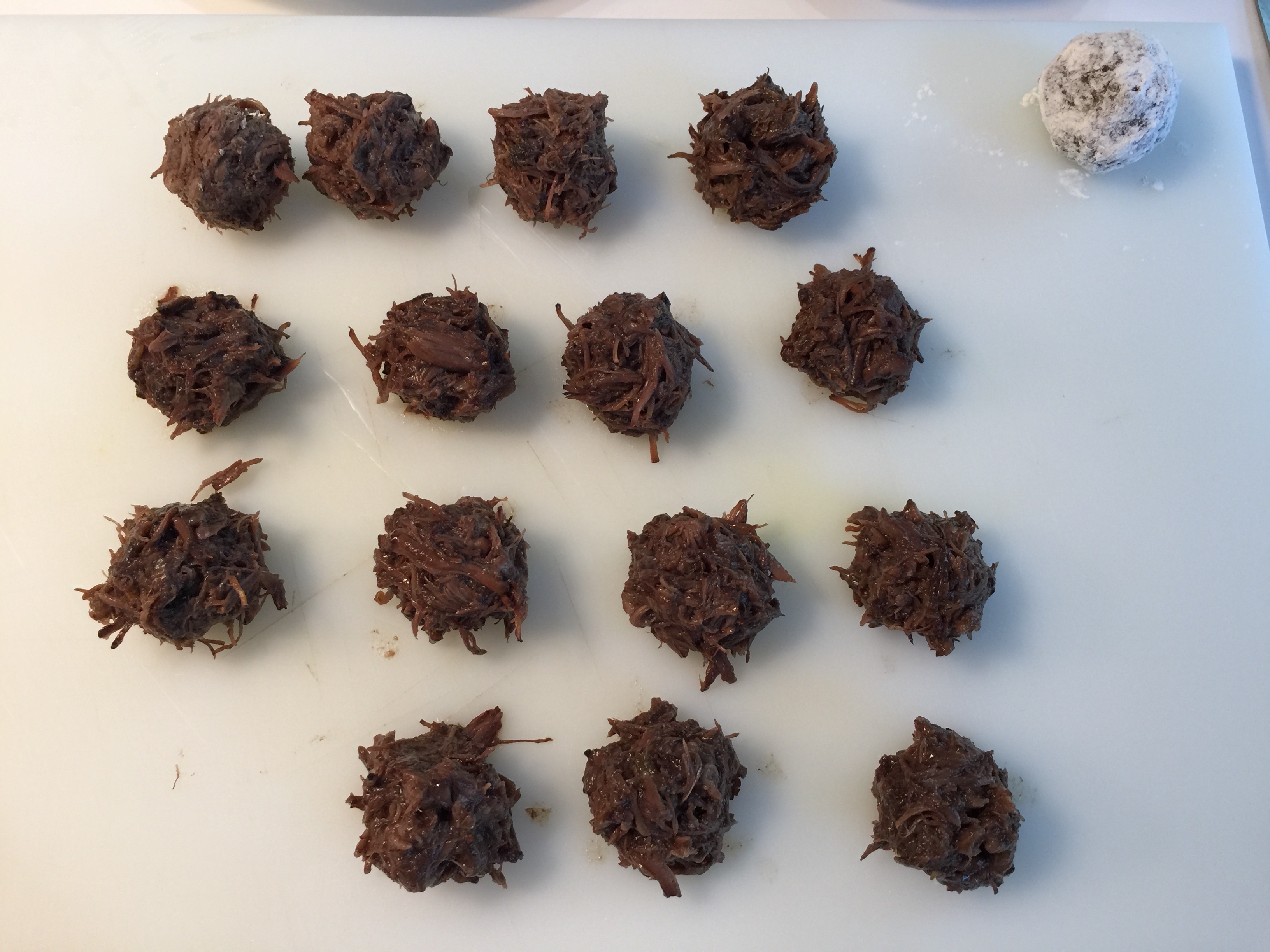 En albóndigas: Cortamos un poco la carne sacada del rabo, la mezclamos con un poco de la salsa reducida y la metemos a enfriar en la nevera, se nos quedará como un bloque por la gran cantidad de gelatina y colágeno que tiene la salsa. A continuación, batimos un huevo y ponemos harina en un plato. Una vez fría, conformamos las albóndigas, las pasamos por harina, luego por huevo y de nuevo por harina y las mantenemos en frío. Hay que tener en cuenta que la gracia de estas albóndigas es que, cuando las fríes, quedan muy jugosas por dentro al licuarse la salsa. La sensación es muy rica.
