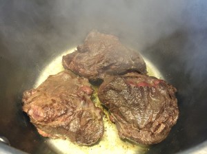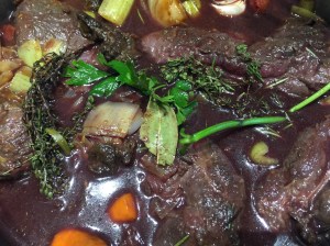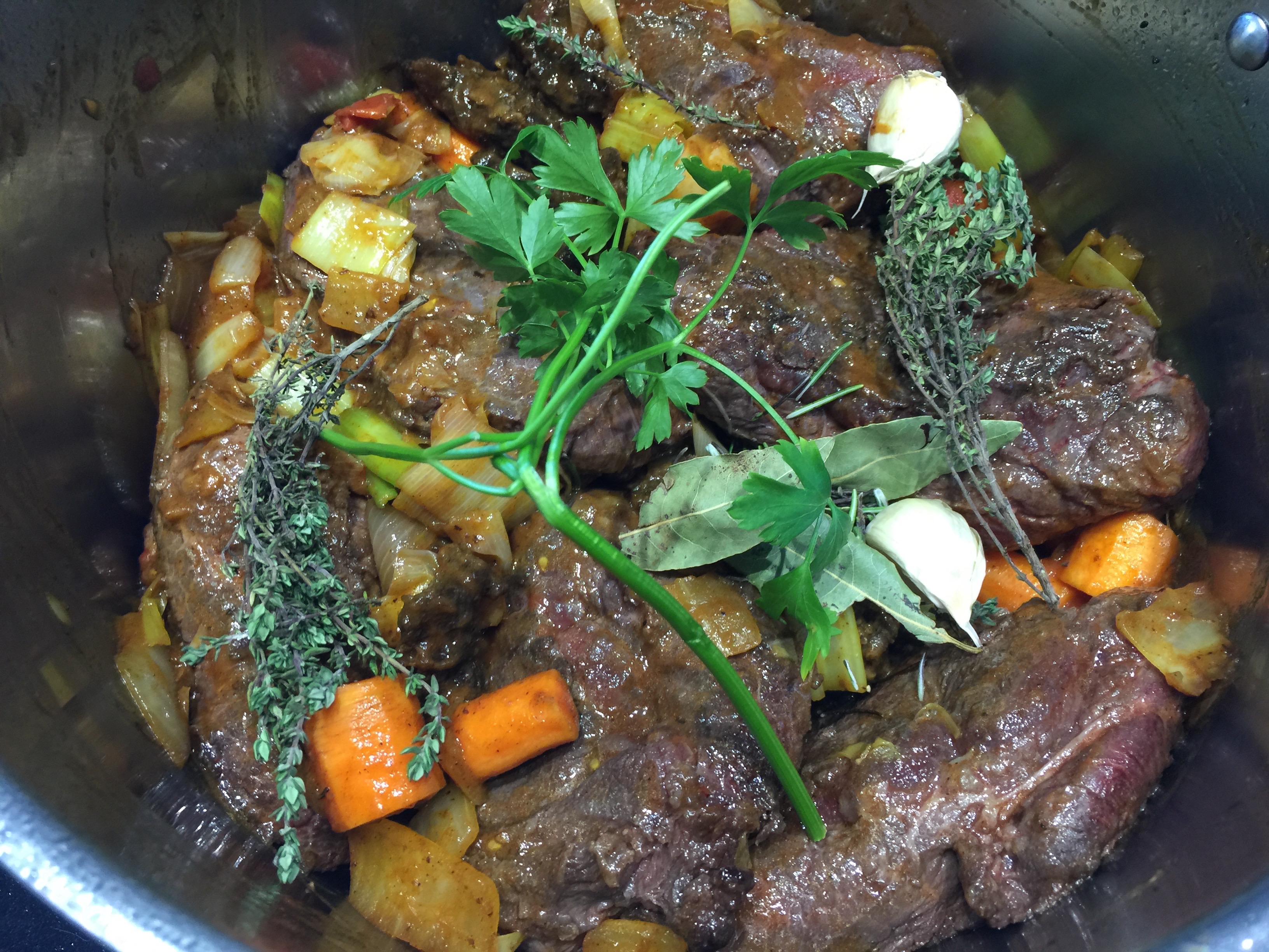 - Introducir las carrilleras, ajo, laurel, tomillo y perejil, echar la botella de vino tinto, cubrir con agua, si hace falta, tapar y llevar a ebullición, desespumar y dejar a fuego lento o introducir en el horno a 160º/180º hasta que estén tiernas (entre dos y tres horas dependiendo del tamaño).