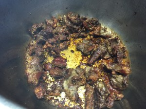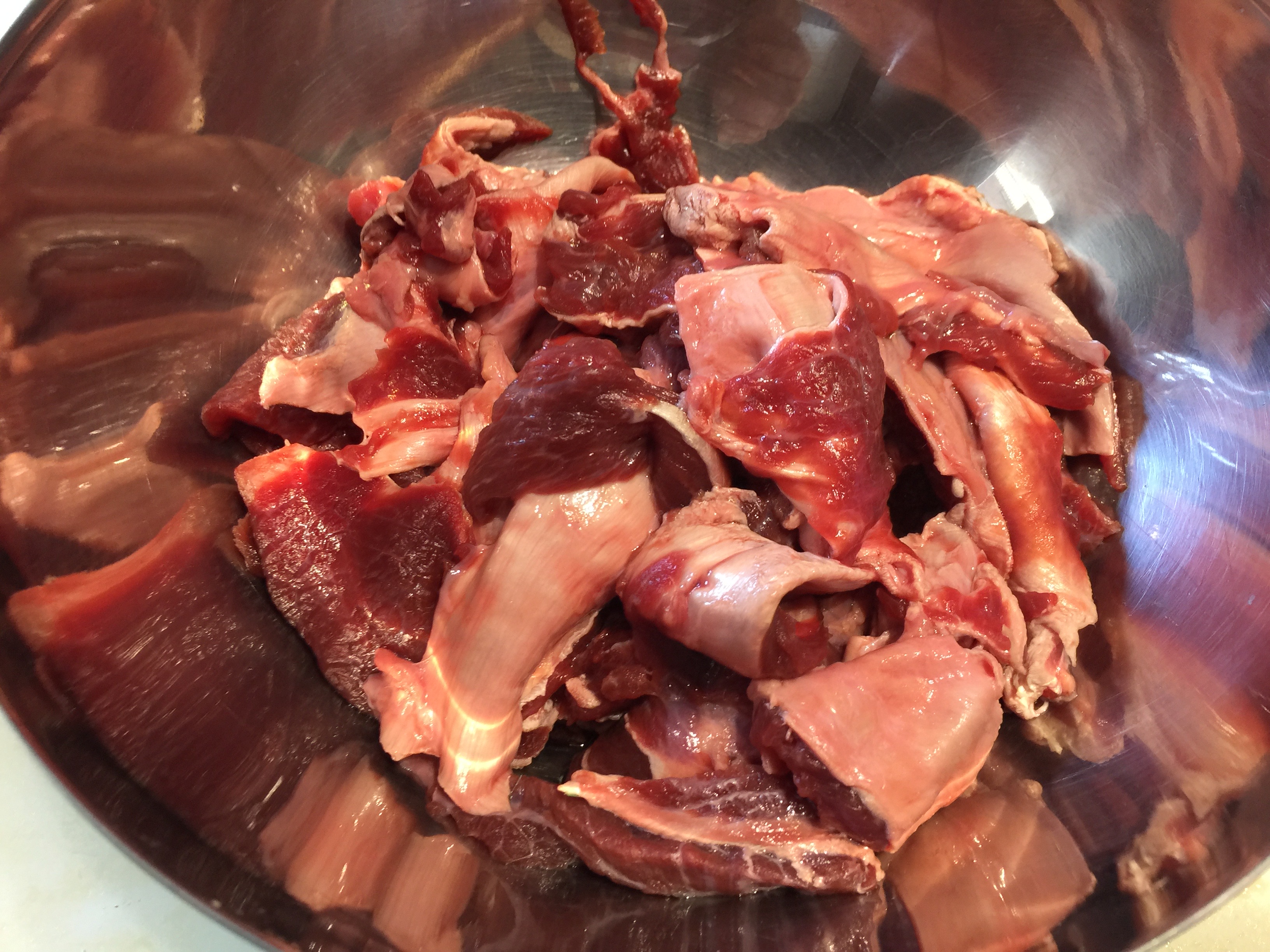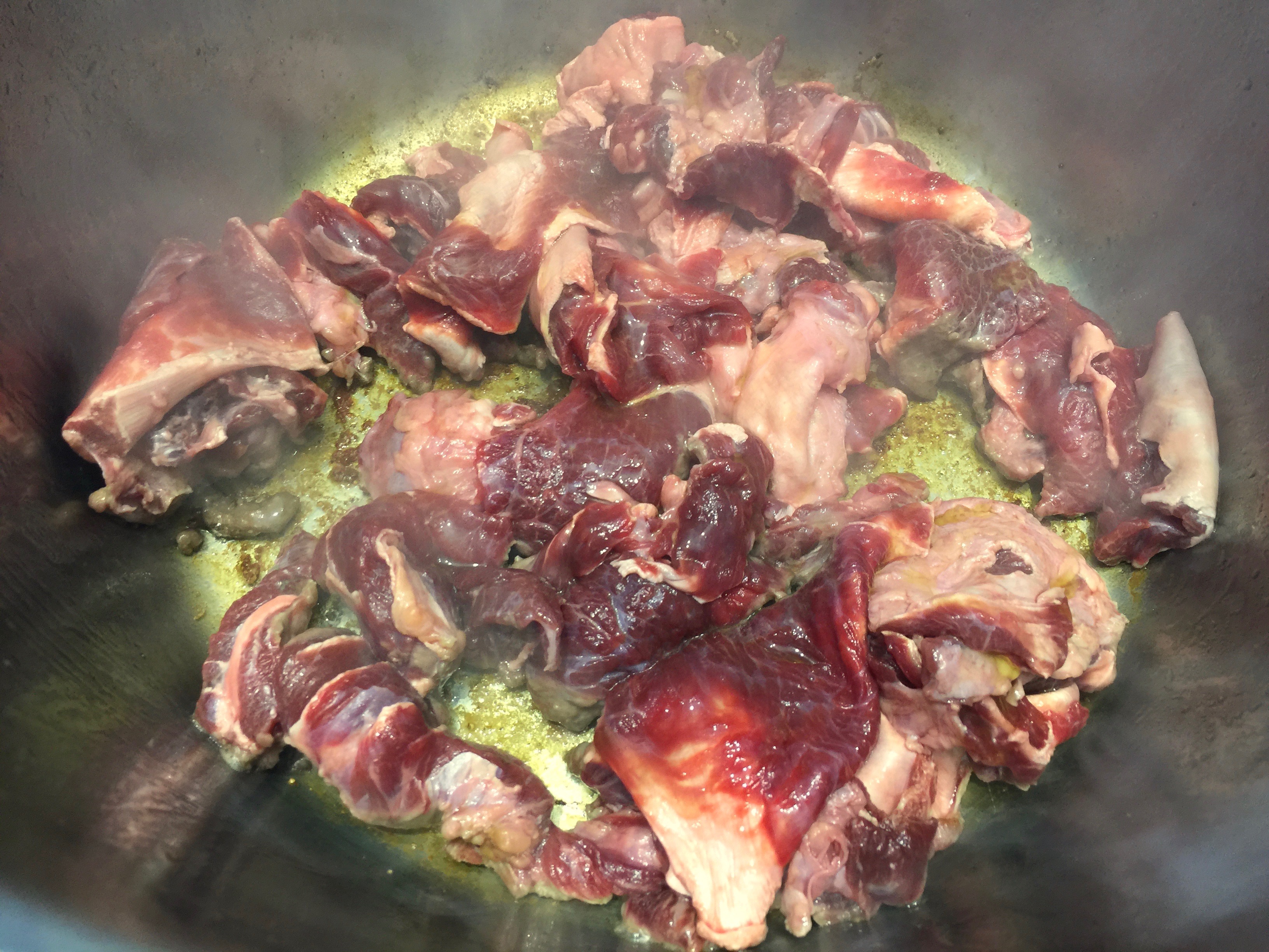 Limpiamos bien las carrilleras o le decimos al carnicero, si es de confianza, que nos las limpie bien, quitándole las membranas, las acumulaciones pequeñas de grasa y las zonas con fibras. Todos esos recortes los echamos en una sartén con un poco de aceite, a fuego moderado, para que se vayan tostando sin quemarse.