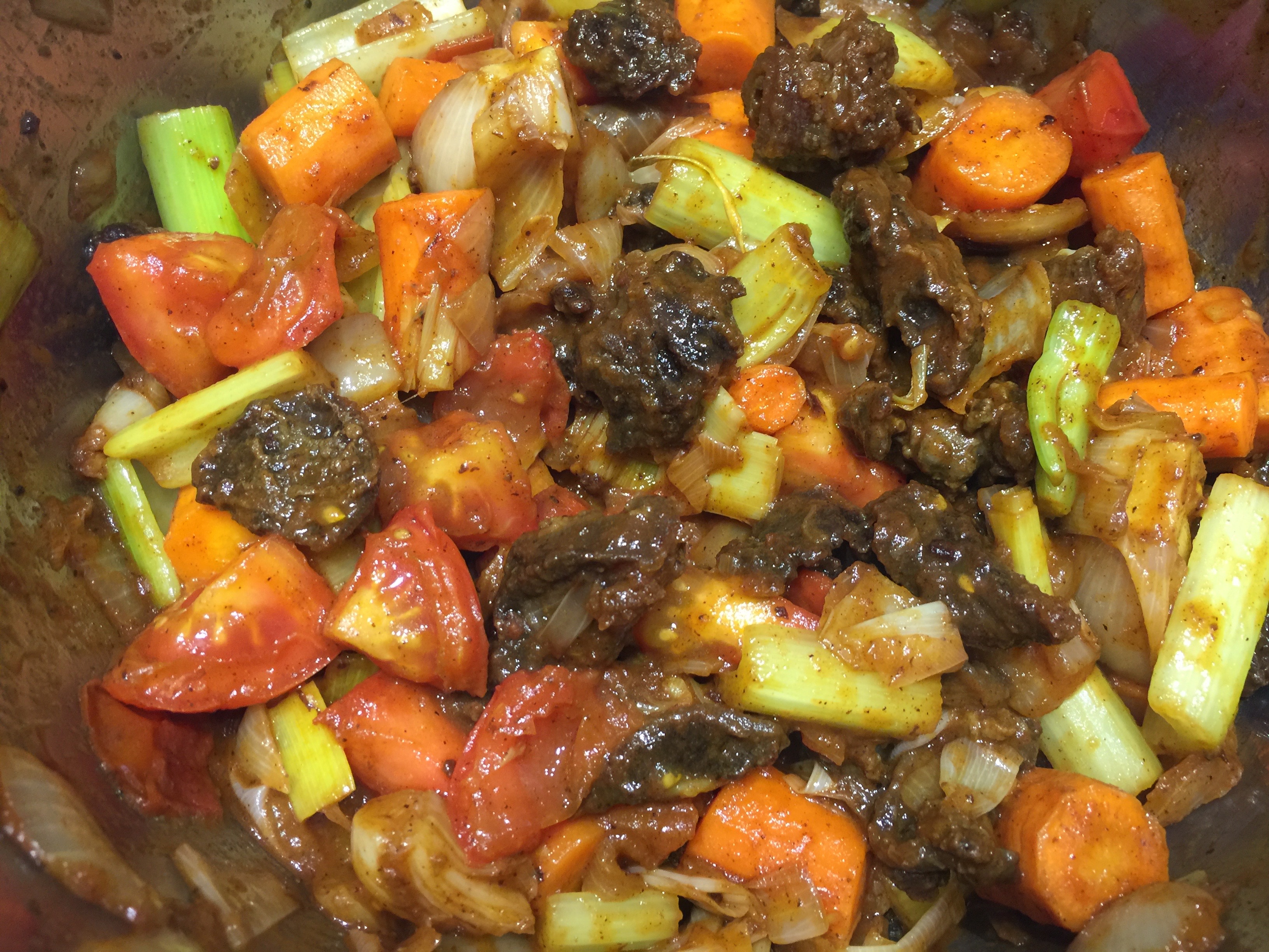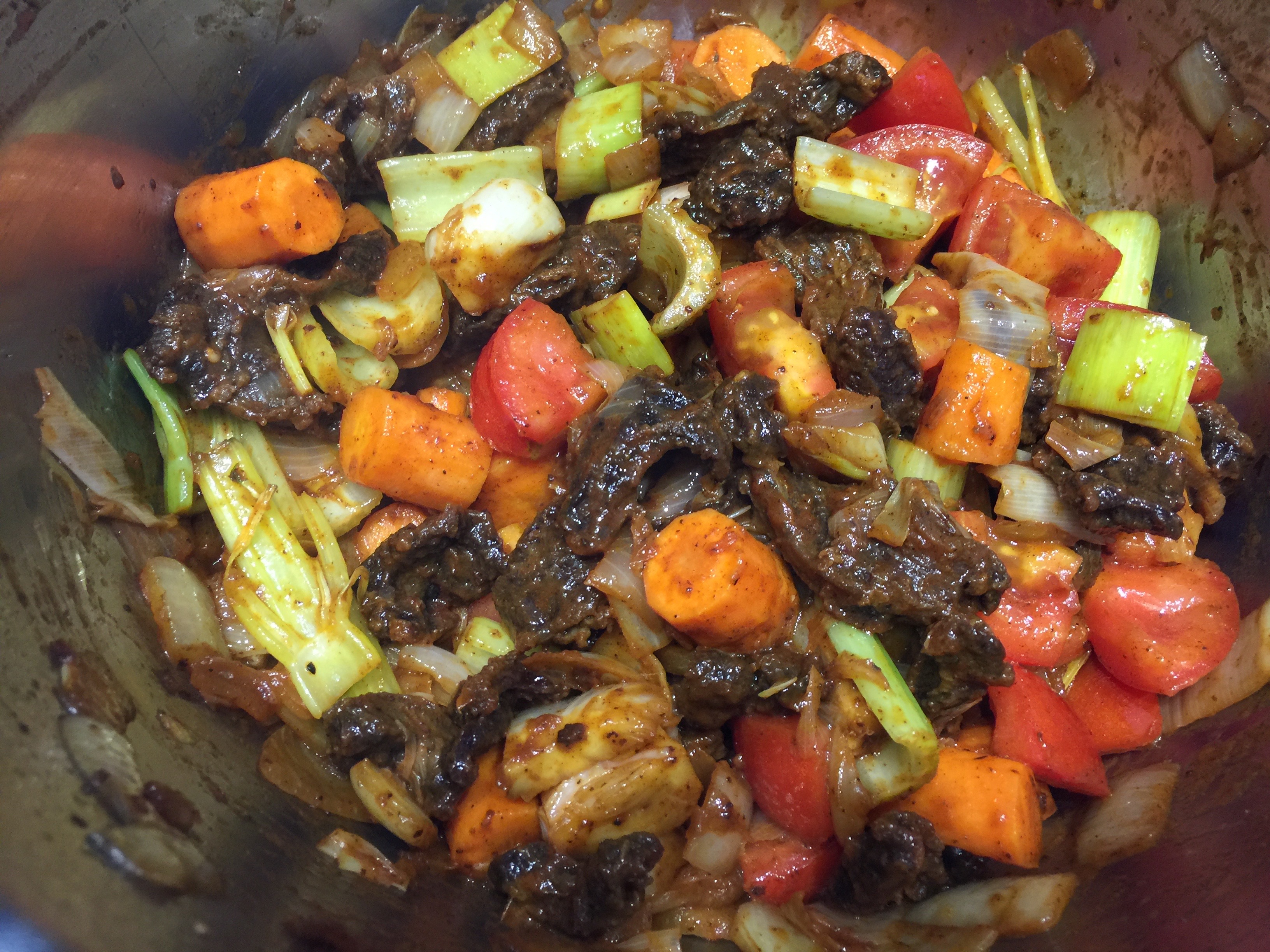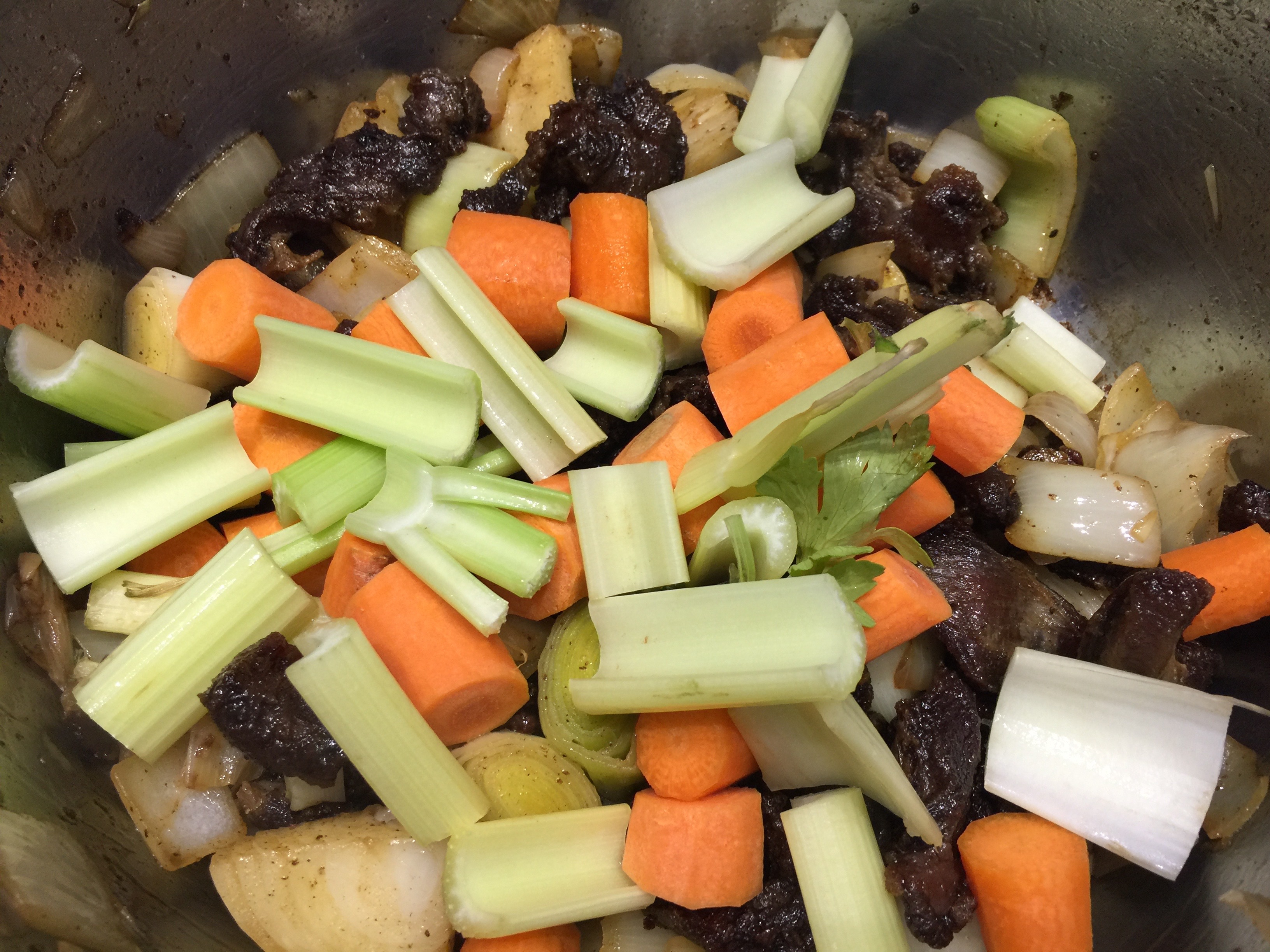 Cuando tenemos nuestros recortes muy doraditos, pero sin que se lleguen a quemar, les echamos la cebolla y el puerro a sudar, con una pizca de sal para ayudarlos. Cuando empiece a estar transparente, le ponemos la zanahoria y el apio.
