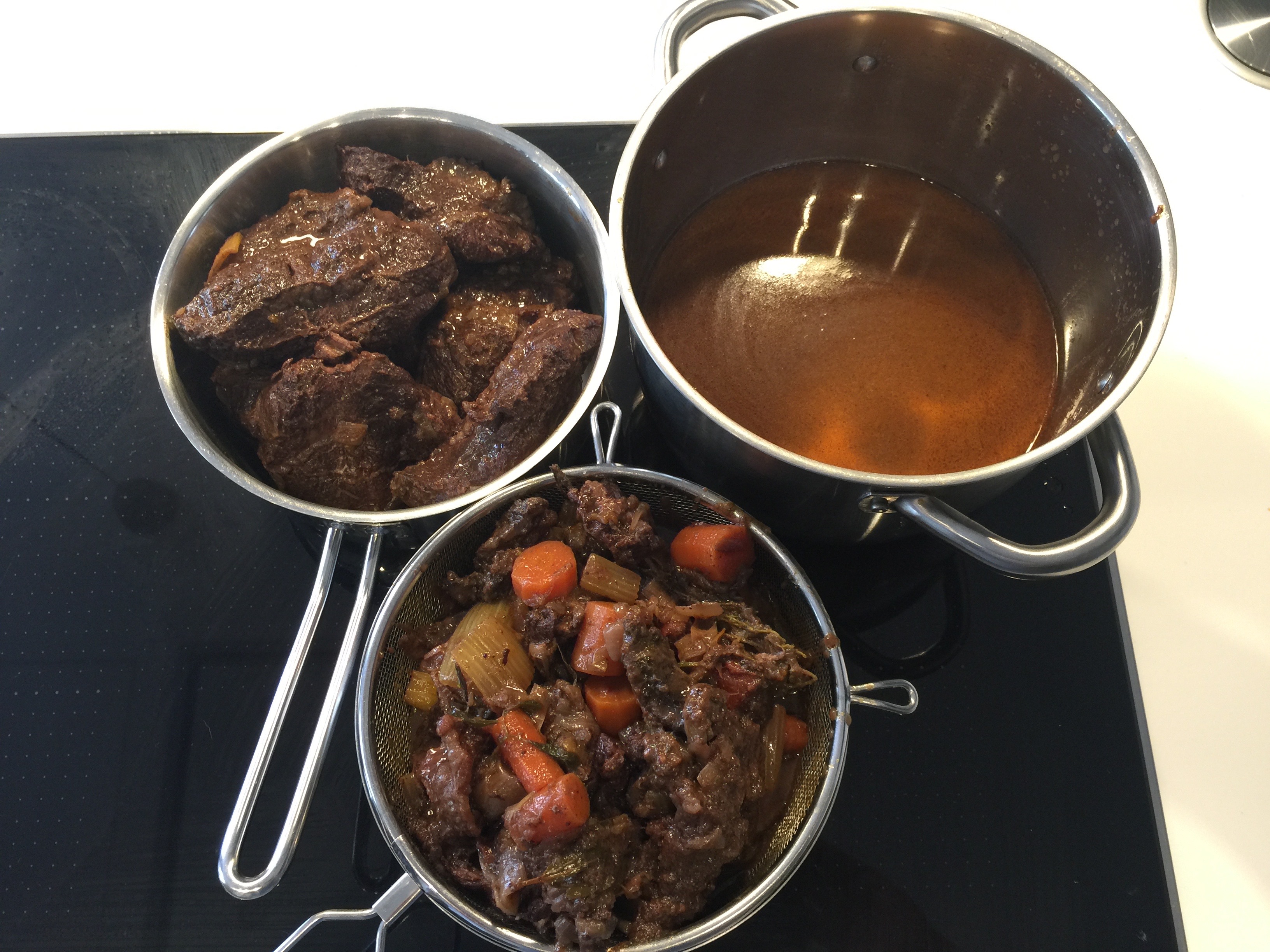 - Sacar del horno, colar y reducir a demi-glas la mitad del líquido.