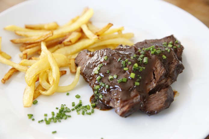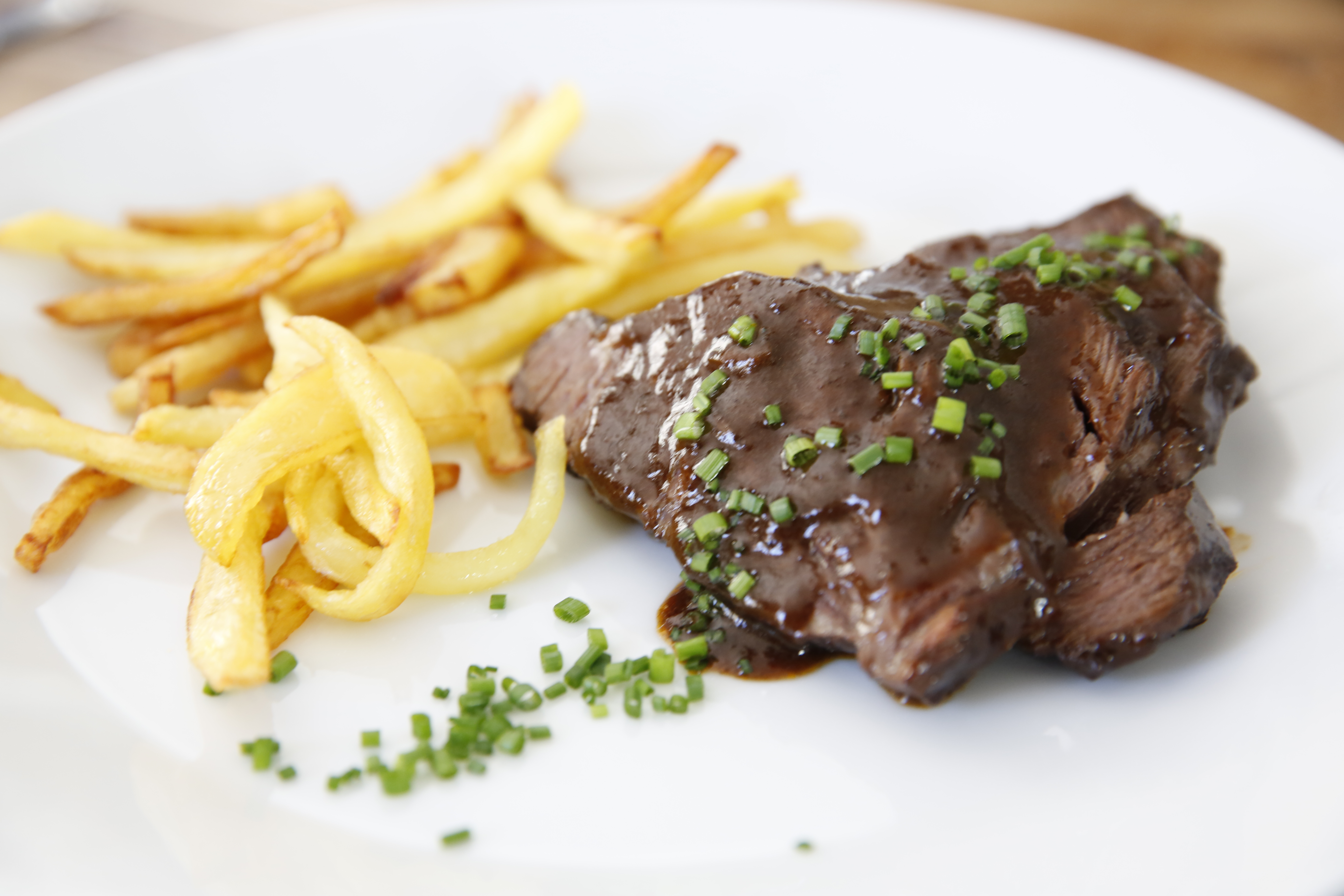 Finalmente, salseamos napándola por encima y a un lado colocamos las patatas. Picamos un poco de cebollino y lo espolvoreamos por encima de la carne.