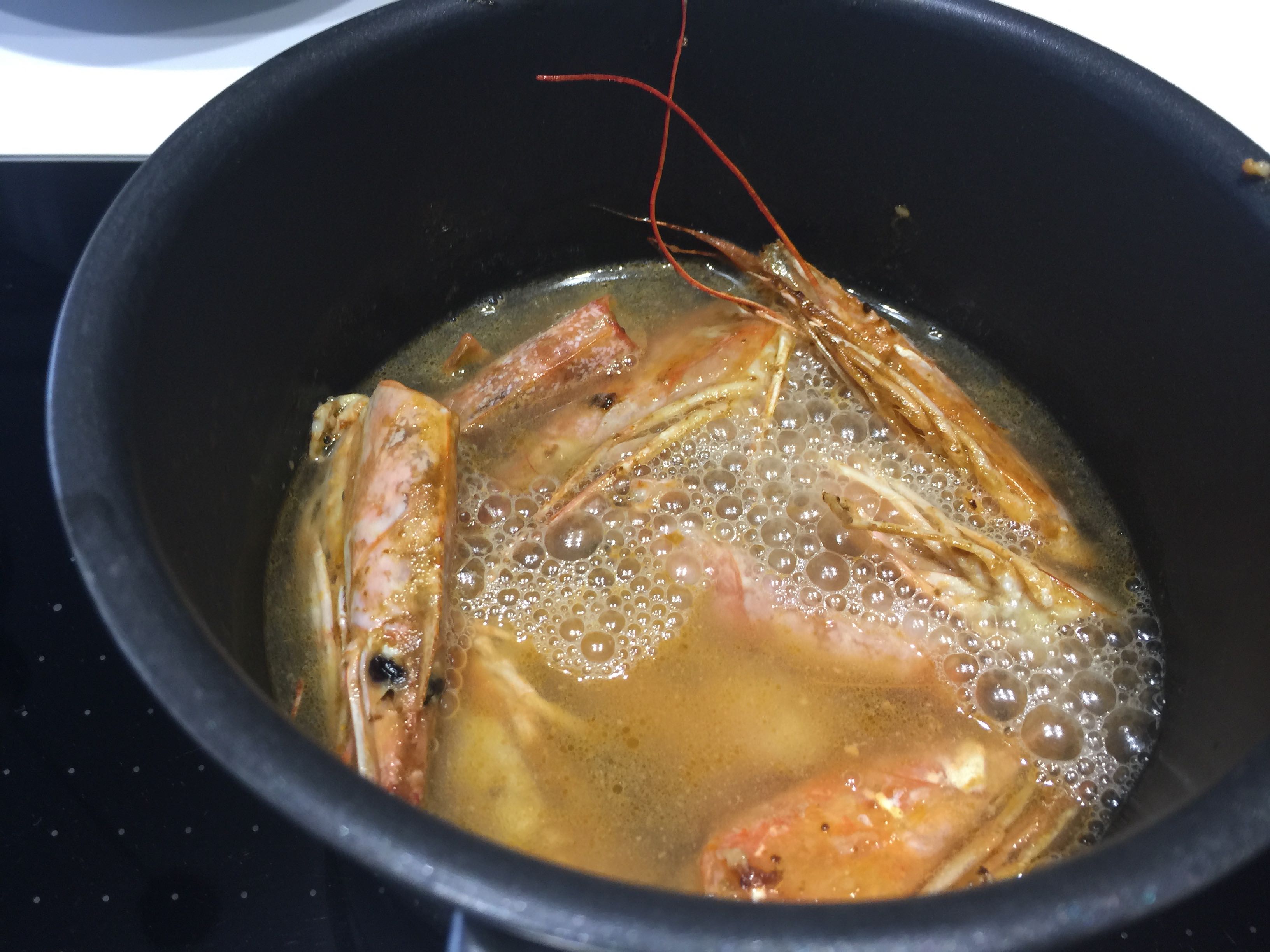 En una sartén del tamaño adecuado ponemos un poco de aceite de oliva, echamos las cabezas de los gambones y las salteamos, aplastándolas para que suelten todo su sabor, las sacamos y ponemos en un cazo pequeño con el agua de hidratar las colmenillas, bien colado, a que cuezan. Una vez cocidas a fuego bajo un rato, colamos y reservamos el líquido.