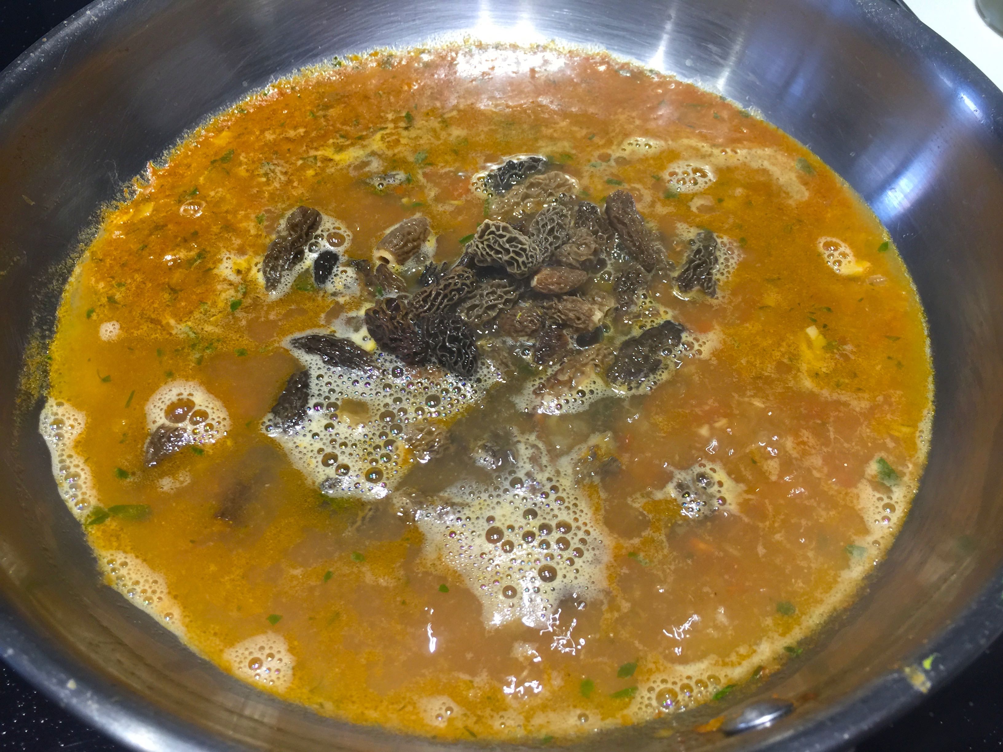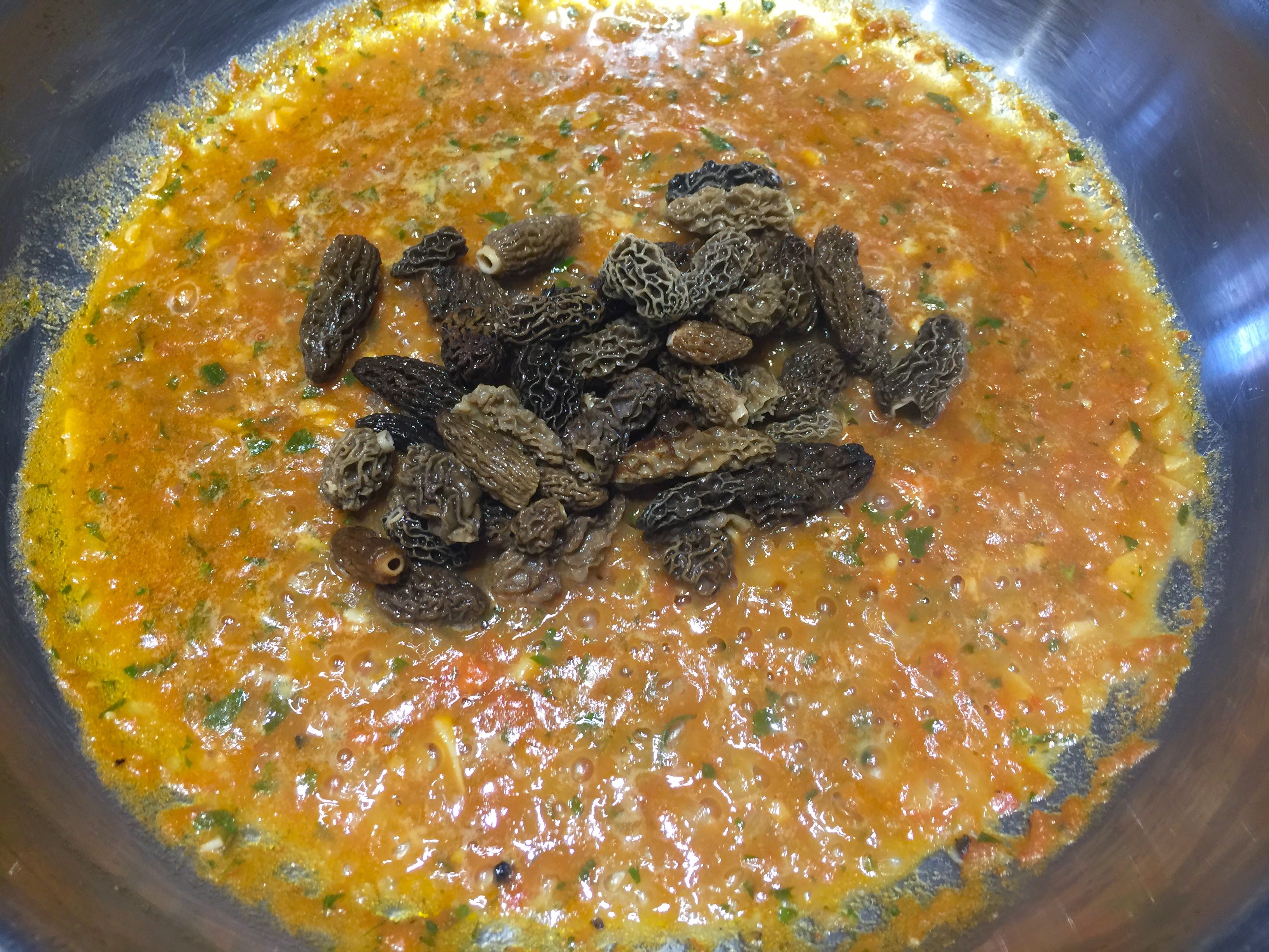 Las colmenillas, que lo normal es que las compremos deshidratadas, las ponemos en agua hirviendo, apagamos el fuego y las dejamos diez minutos, las sacamos después de ello y las aclaramos tres o cuatro veces para que no tengan restos de tierra que, por su forma, tienden a retener en las celdillas. Por su parte, el agua de rehidratarlas la colamos con un chino muy fino y la conservamos.