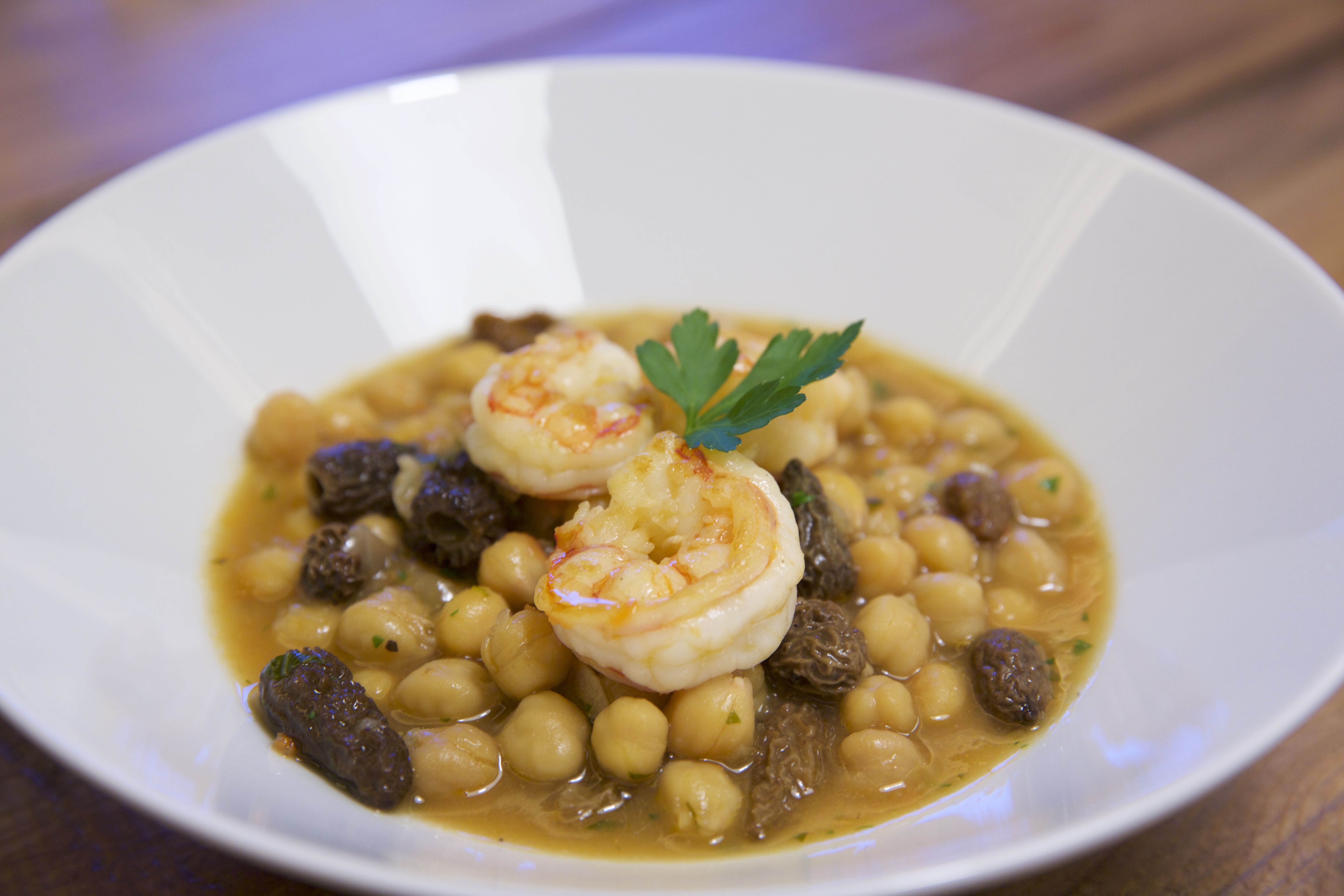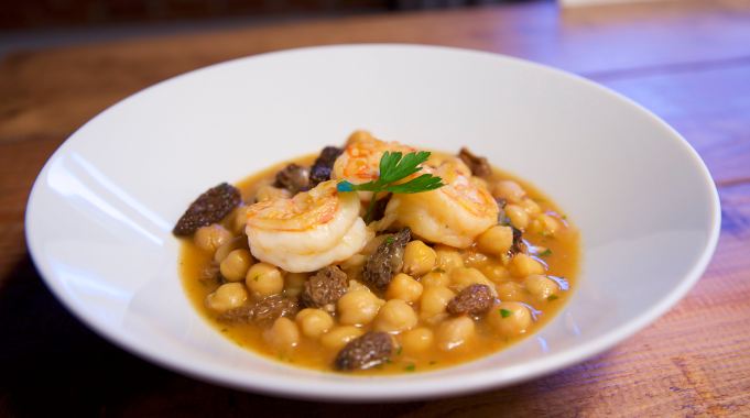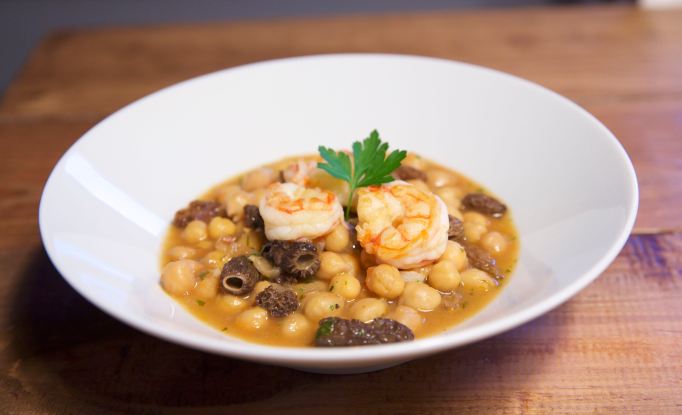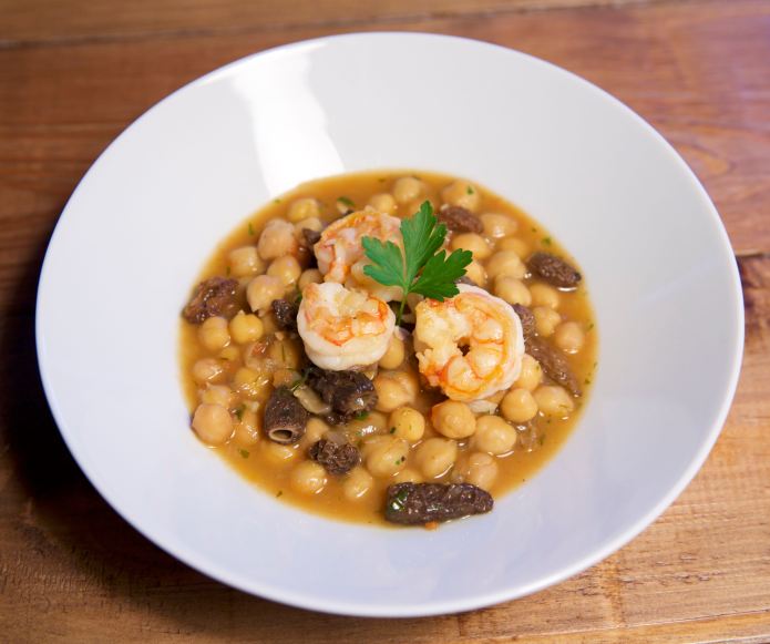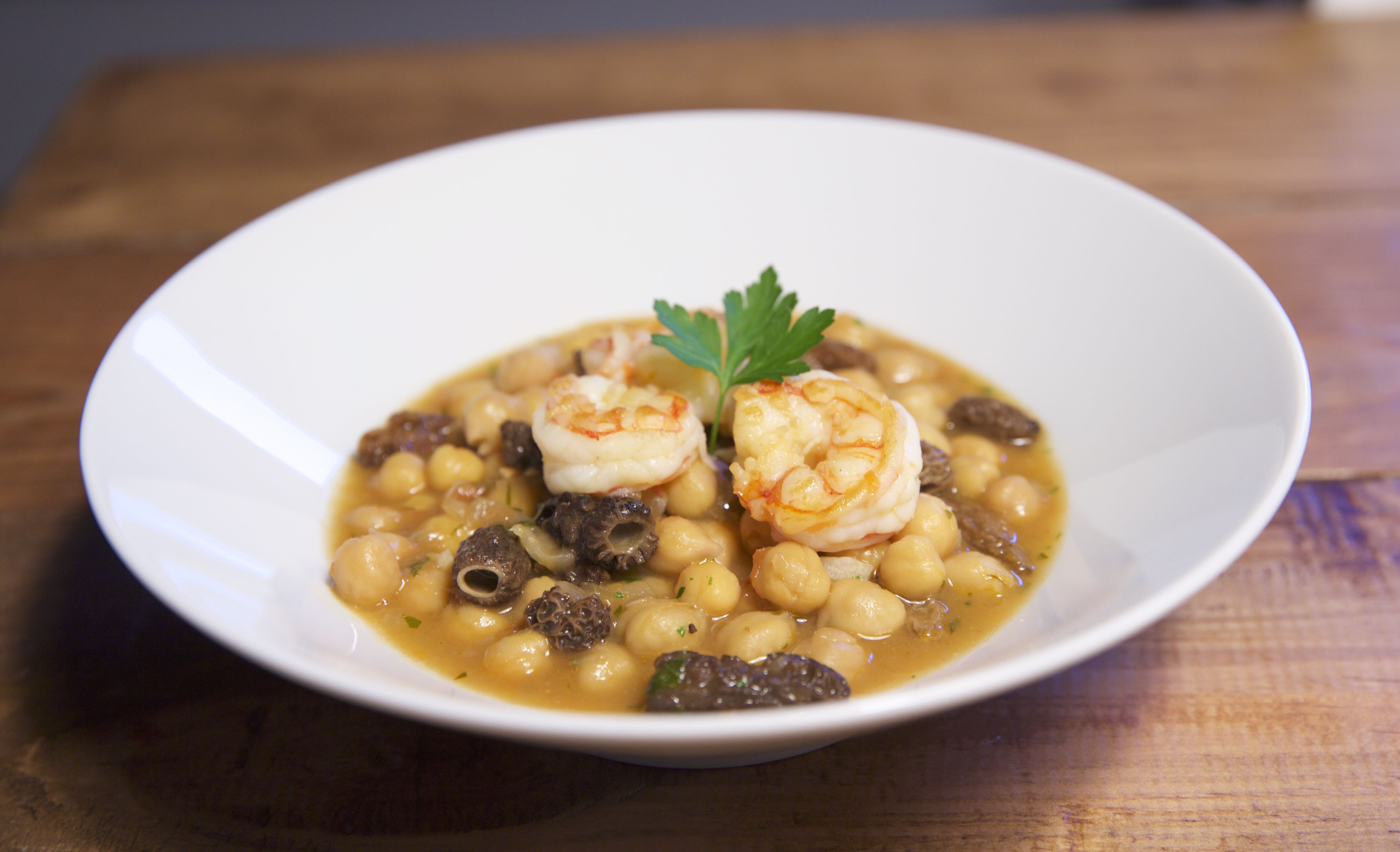 Después de esto, echamos a la sartén la cebolla y el ajo muy picado con una pizca de sal, pochamos y añadimos el tomate y el perejil picado, rehogamos un poco, añadimos el vino blanco y lo dejamos evaporar. Incorporamos entonces las colmenillas, salteamos un poco y añadimos los garbanzos y el agua de cocer las cabezas, dejamos que hierva y lo bajamos dejándolo diez minutos para que evapore un poco el líquido y, de esta forma, se intensifiquen los sabores.