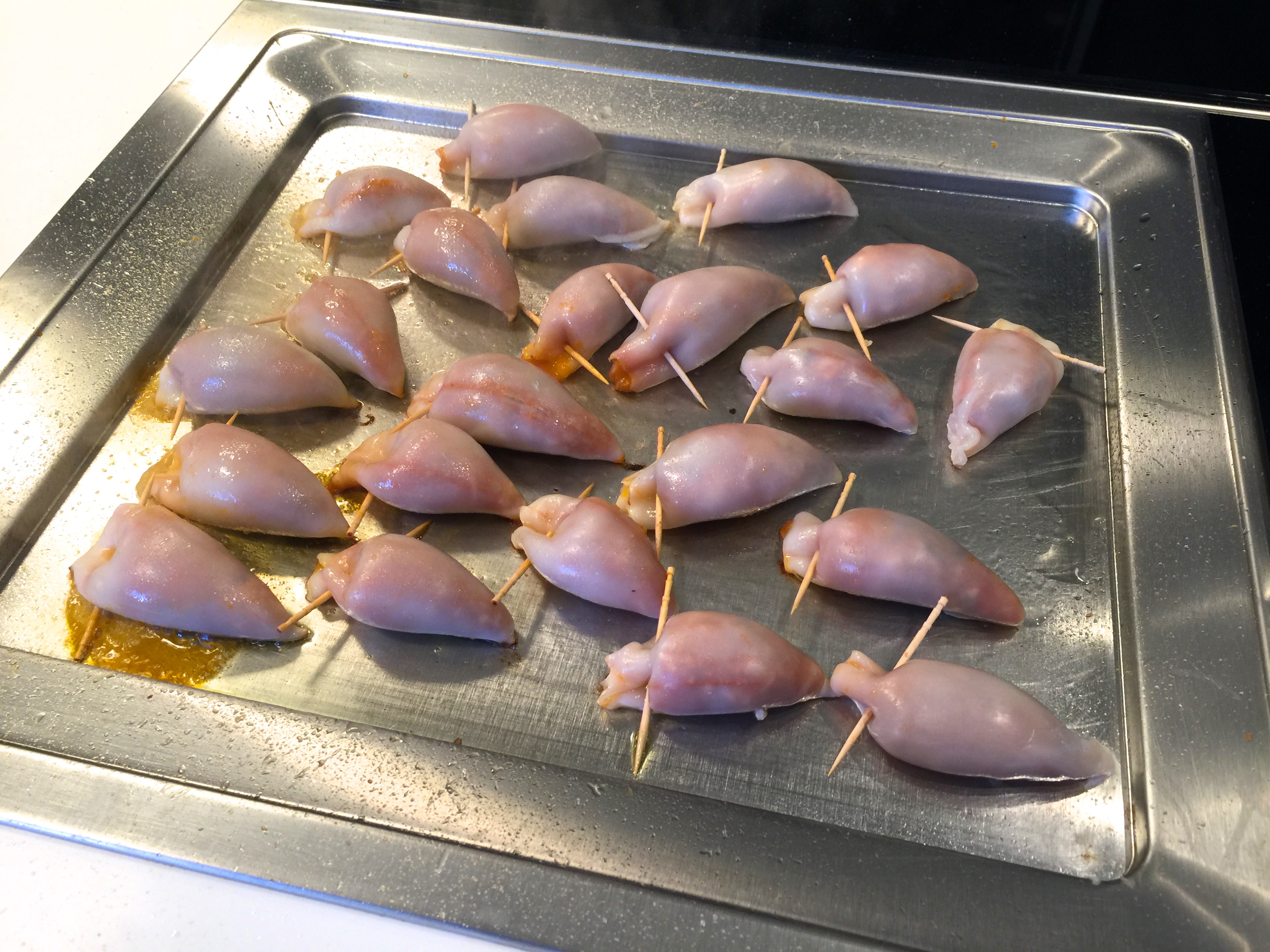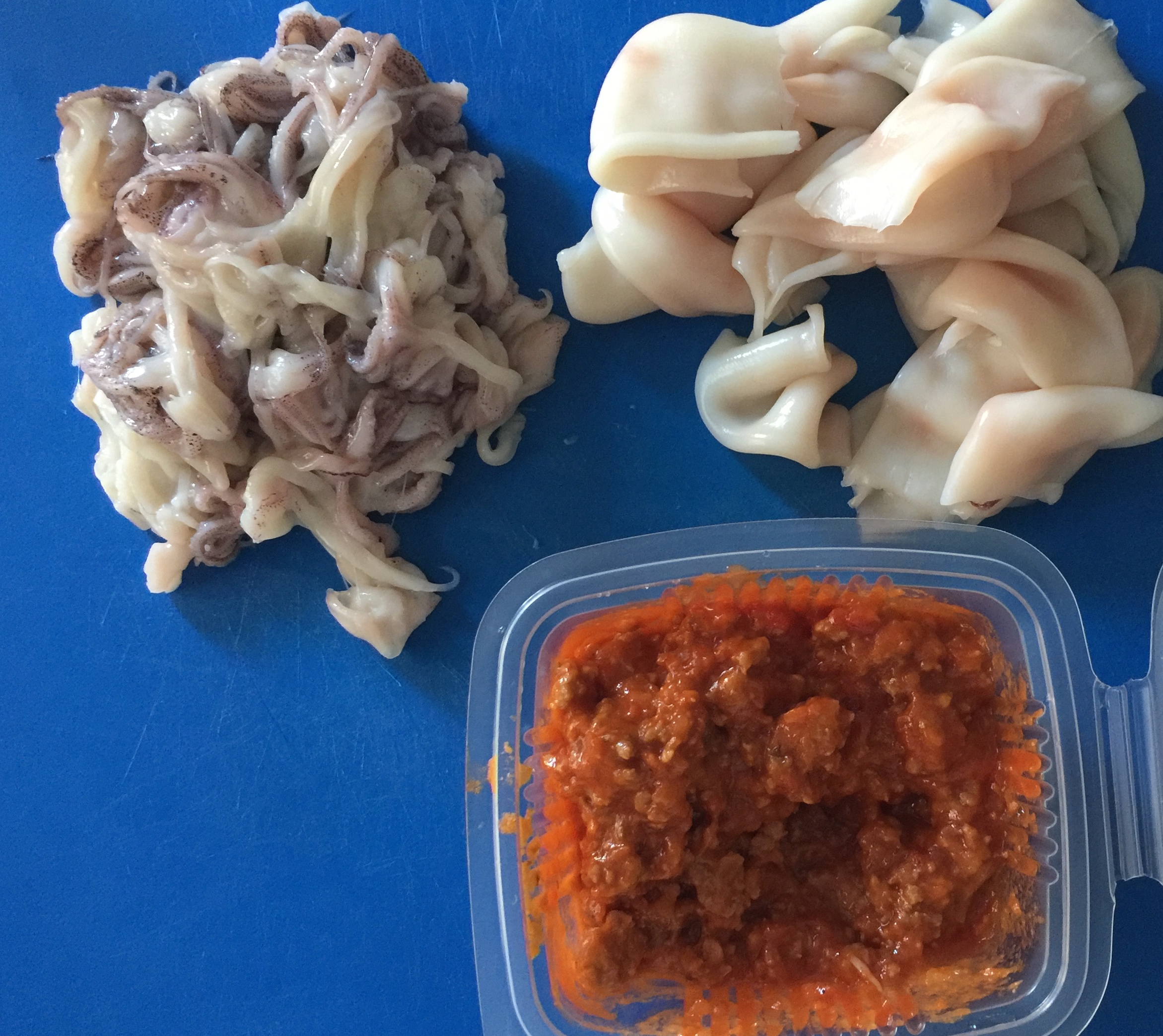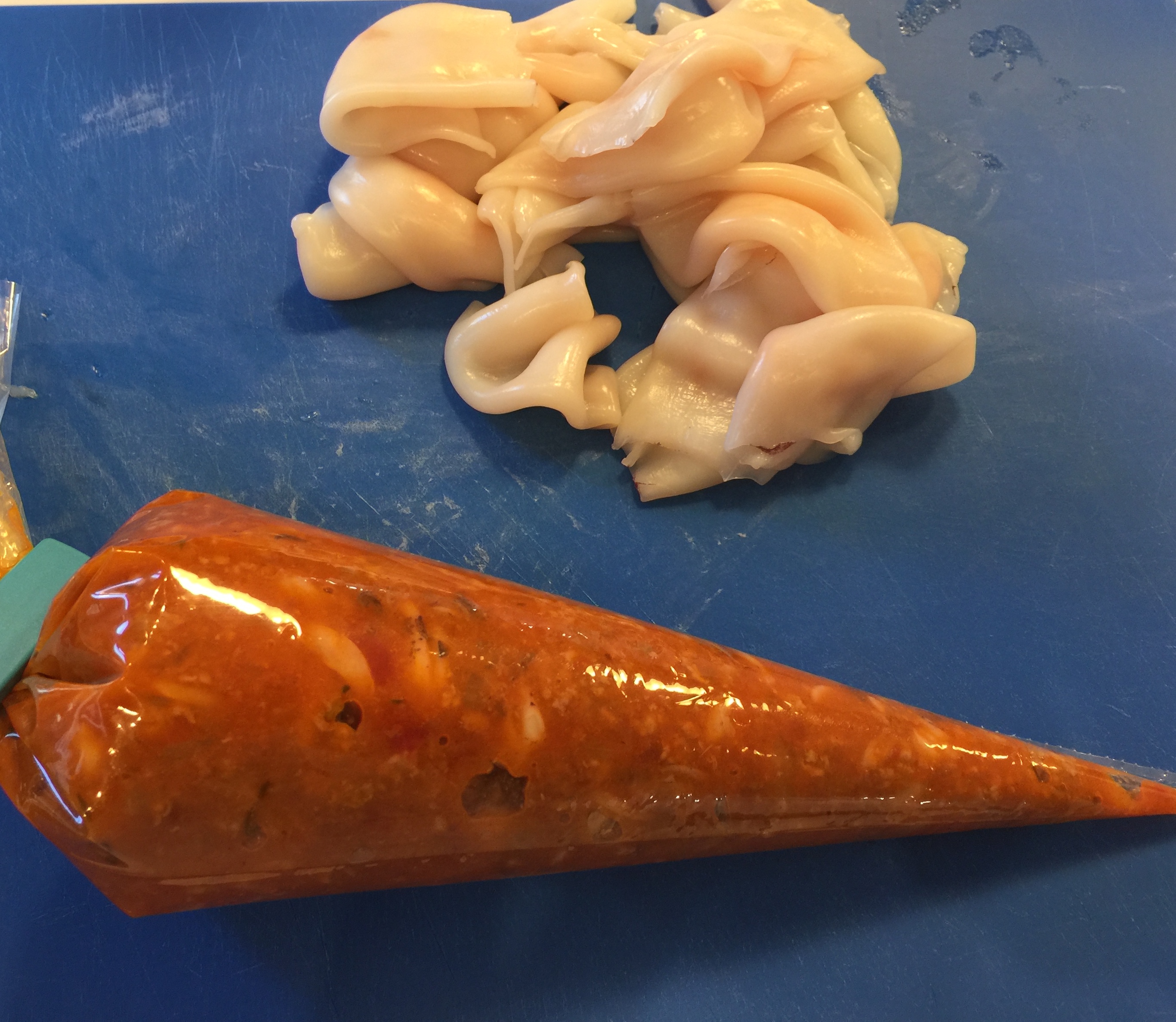 Este relleno se puede meter en los chipirones con una cucharita pero, si se puede utilizar una manga pastelera de plástico para introducirlo haciendo un agujero suficiente para que salgan las patitas y rellenar con esa manga, se tarda la cuarta parte del tiempo. Es importante no rellenar nada más que la mitad puesto que los chipirones encogen mucho y, si los llenamos, se saldrá.