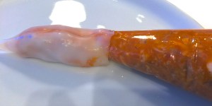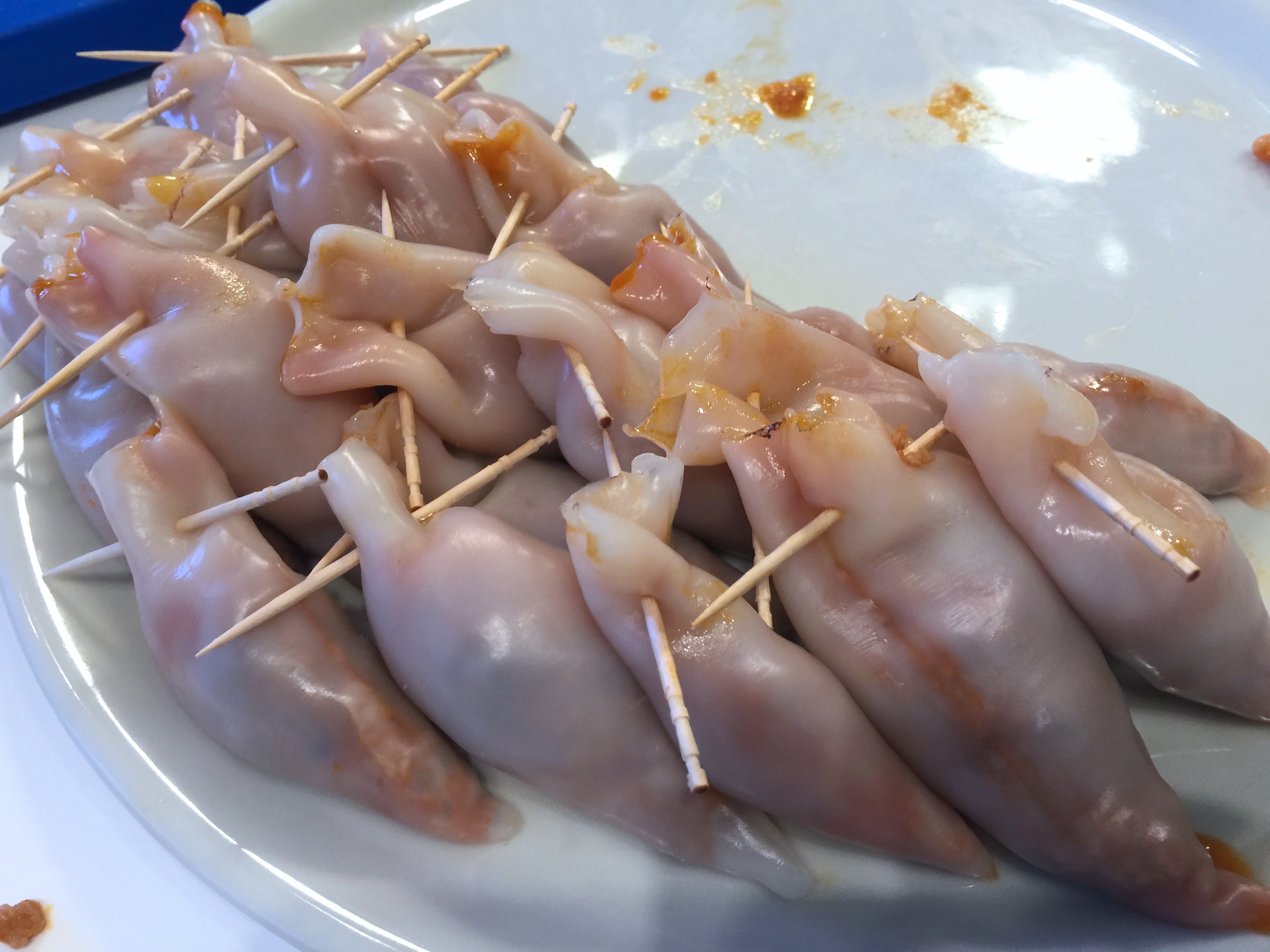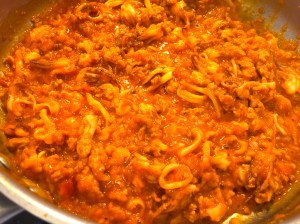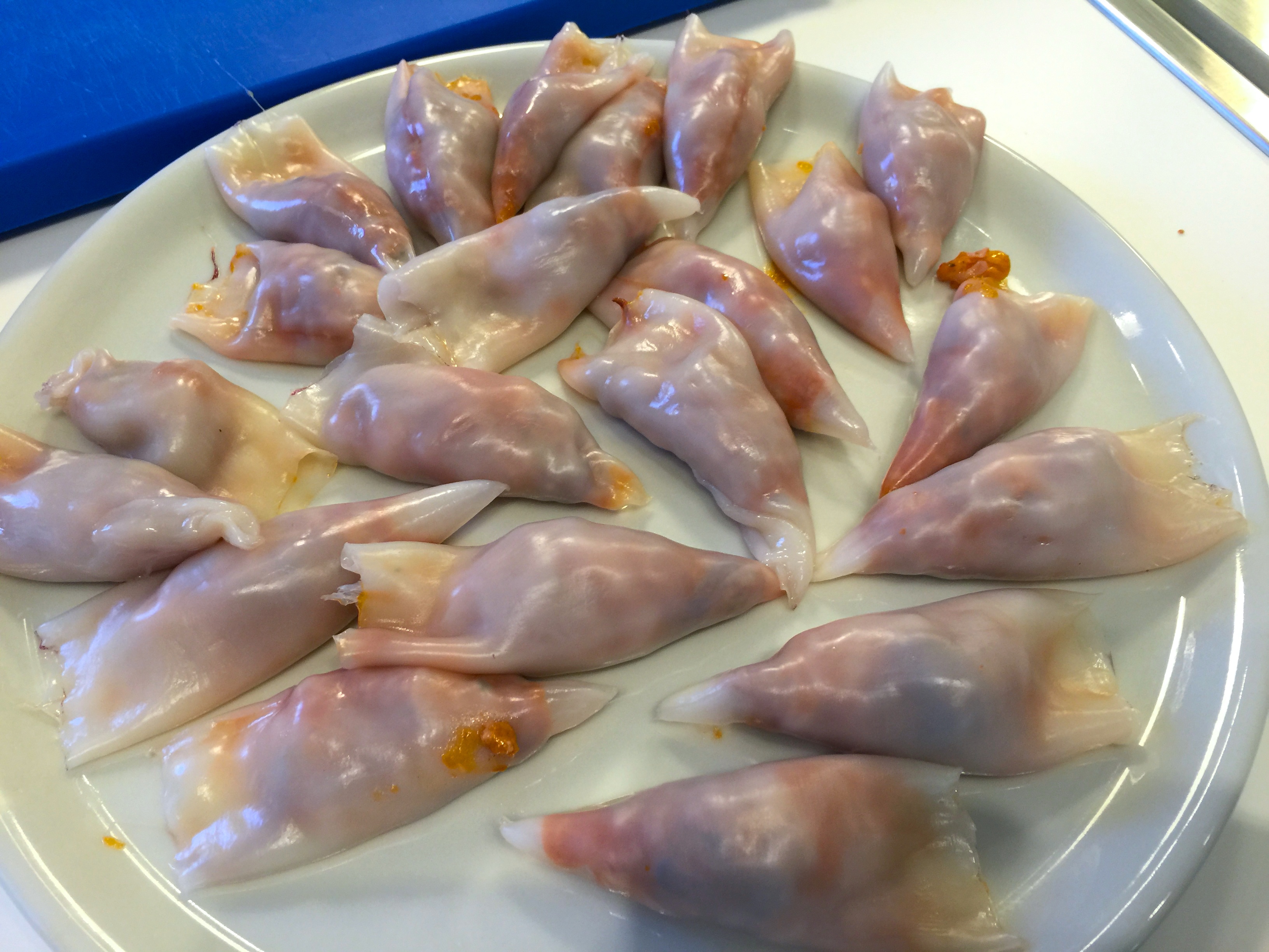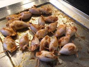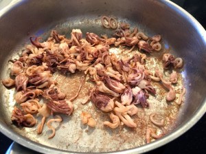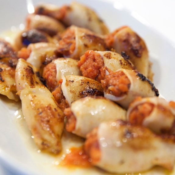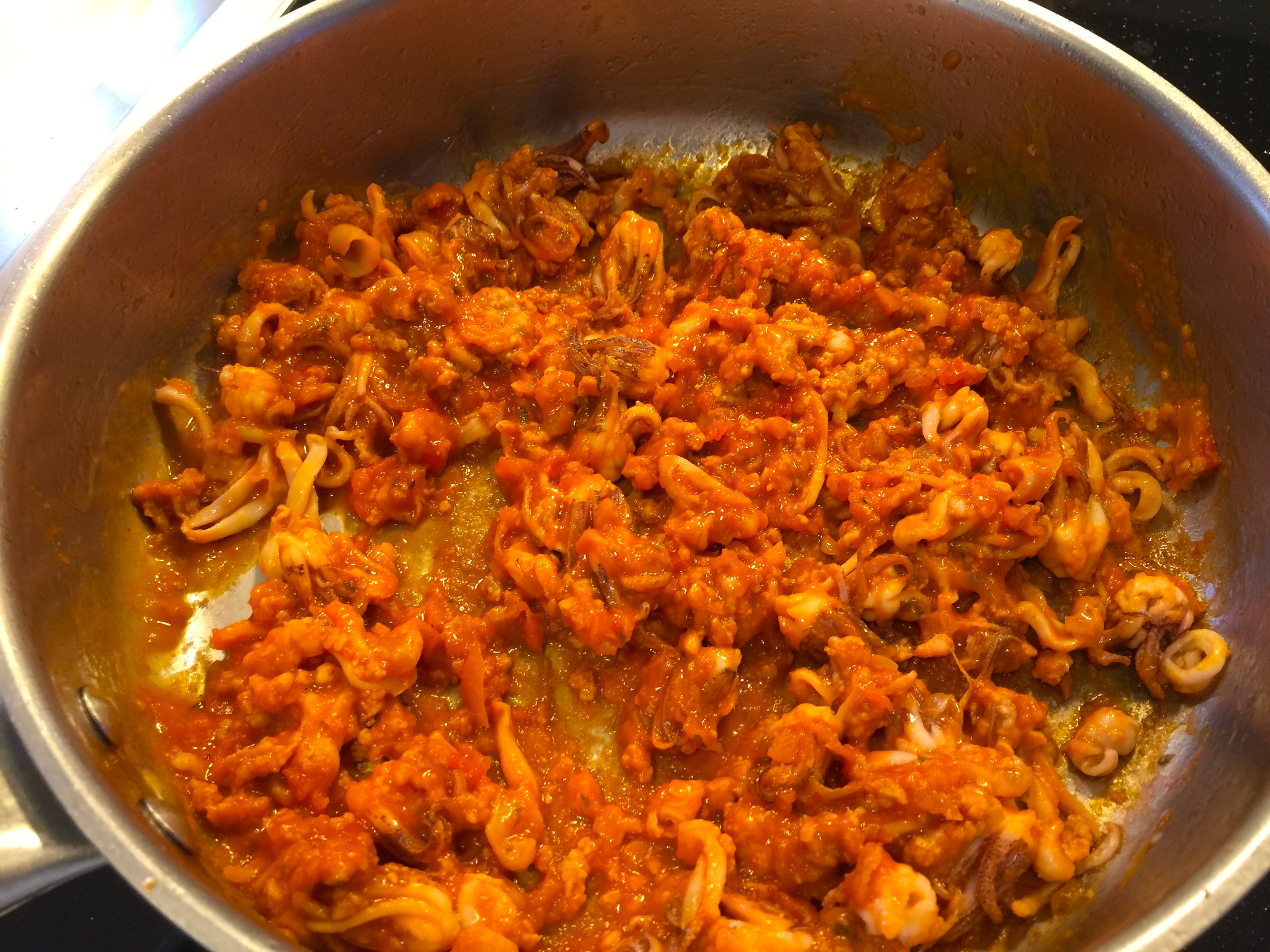 Este relleno se puede meter en los chipirones con una cucharita pero, si se puede utilizar una manga pastelera de plástico para introducirlo haciendo un agujero suficiente para que salgan las patitas y rellenar con esa manga, se tarda la cuarta parte del tiempo. Es importante no rellenar nada más que la mitad puesto que los chipirones encogen mucho y, si los llenamos, se saldrá.