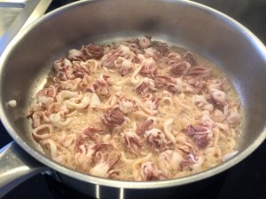 En una sartén ponemos un chorro de aceite de oliva y, cuando esté muy caliente, ponemos en ella las patitas y las aletas. Se trata de una cocción externa rápida porque, si se pone a una temperatura baja, las patitas empezarán a echar agua y se cocerán, por lo que las salteamos y reservamos.