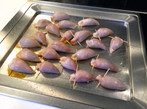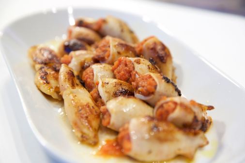 Seguidamente, rellenamos los chipirones y cosemos el exterior con un palillo, calentamos la plancha o sartén, echamos aceite de oliva y los salteamos hasta que tomen un aspecto dorado exterior. Una vez hechos, los sacamos y tenemos dos posibilidades, la primera es quitarles simplemente el palillo y la segunda consiste en cortar ese borde para que queden más regulares y se les vea el interior, siendo más estético el resultado de la segunda opción.