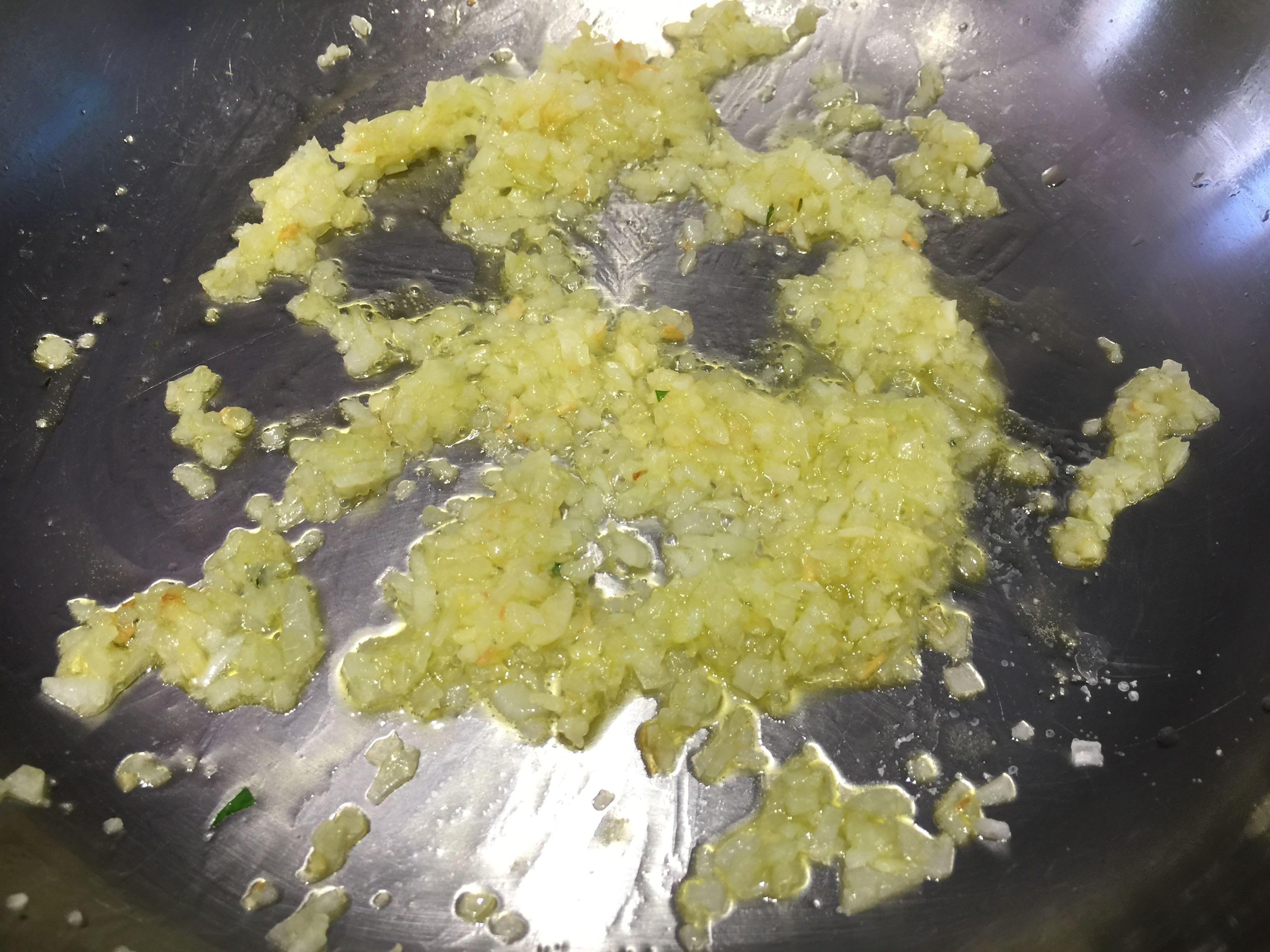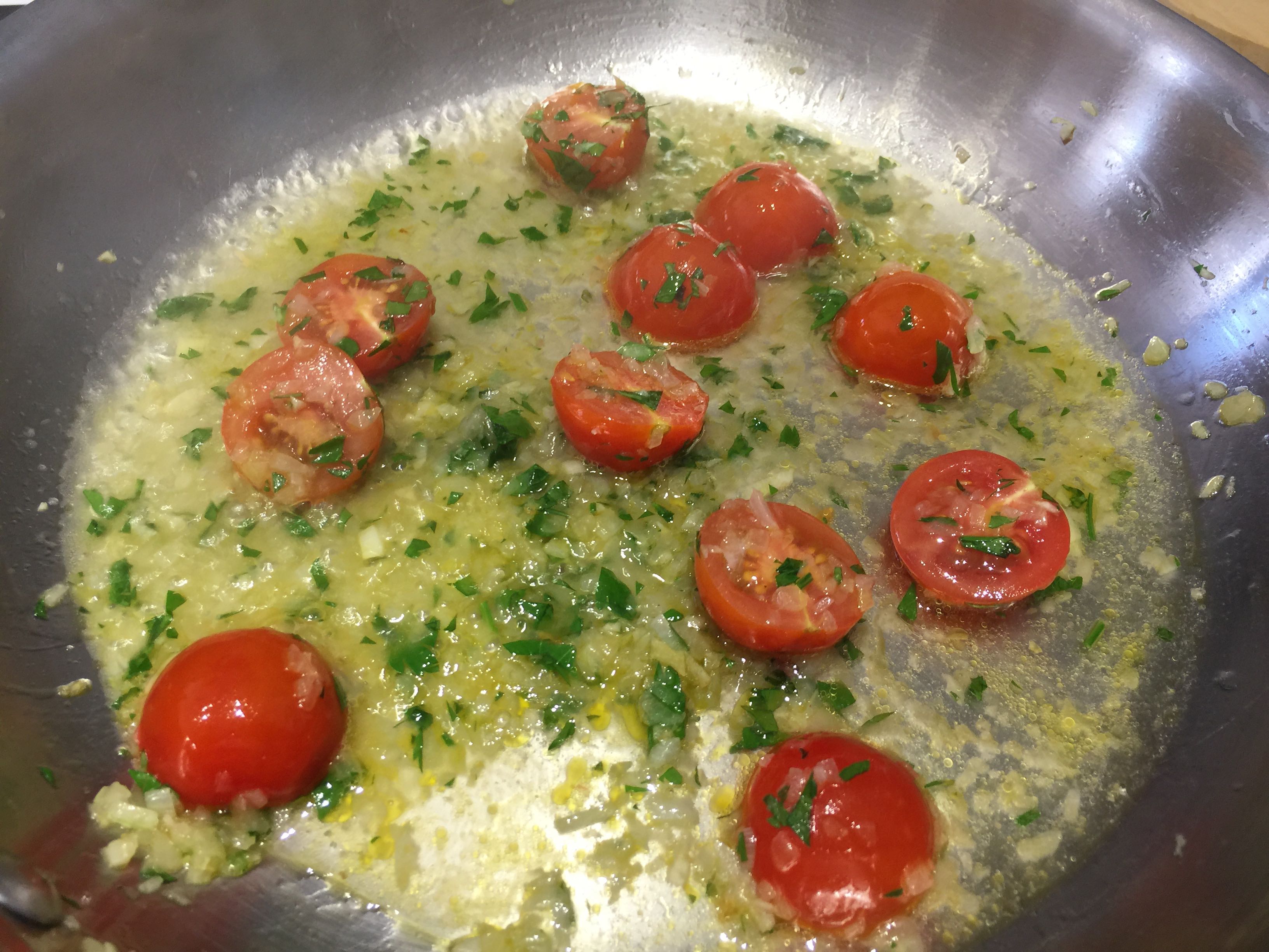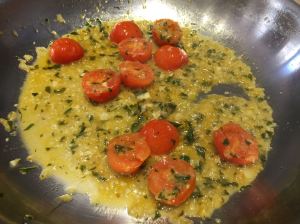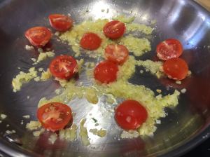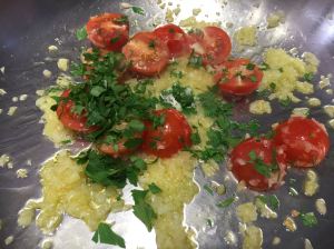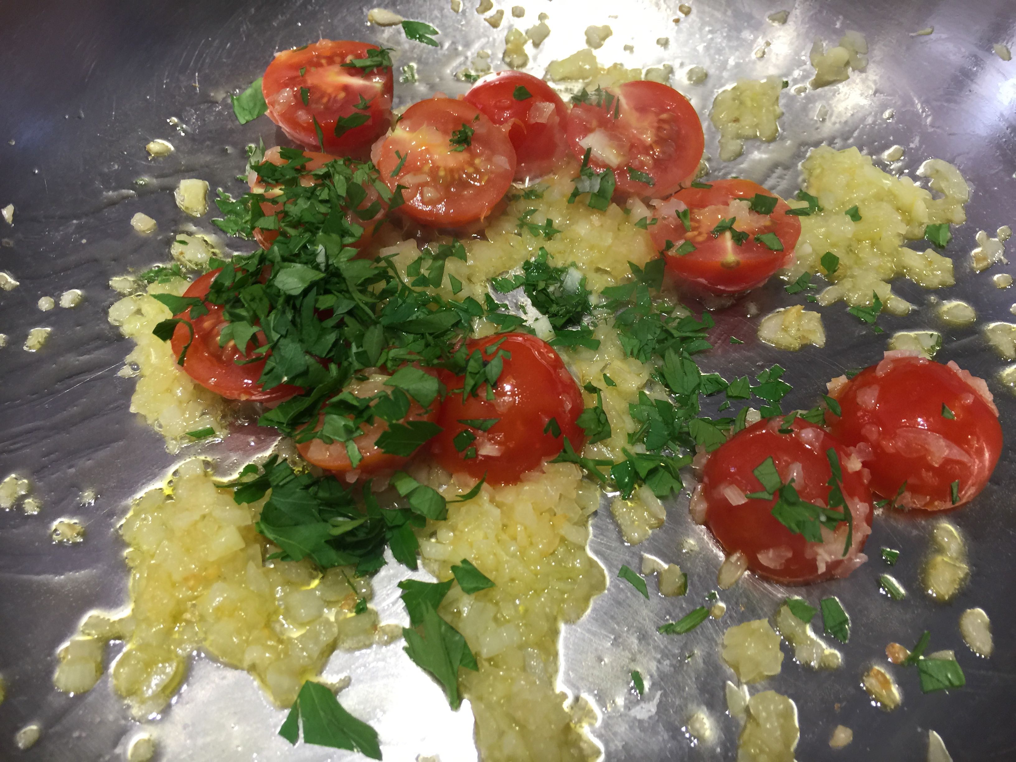 Seguidamente, ponemos la sartén con aceite y pochamos cebolla y ajo en ella, cuando empieza a estar transparente le echamos los tomates y el perejil picado, lo rehogamos todo, le echamos un par de cucharadas del agua de la cocción de los espagueti y, en este momento, echamos los espagueti al agua hirviendo.