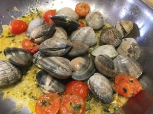 A continuación, picamos la cebolla, el ajo y el perejil. En cuanto a los tomates, dependiendo del tamaño, los dejamos enteros, los partimos a la mitad o en cuartos. Asimismo, lavamos bien las almejas, poniéndolas en agua fría abundante para que suelten, si la tienen, los restos de arena.