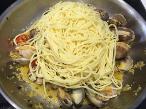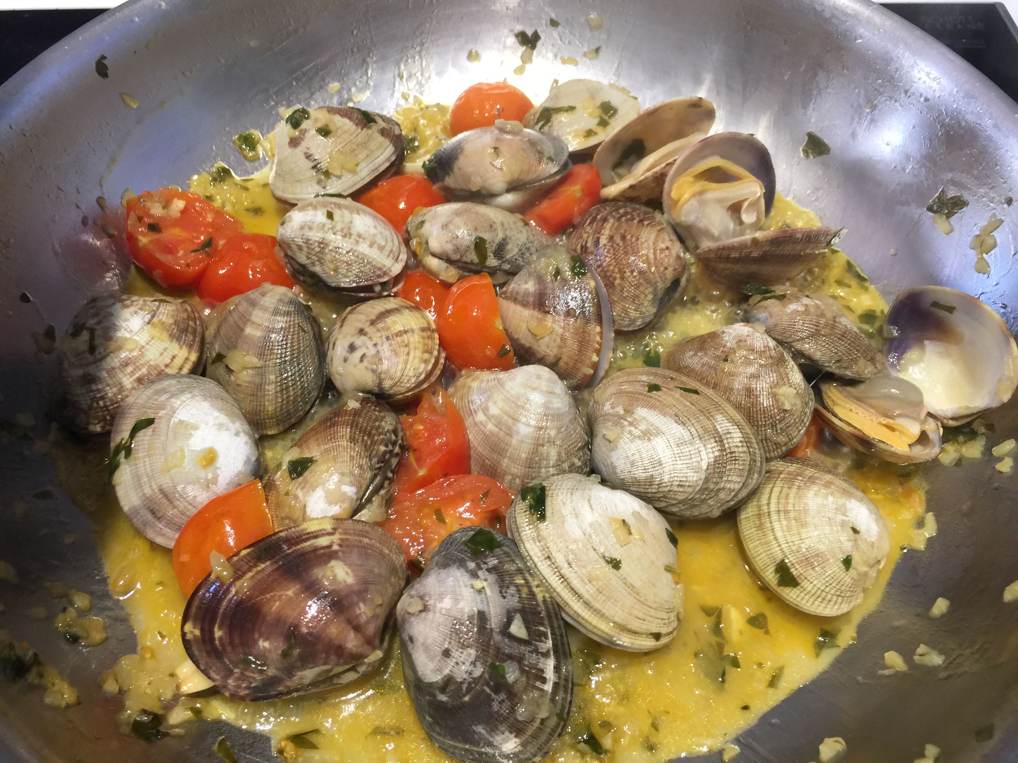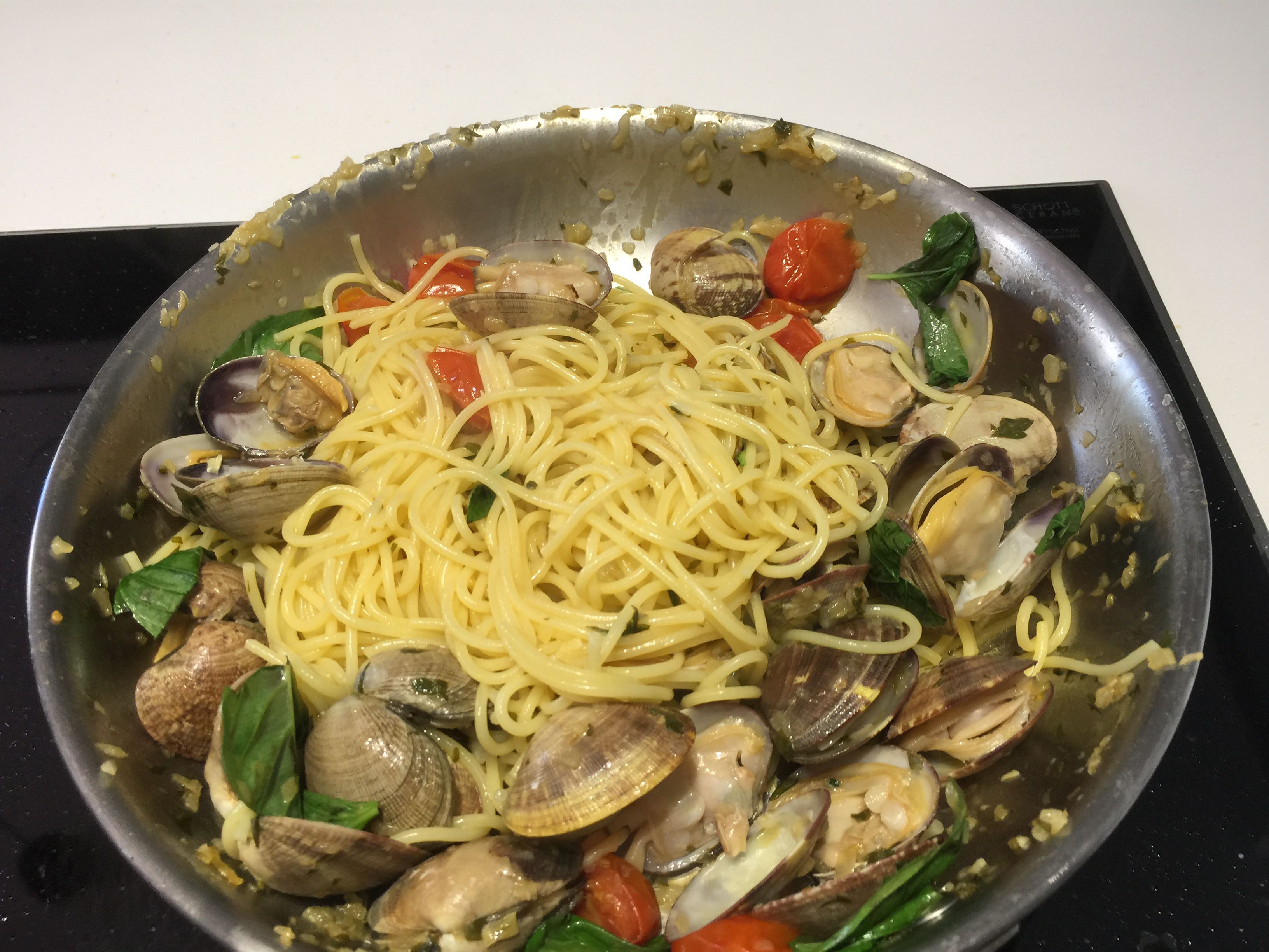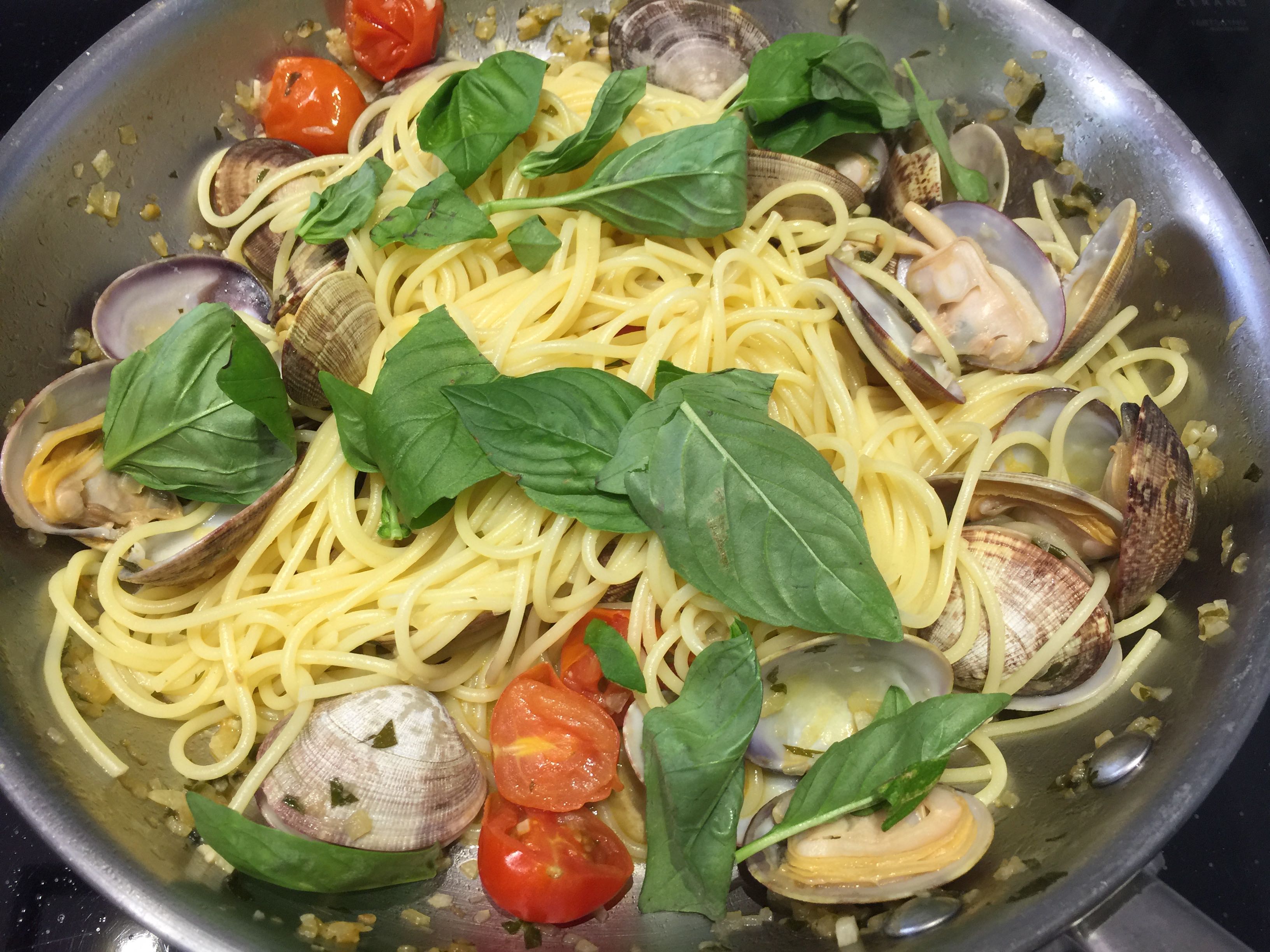 Cuando el agua está consumida, echamos el vino blanco y lo dejamos en ebullición hasta que esté casi seco. En ese momento, echamos las almejas, tapamos, a fuego medio, y vamos controlando pero en 2-3 minutos están abiertas, vamos moviendo la sartén para que pasen las de abajo arriba y todas estén por igual. En este punto, la pasta debería de estar ya, la escurrimos y la echamos encima, los movemos con la propia sartén sin utilizar paleta o cuchara, salvo que no se sepa hacer de otra manera, rectificamos de sal, le echamos pimienta, las hojas de albahaca enteras o troceadas por encima y lo servimos en el plato.
