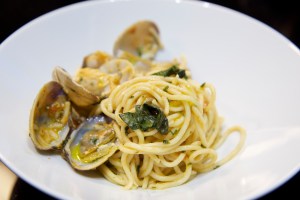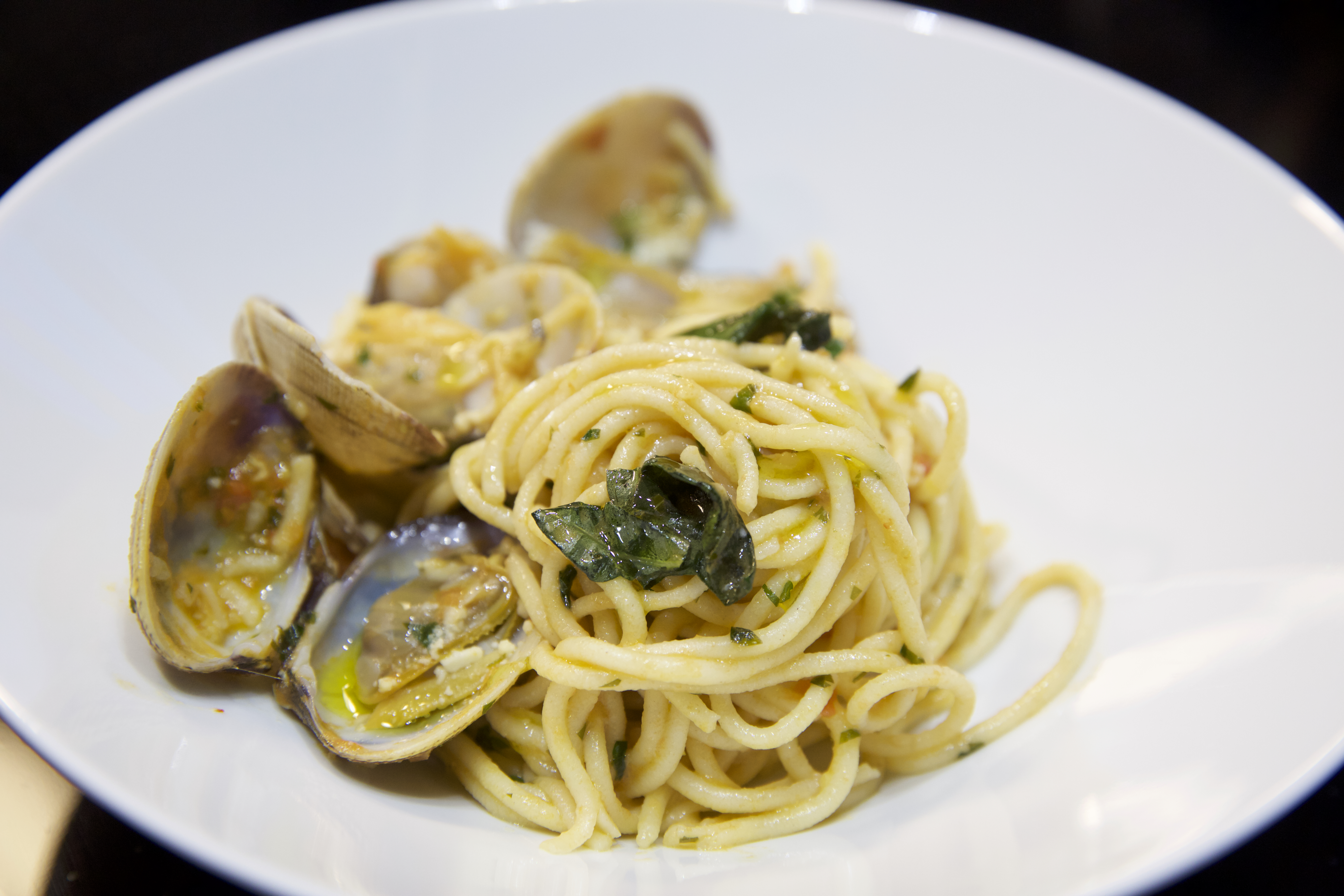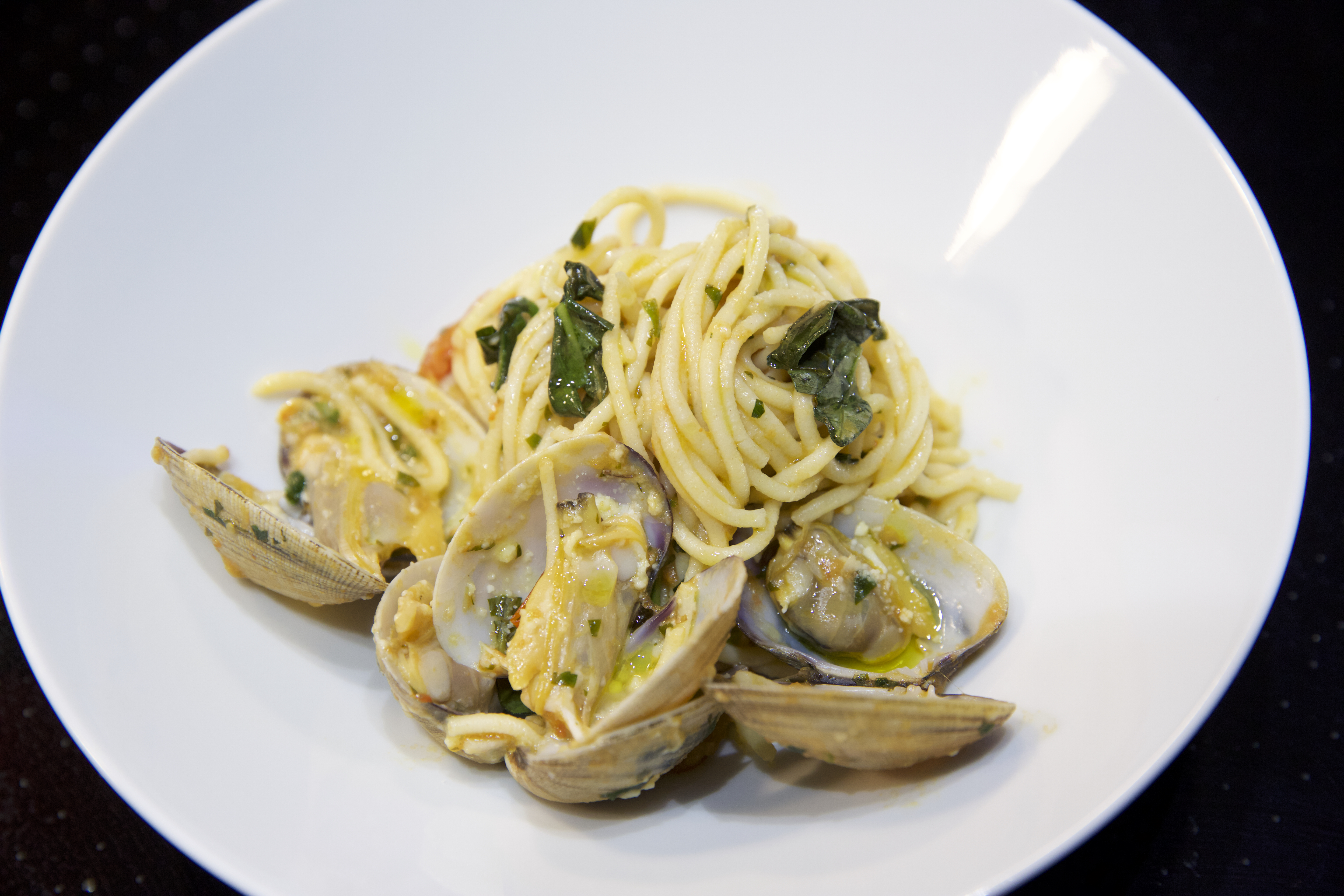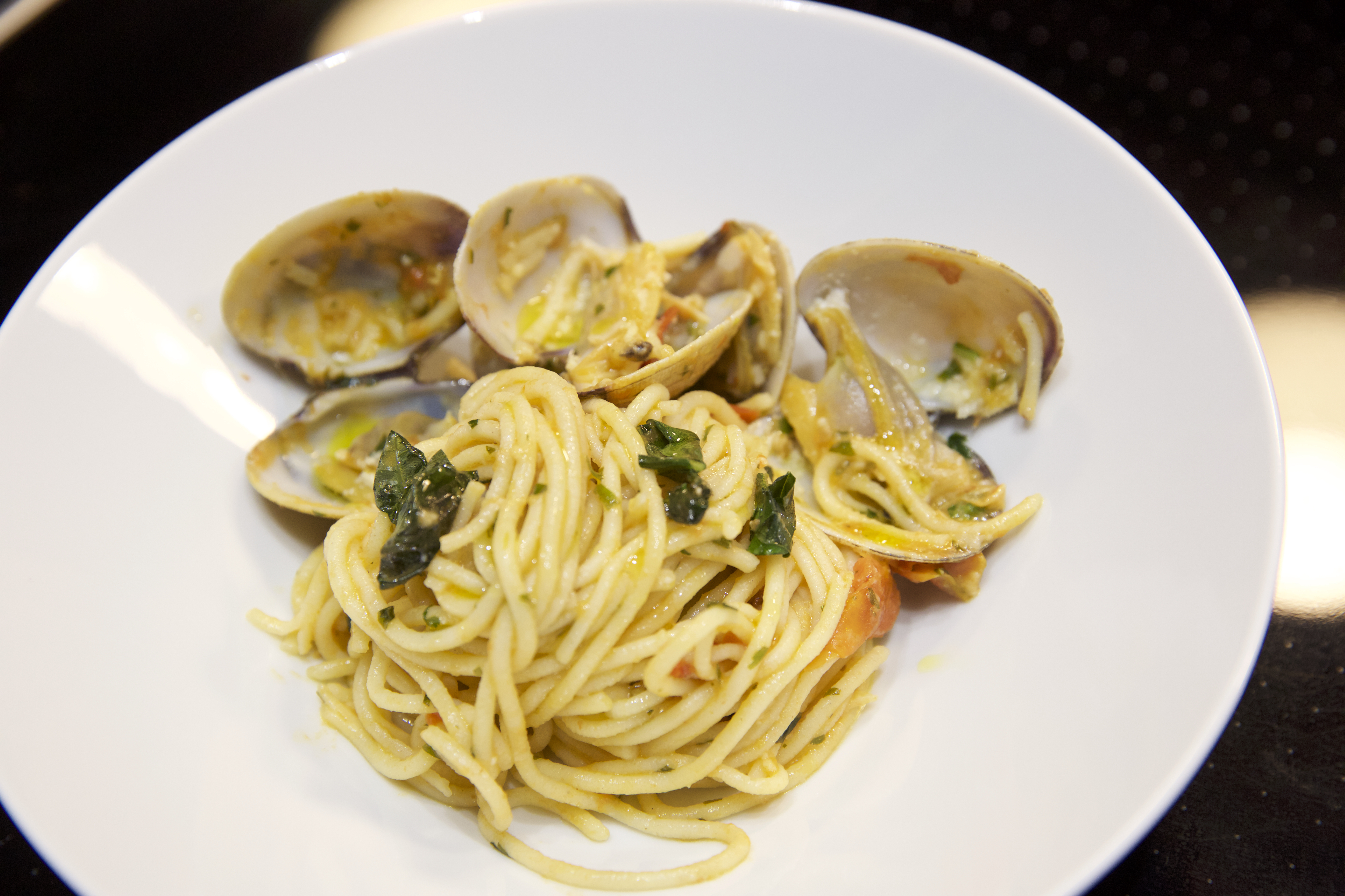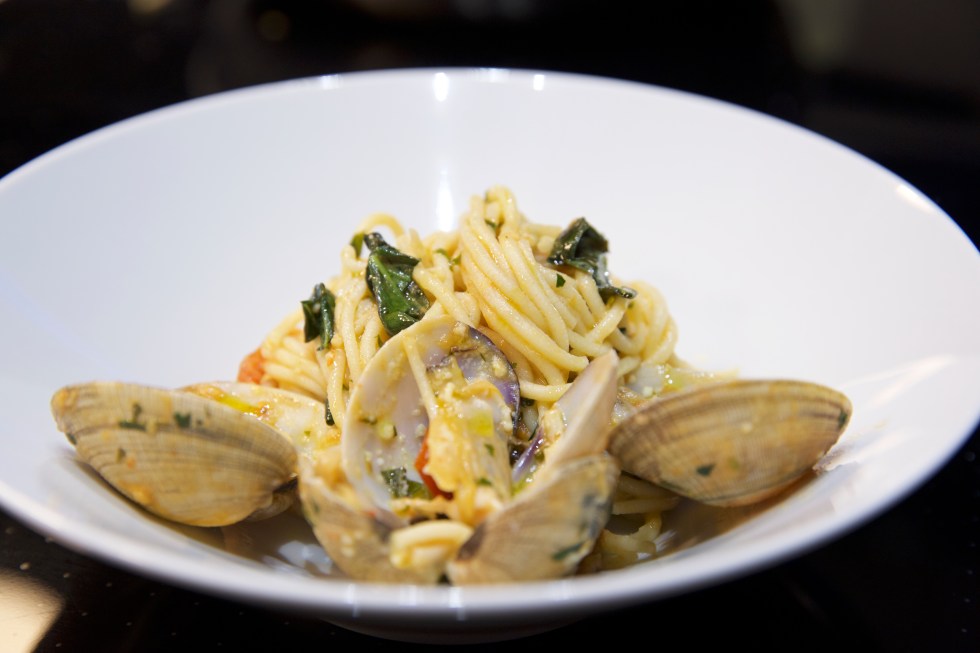 Cuando el agua está consumida, echamos el vino blanco y lo dejamos en ebullición hasta que esté casi seco. En ese momento, echamos las almejas, tapamos, a fuego medio, y vamos controlando pero en 2-3 minutos están abiertas, vamos moviendo la sartén para que pasen las de abajo arriba y todas estén por igual. En este punto, la pasta debería de estar ya, la escurrimos y la echamos encima, los movemos con la propia sartén sin utilizar paleta o cuchara, salvo que no se sepa hacer de otra manera, rectificamos de sal, le echamos pimienta, las hojas de albahaca enteras o troceadas por encima y lo servimos en el plato.