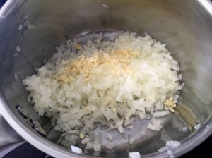 A continuación, ponemos un poco de aceite en un sartén o cazuela pequeña, echamos la cebolla picada con el ajo, una pizca de sal y la dejamos pochar.