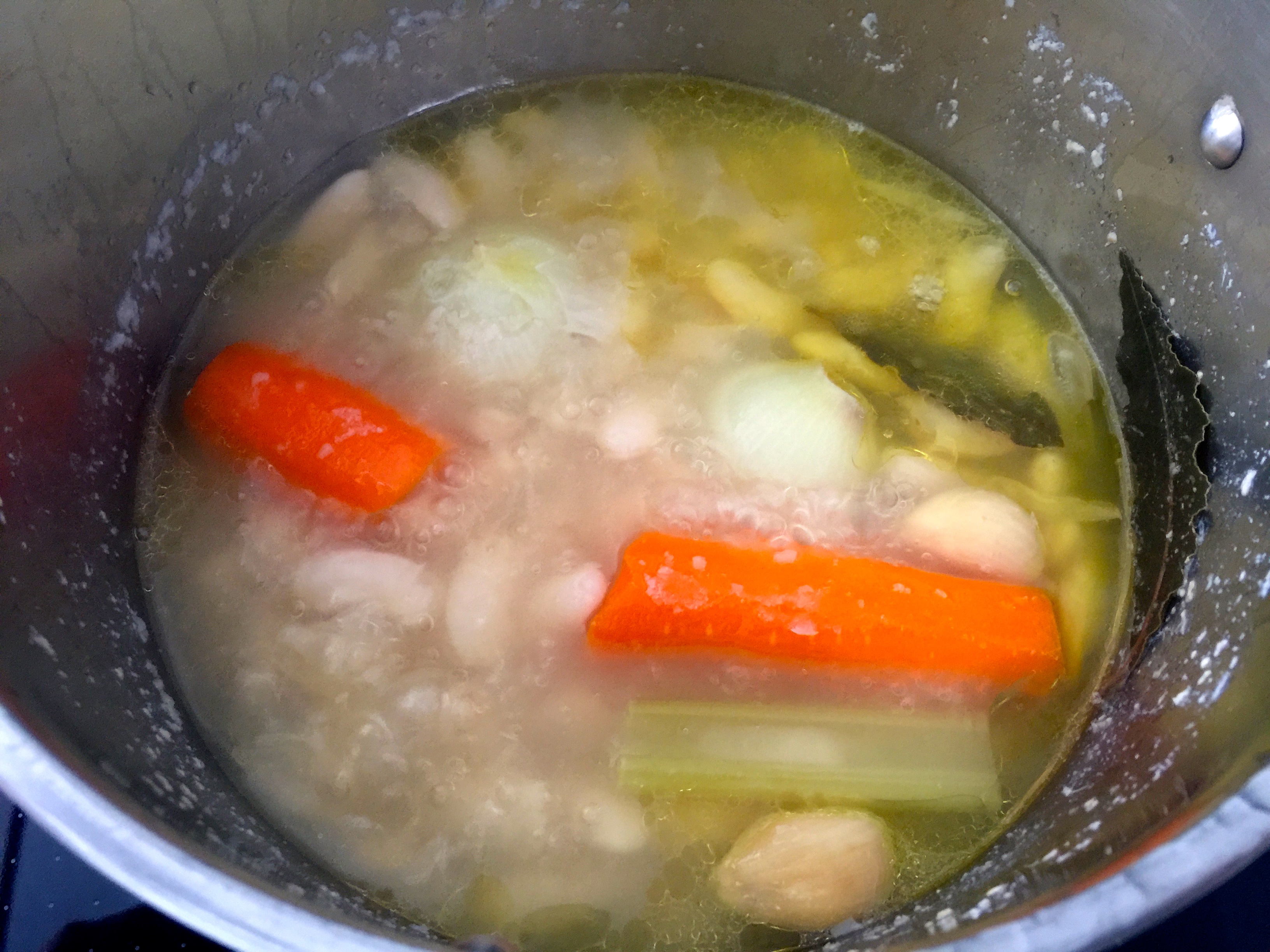 Cuando comience a hervir de nuevo, una vez espante las fabes, incorporo el ajo y las cebollas enteras, la zanahoria partida en dos y el tallo de apio, todo entero porque he de recuperarlo una vez cocidas las fabes, también le pongo una pizca de sal, lo llevo a ebullición y bajo el fuego para que se cuezan lentamente. A partir de este momento, nunca meteremos la cuchara ni nada que se parezca, lo moveremos siempre con movimientos de la cazuela, de esa manera evitamos que se rompan las fabes, sobre todo a partir de la mitad de la cocción que tardará una hora y media al menos, si bien se puede hacer también en una olla a presión y se reducirá el tiempo a una tercera parte.