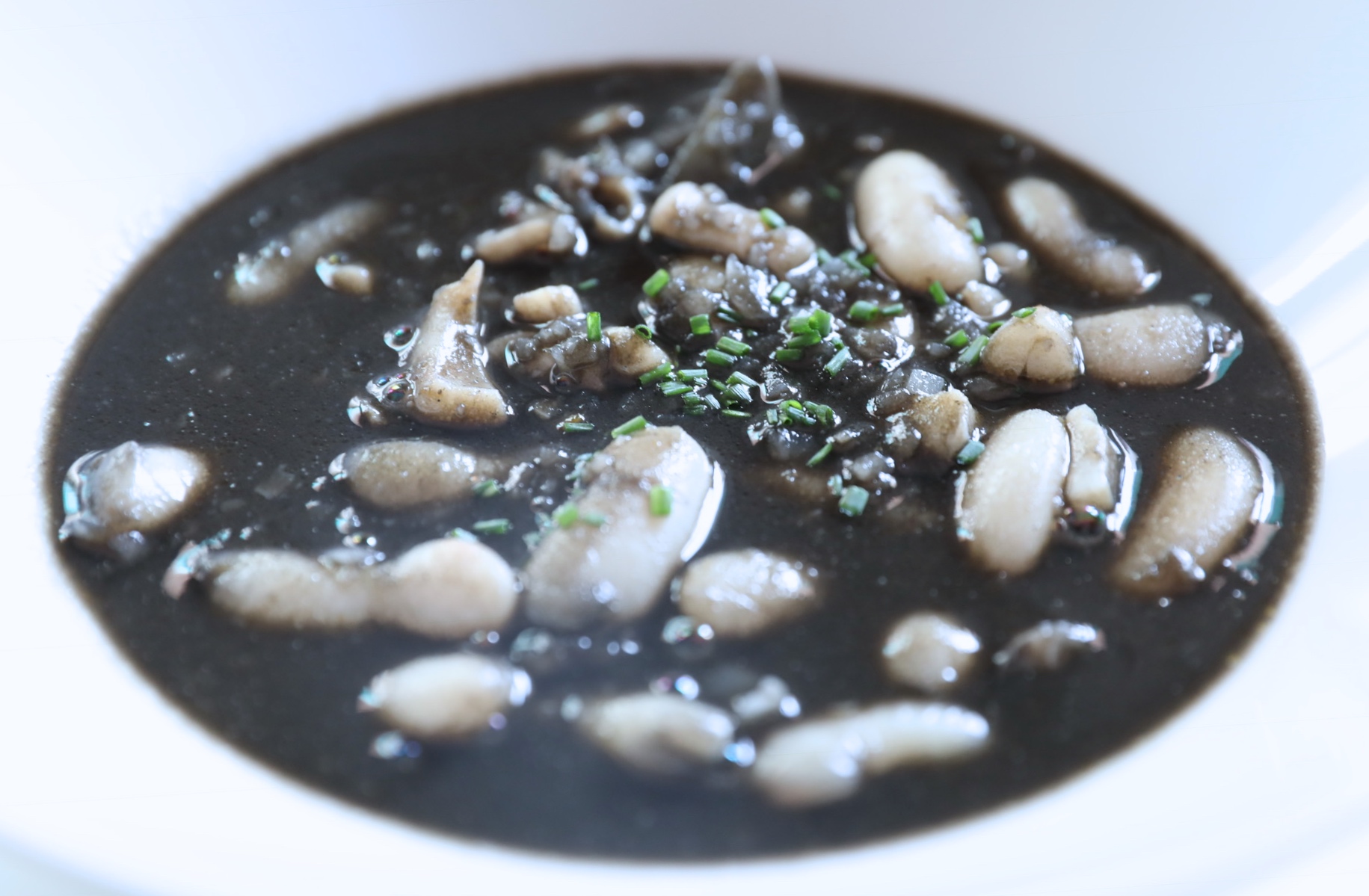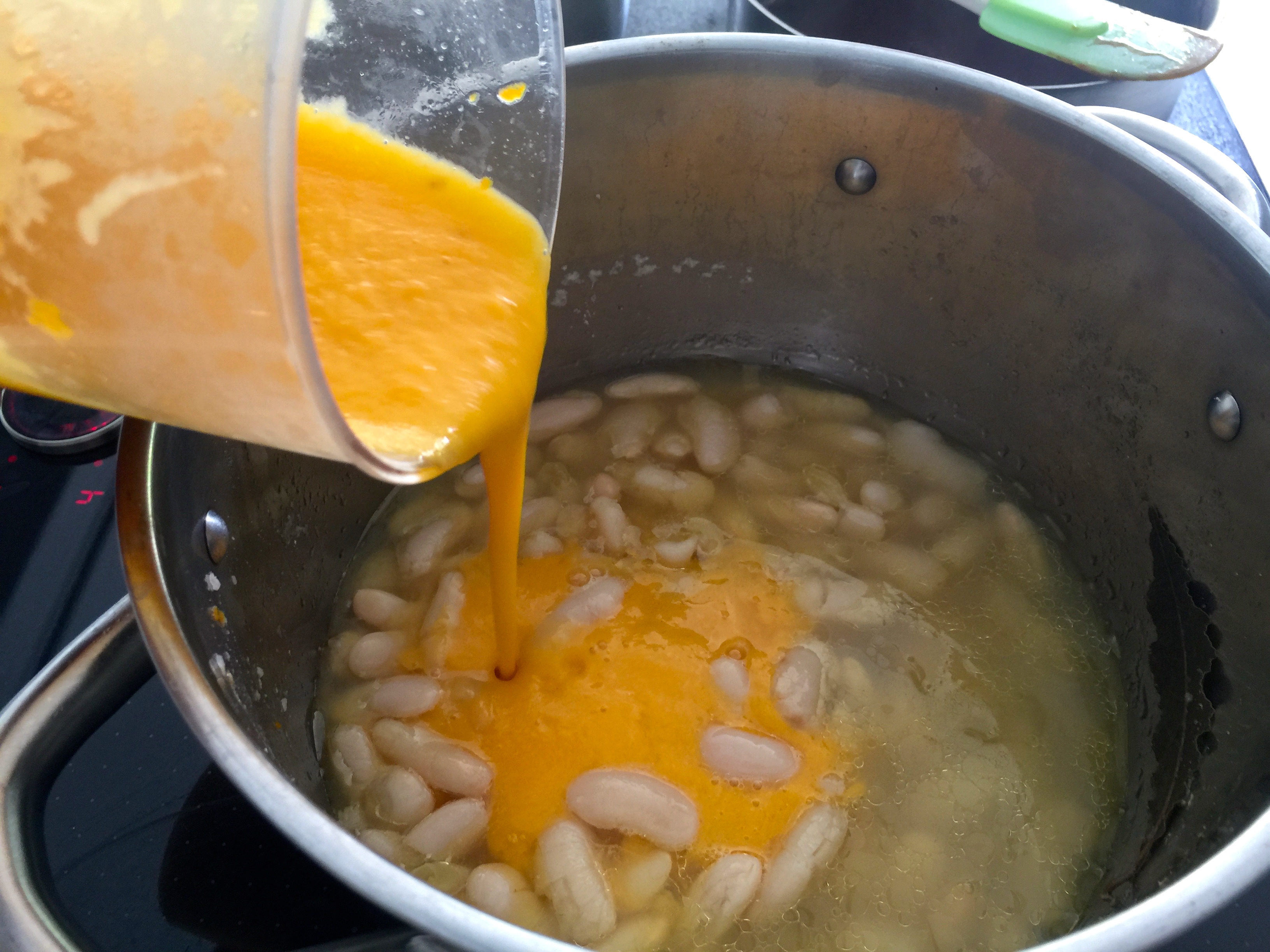 En este momento, las fabes ya están tiernas, sacamos las cebollas, la zanahoria, el apio, el ajo y el laurel y este último lo tiramos. Todo ello lo ponemos en un recipiente con algo del líquido de la cocción y lo trituramos echándolo de nuevo en las fabes, movemos sin remover para que se mezcle todo, le incorporamos los calamares, movemos de nuevo, rectificamos de sal y lo dejamos al fuego un par de minutos.