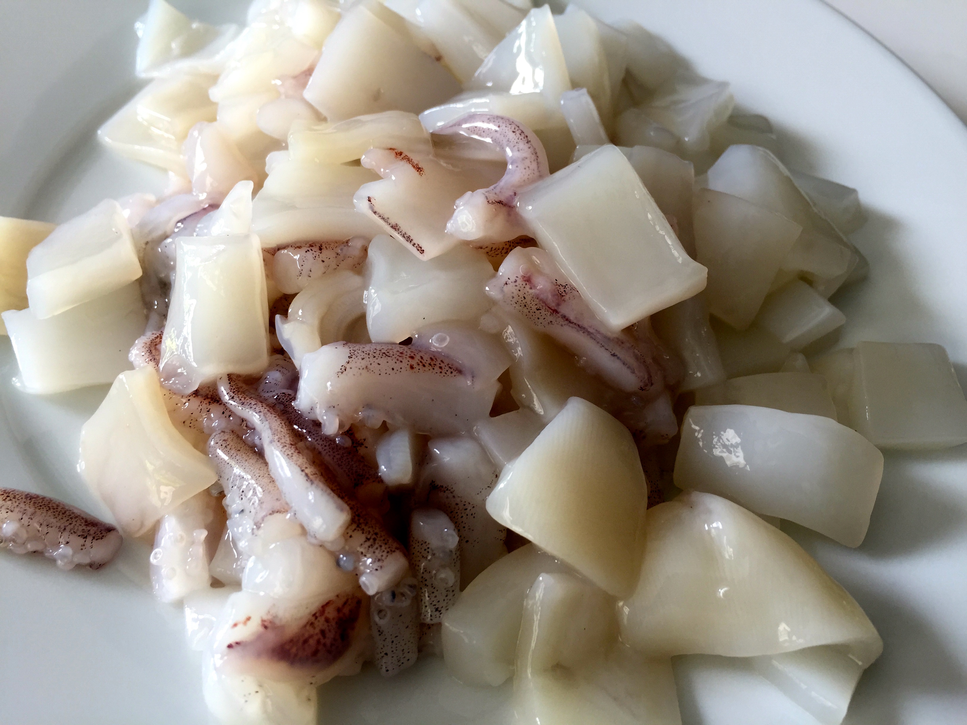 Seguidamente, sacamos el calamar, que limpiaremos si aún no lo hemos hecho, y cortaremos en trozos pequeños, aproximadamente del tamaño de una fabe. Reservamos.