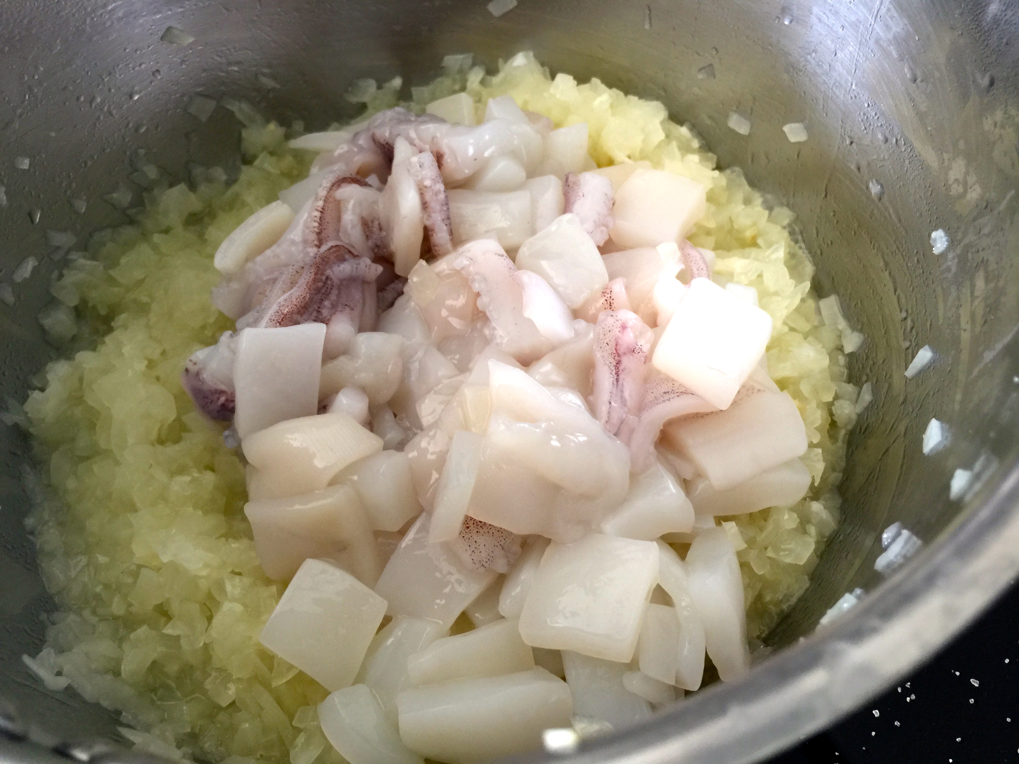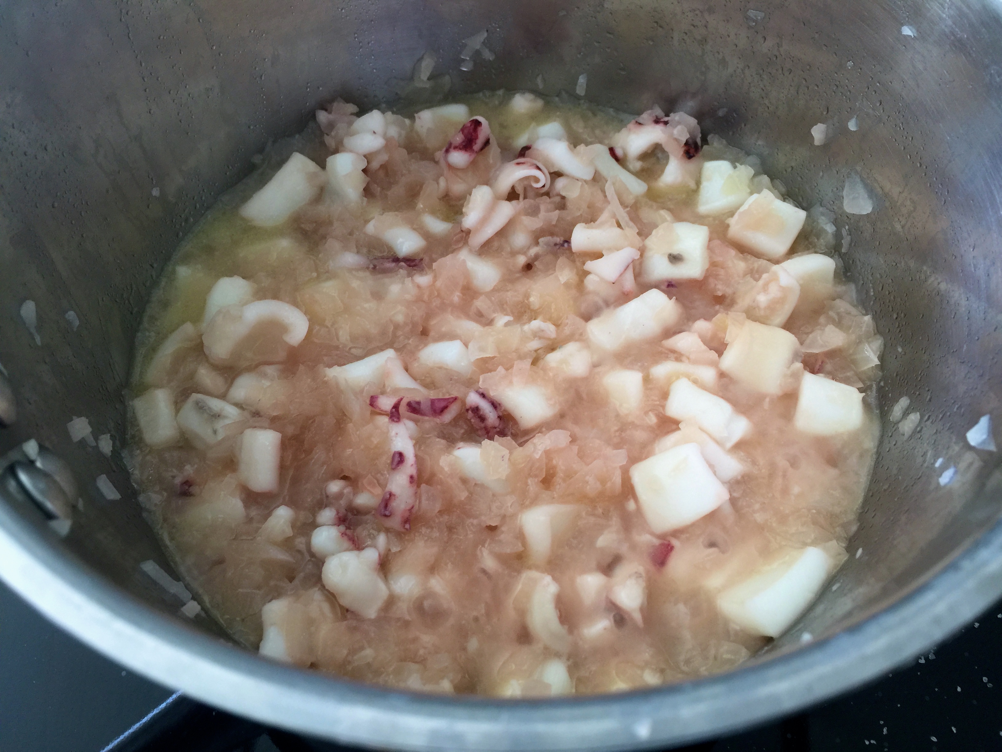 Una vez pochada, añadimos el vino blanco que dejaremos que evapore casi totalmente, en ese momento incorporamos los trozos de calamar, lo llevamos a ebullición, bajamos el fuego y tapamos cociendo lentamente. Así estará durante veinte minutos.
