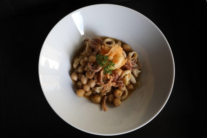 Incorporamos el resto de los chipirones cortados en anillas, le damos un par de vueltas y los echamos en los garbanzos, le añadimos el perejil picado, lo dejamos cociendo a fuego lento durante diez minutos, no más, para que no nos queden duros los chipirones y rectificamos de sal y pimienta.