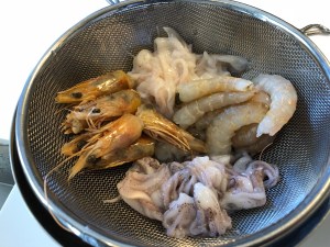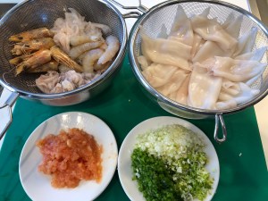 A continuación, pelamos los langostinos, reservamos las cabezas, limpiamos la tripa y guardamos filmadas las colas. Por otra parte, tenemos los chipirones ya limpios, sin tripa, separados los cuerpos de las aletas y las patitas y los ponemos a escurrir bien. Seguidamente, picamos la cebolla y el pimiento, pelamos, despepitamos y picamos el tomate, picamos el perejil y reservamos.