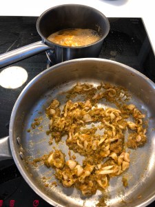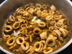 Incorporamos entonces aletas y recortes de los chipirones, salteamos un poco y añadimos el agua de la cocción de las cabezas y lo dejamos hasta casi evaporar del todo.