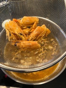 Posteriormente, en una sartén del tamaño adecuado, ponemos un poco de aceite de oliva, echamos las cabezas de los langostinos y las salteamos, aplastándolas para que suelten todo su sabor, las sacamos y las ponemos en un cazo pequeño con agua de cocción de los garbanzos para que cuezan. Una vez cocidas a fuego bajo durante un rato, colamos y reservamos el líquido.