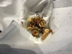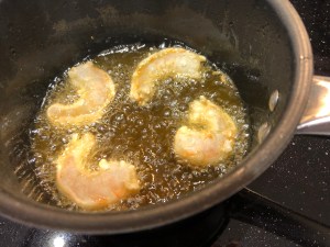 Finalmente, sacamos las patitas y los cuerpos de los langostinos, los enharinamos y eliminamos bien el resto de harina porque no es un rebozado, los echaos en una sartén con aceite muy caliente, prácticamente entrar y salir, los ponemos sobre un papel de cocina para que escurran y les echamos una pizca de sal.